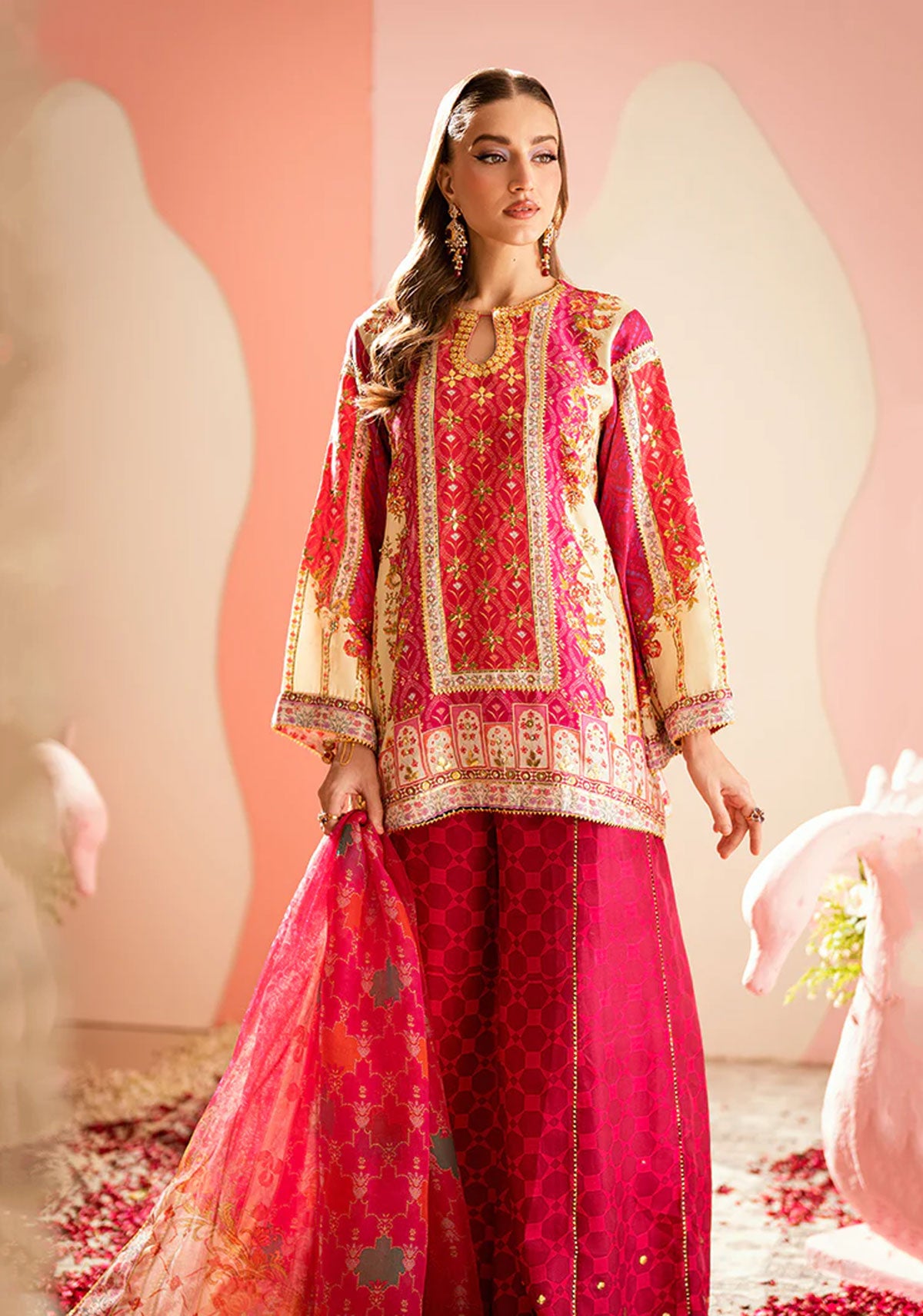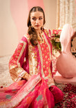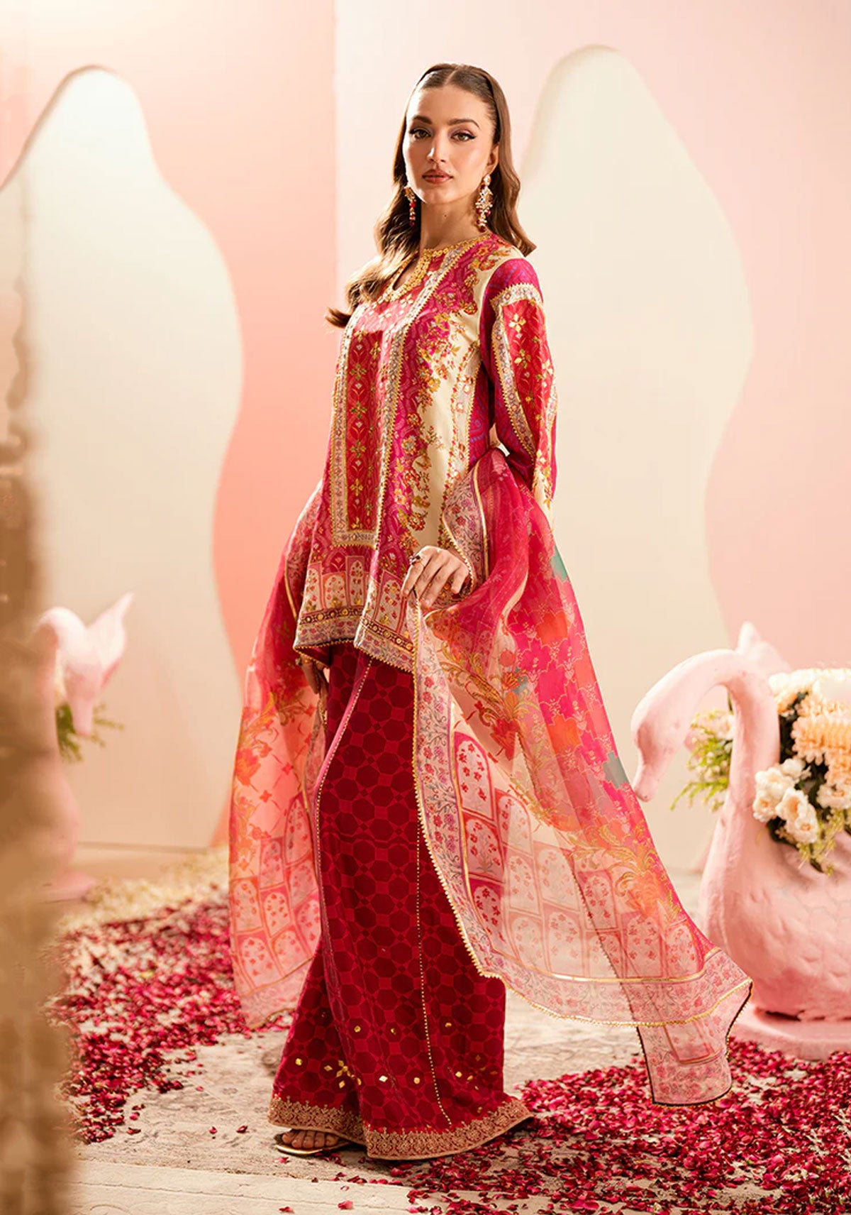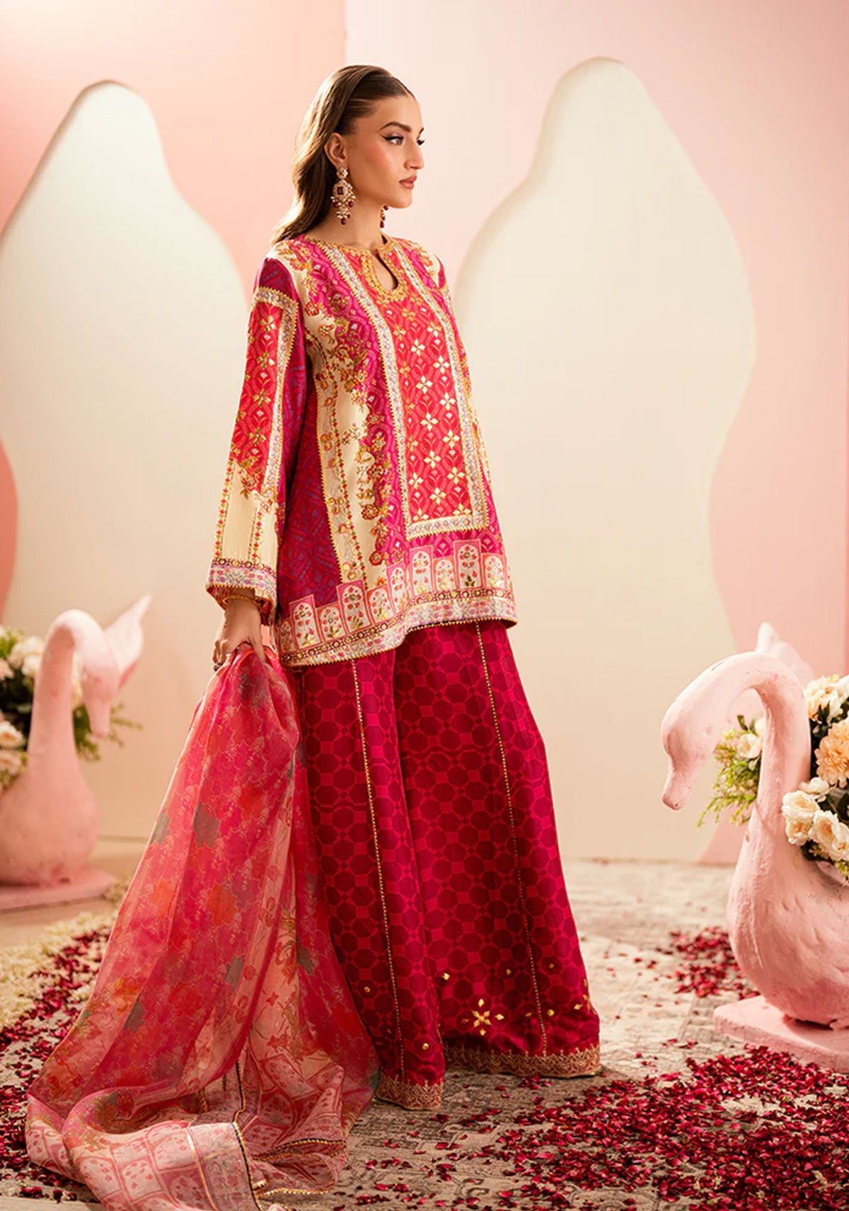 A mesmerizing play of tradition and modernity, this Sarah Sheeraz ensemble features a beautifully printed short shirt adorned with exquisite zari and gota detailing that glimmers with every movement. Paired with matching plazo pants, crafted to perfection with the same intricate accents, the look exudes effortless grace and festive charm. Completing the outfit is a pure organza printed dupatta, delicately finished with gota edging, adding a hint of ethereal allure. A statement in refined elegance, this design captures the essence of timeless celebration with a contemporary twist.