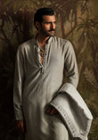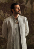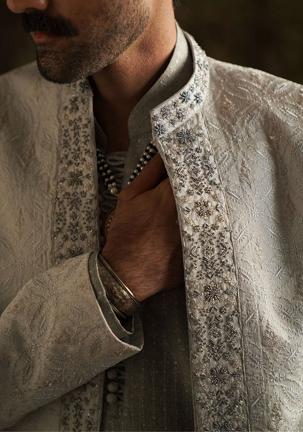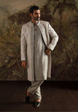 'Ice grey open sherwani with all over embroidered pattern, adorned with Cyrus tree motif with tilla and resham renderings. Add a work band and front border.