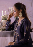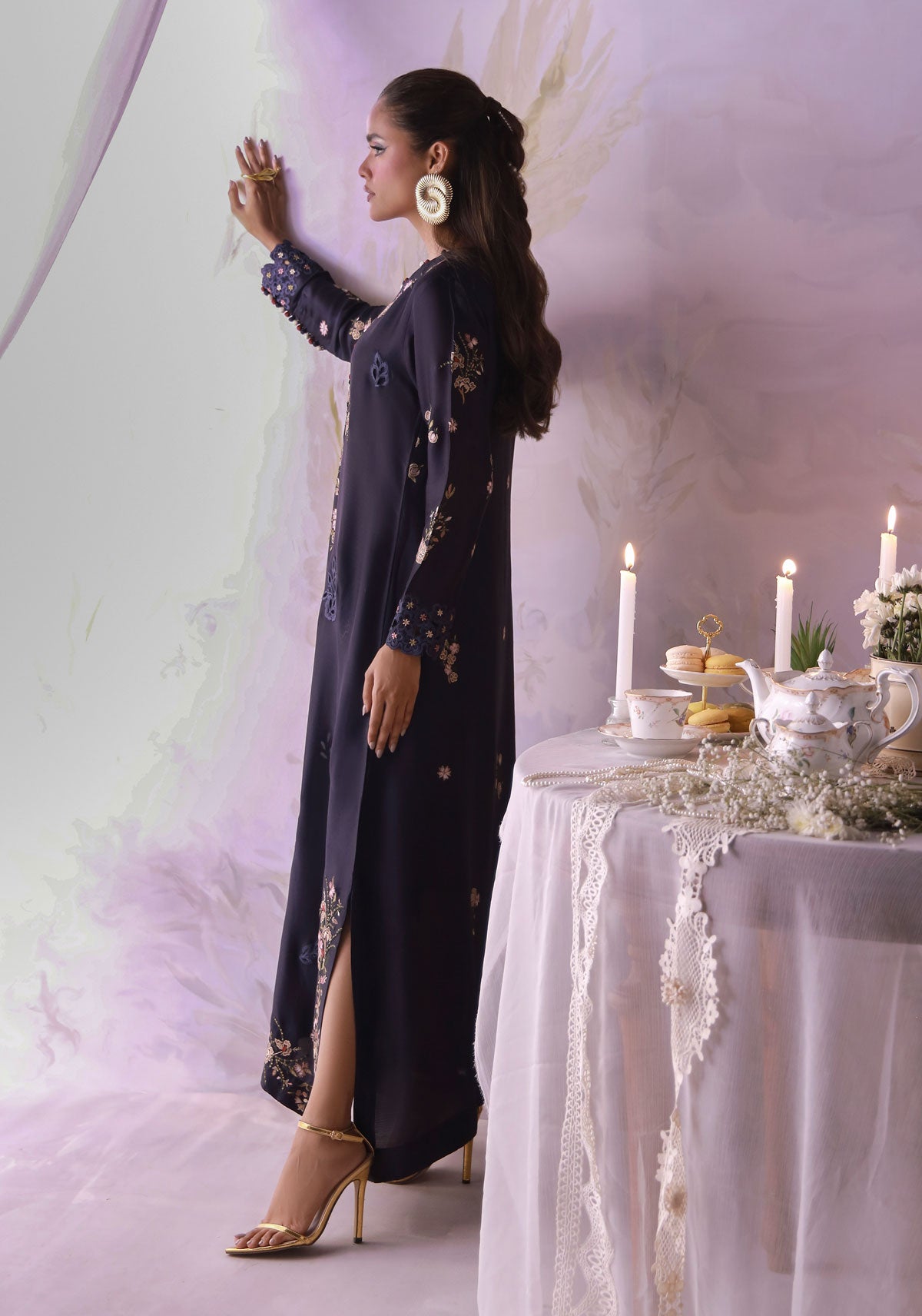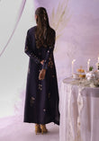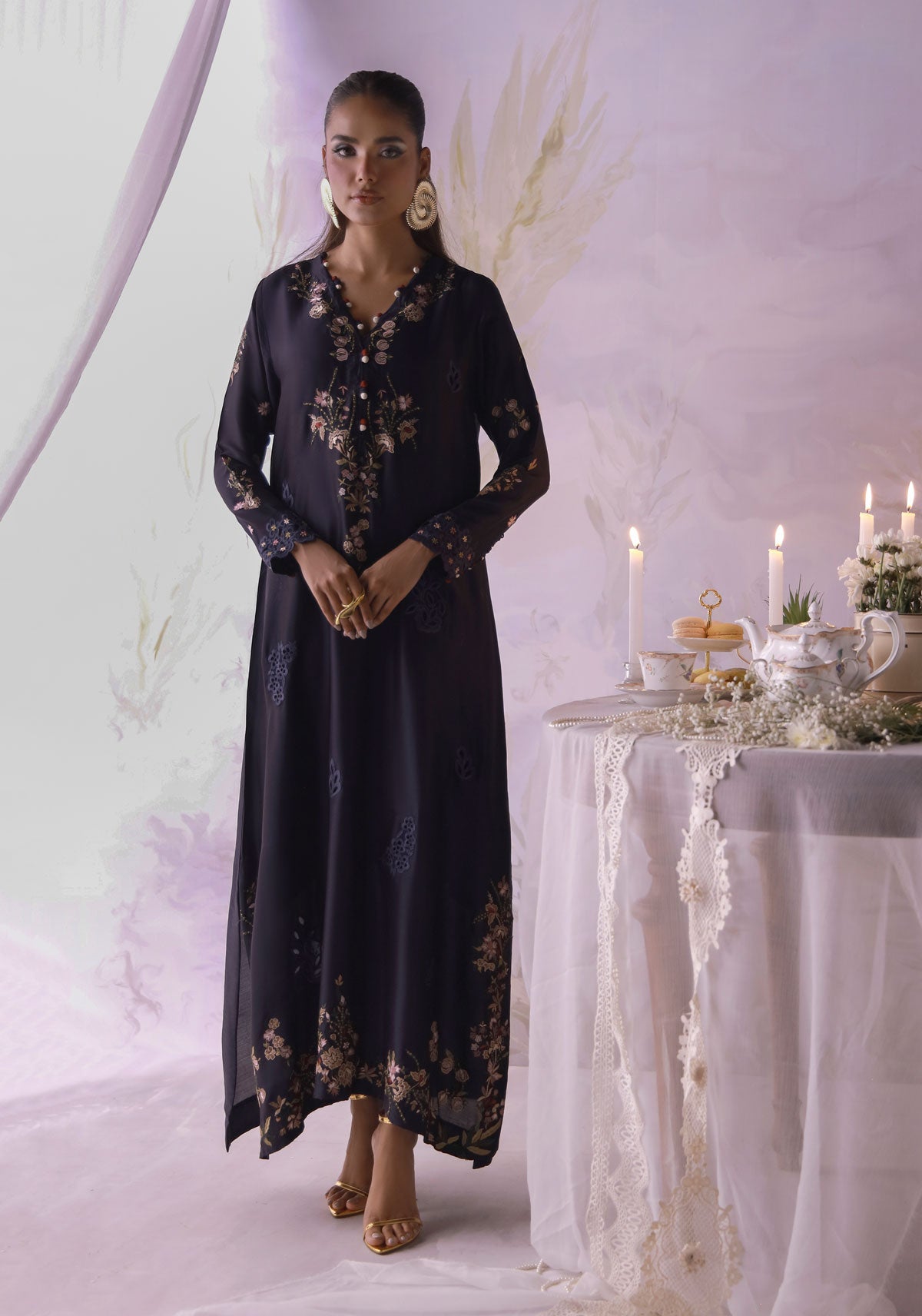 A midnight floral classic reimagined. Crafted in pure butter silk with delicate floral embroidery, handmade buttons along the neckline, and cutwork detailing on the sleeves. A silhouette that flows with quiet grace, speaking effortless charm and timeless elegance.