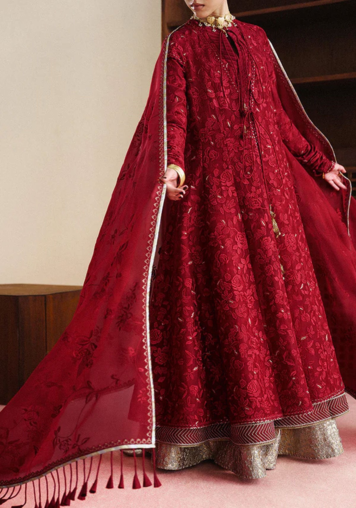 - Fire red, double-layered (raw silk underlayer, organza overshirt) with embroidery, lace, and gold contrasts. Undershirt has churidar sleeves, overshirt has cape sleeves.
