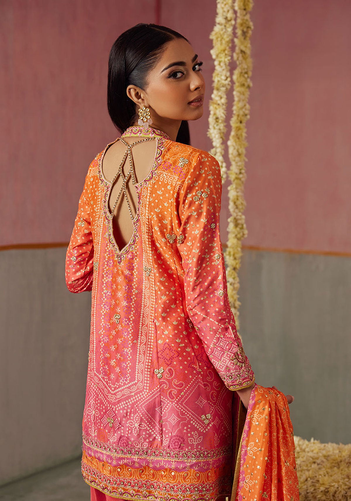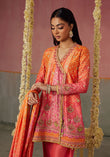 A celebration of bold glamour, this pure raw silk ensemble channels modern oomph with ease. The shirt and dupatta are given a stunning ombre treatment as a zingy tangerine hue flows smoothly into a charming watermelon hue.
