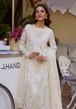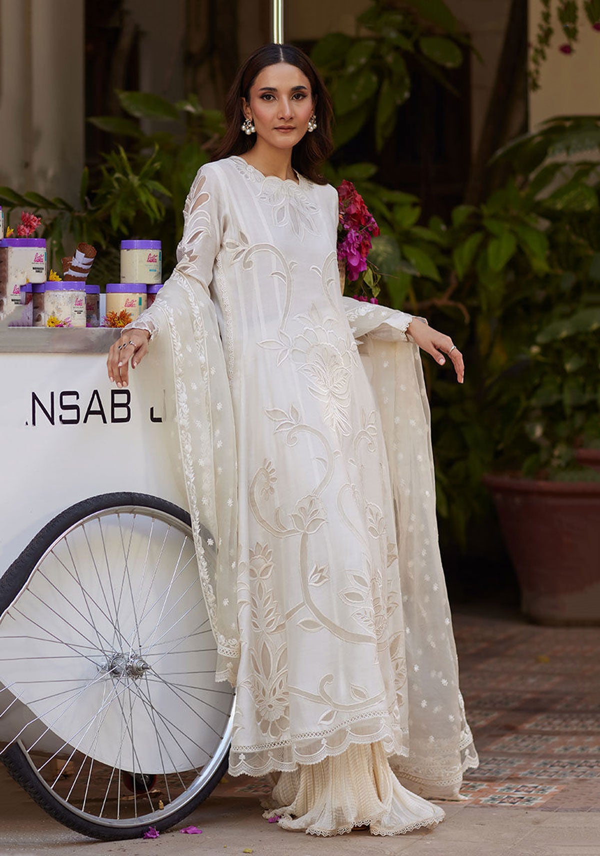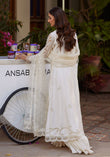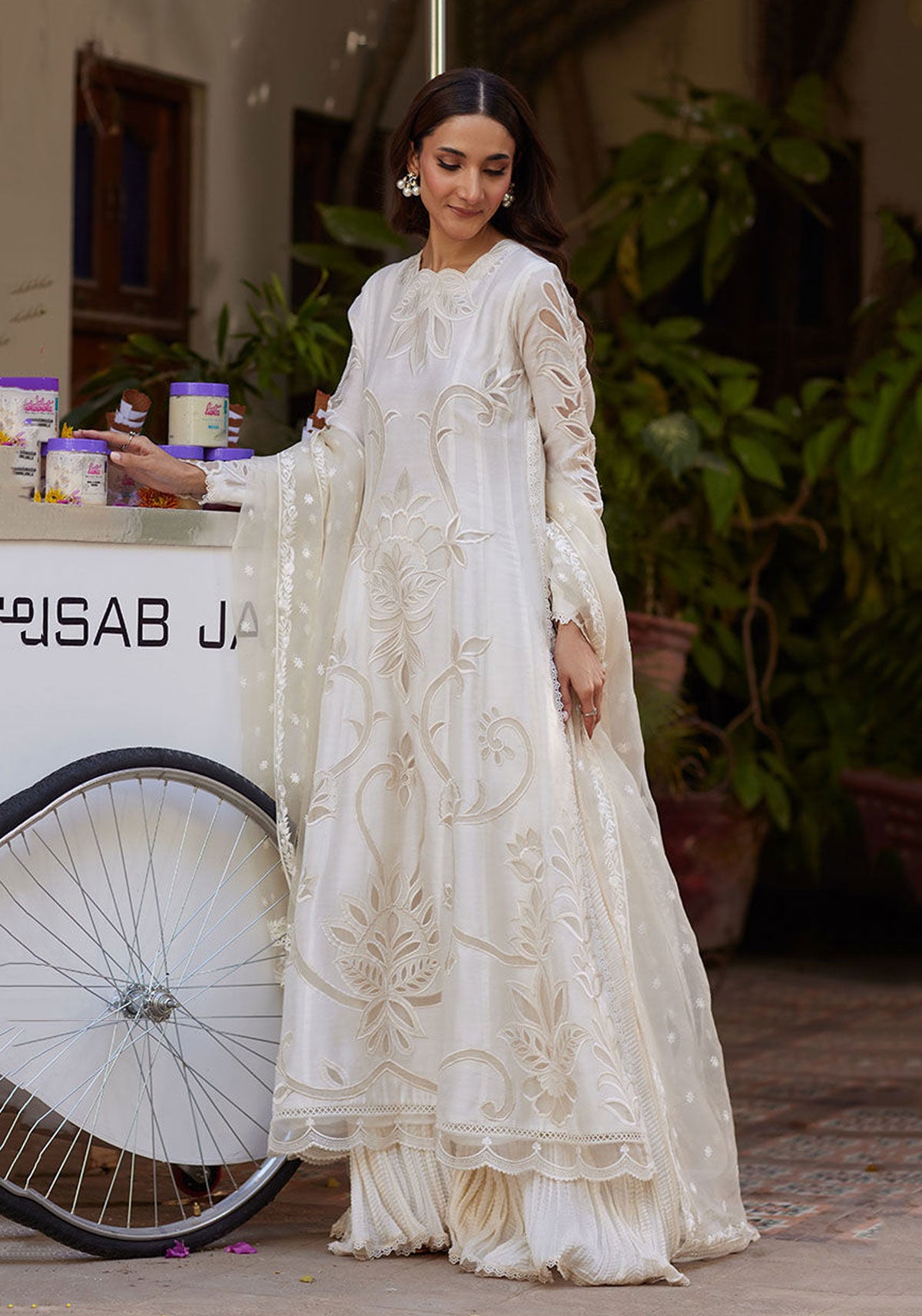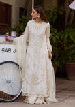A pristine white-on-white kalidaar, featuring exquisite organza and resham applique detailing for a truly refined look. Paired with an intricately embroidered organza dupatta, and complemented by crushed dhaaka for an elegant, textured finish.