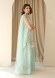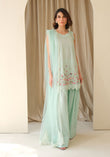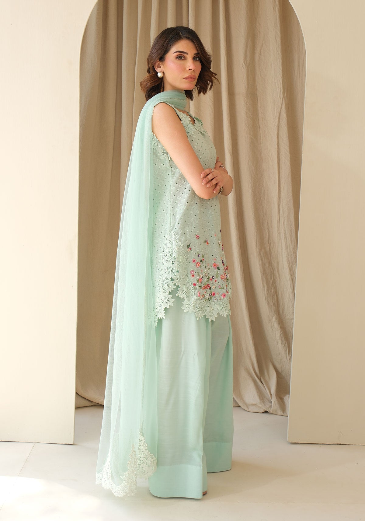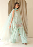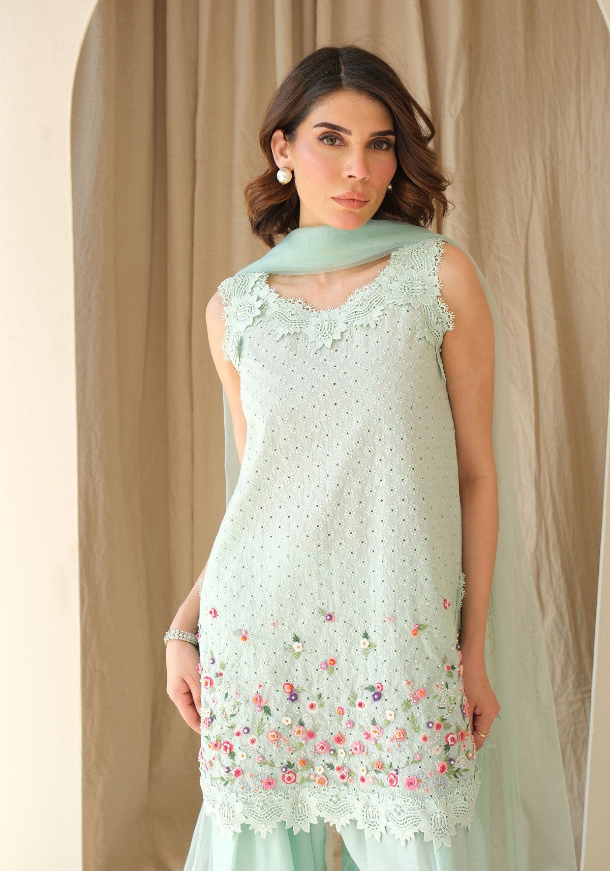 A pastel aqua cotton eyelet set with the most intricate hand-embroidered French knot florals scattered along the hem. Comes with a scalloped lace net dupata and elvish farshi shalwar for graceful, easy elegance.