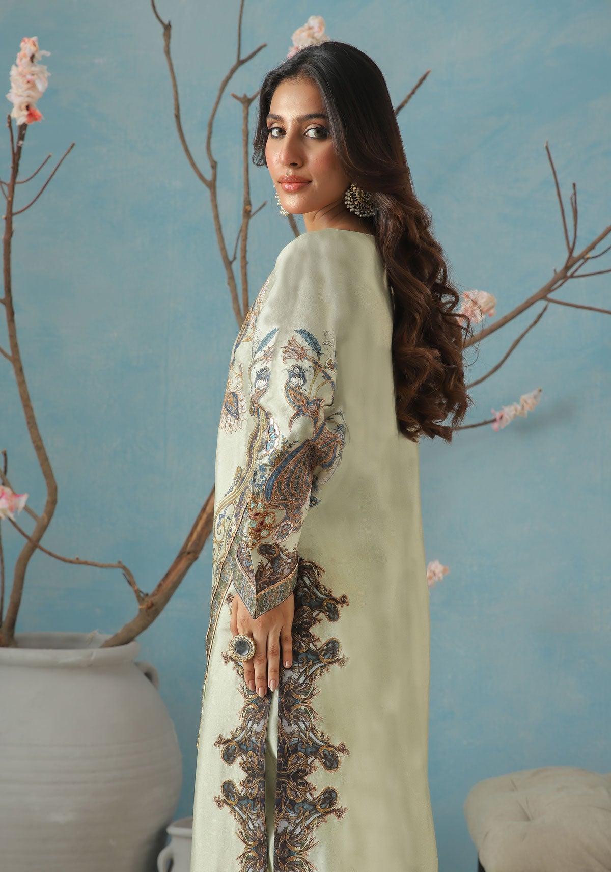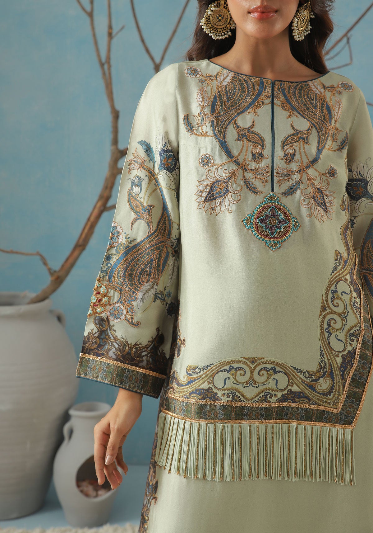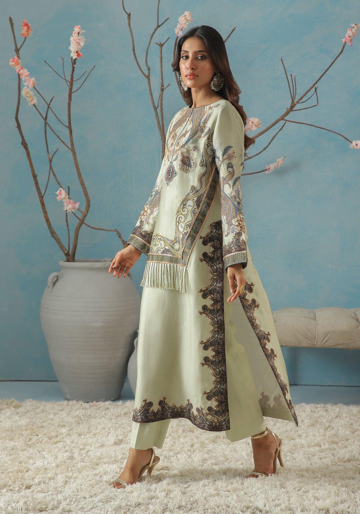 This look is a soft and graceful expression of vintage-inspired eastern luxury, with intricate details and refined color play. A sage green long straight kurta crafted from a silky, flowy fabric. It features a tapestry-style digital print with baroque and paisley motifs in shades of rust, antique gold, and navy. The neckline is modest with an embellished medallion-like centerpiece, while the hem is finished with an elegant fringe detail that adds movement and charm. Full-length sleeves showcase ornate, mirror-symmetrical artwork in warm tones, giving it a regal, almost Kashmiri feel. Borders on the hem and sides of the shirt enhance its classic silhouette. It comes with a coordinated straight pants in matching sage green keep the look minimal and polished.