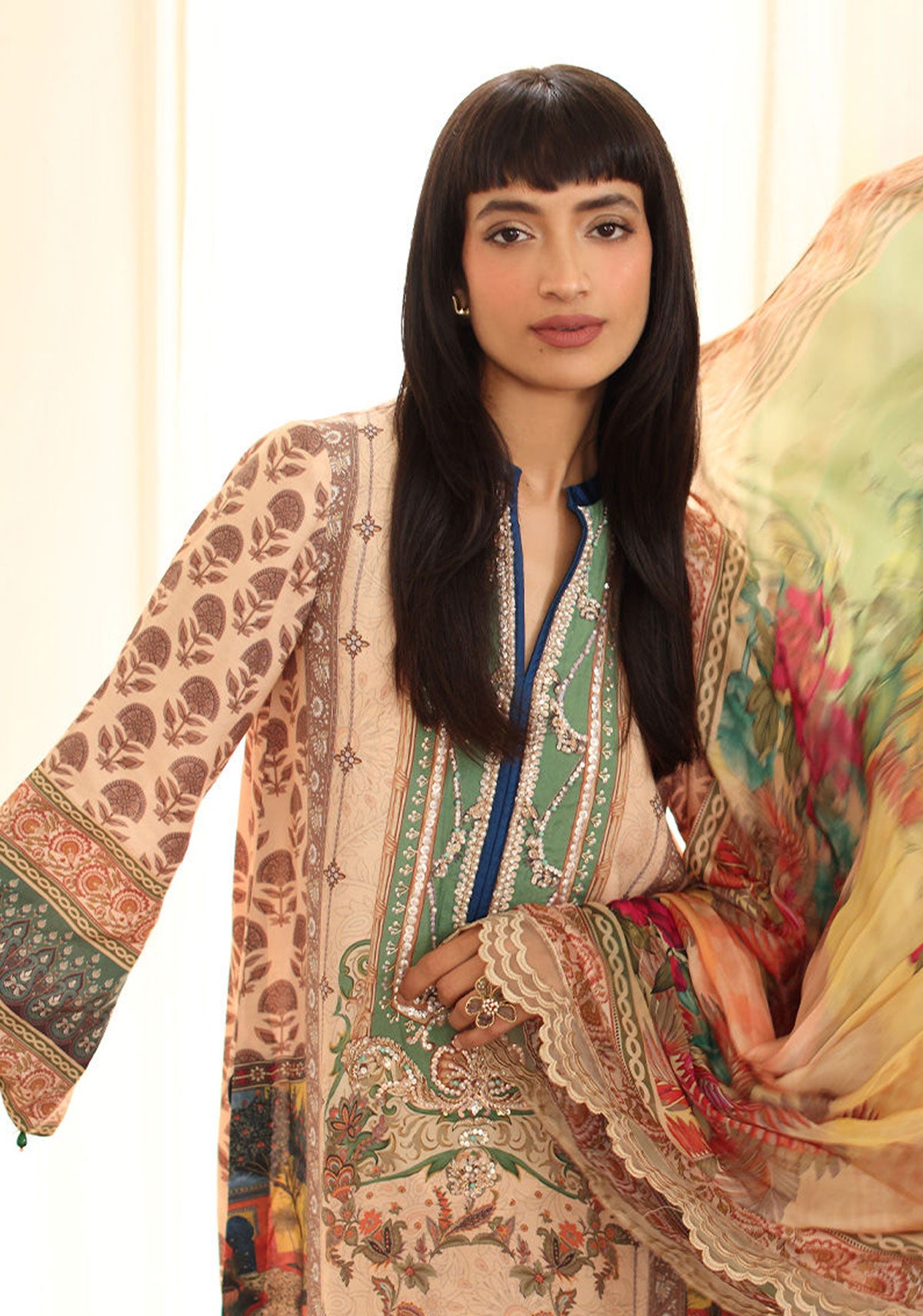 Beige silk shirt and Korean silk trousers complemented by a pure medium silk dupatta, finished with embroidered and printed detailing.