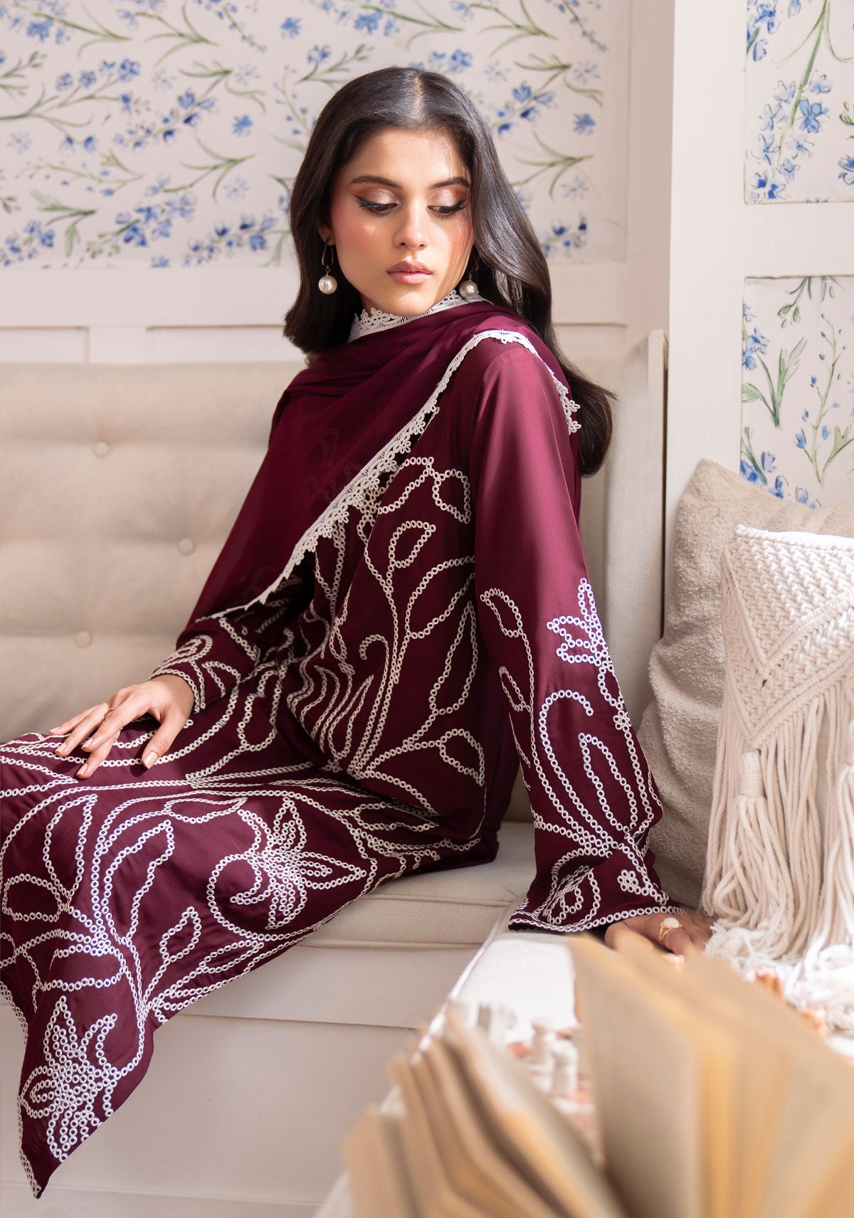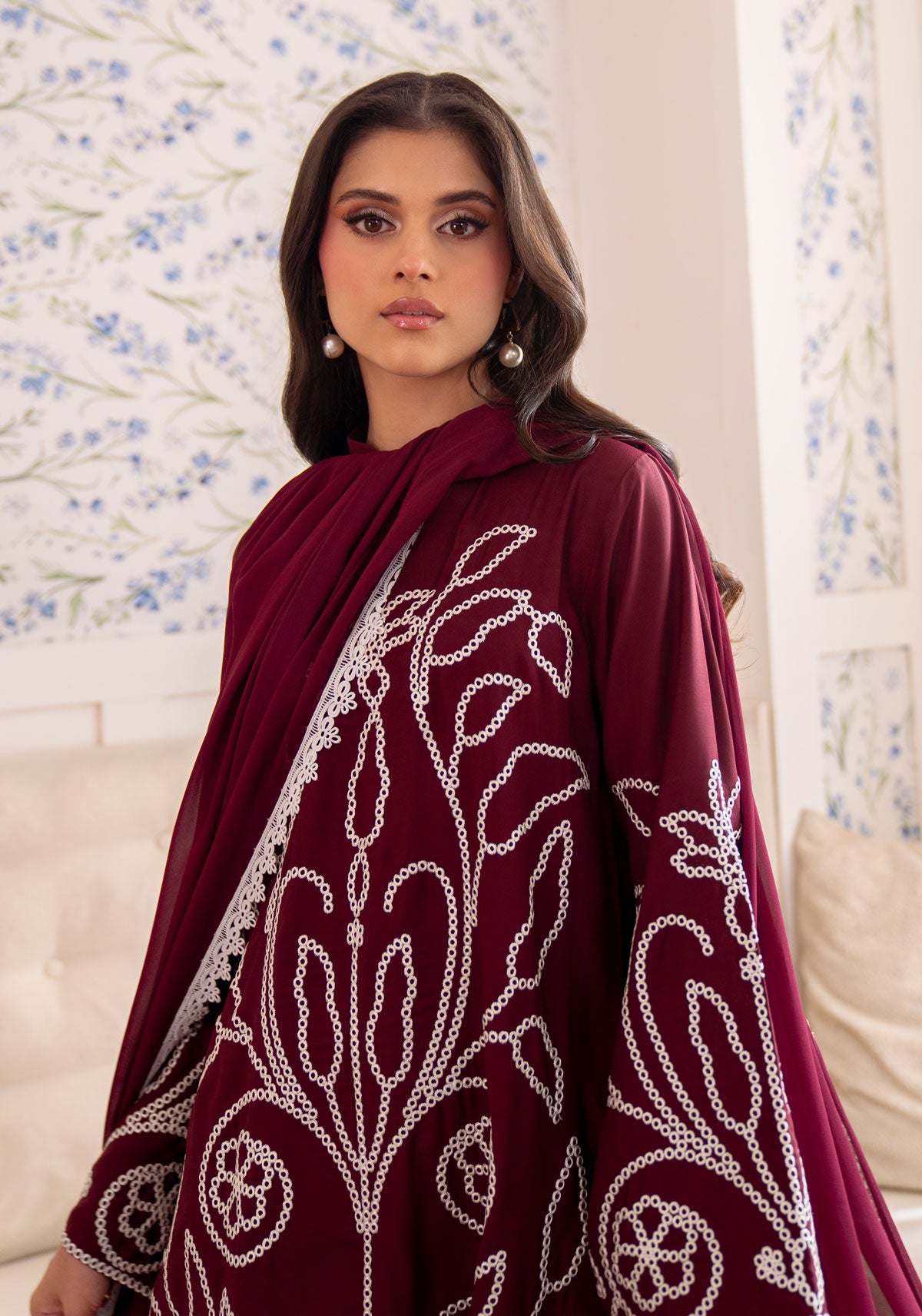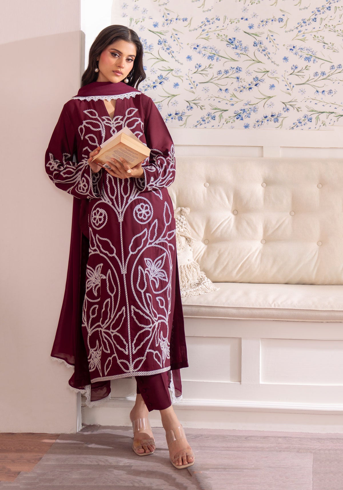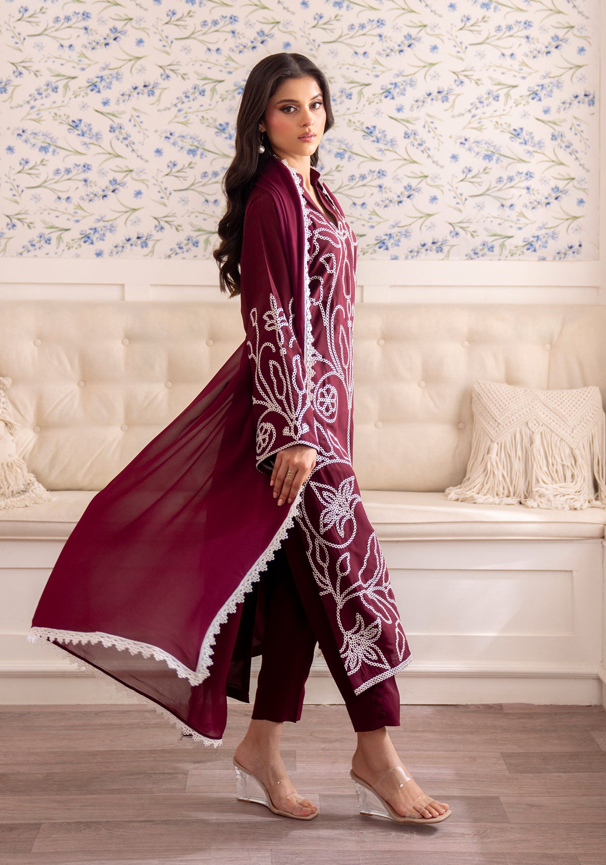 'The perfect staple in your wardrobe! Set against a saturated deep maroon canvas adorned with floral embroidery- featuring cascading vines accented with little blossoms in a bold pearl white. Paired with a straight leg trouser and chiffon dupatta with a lace finish- This ensemble is the embodiment of feminine glamour.