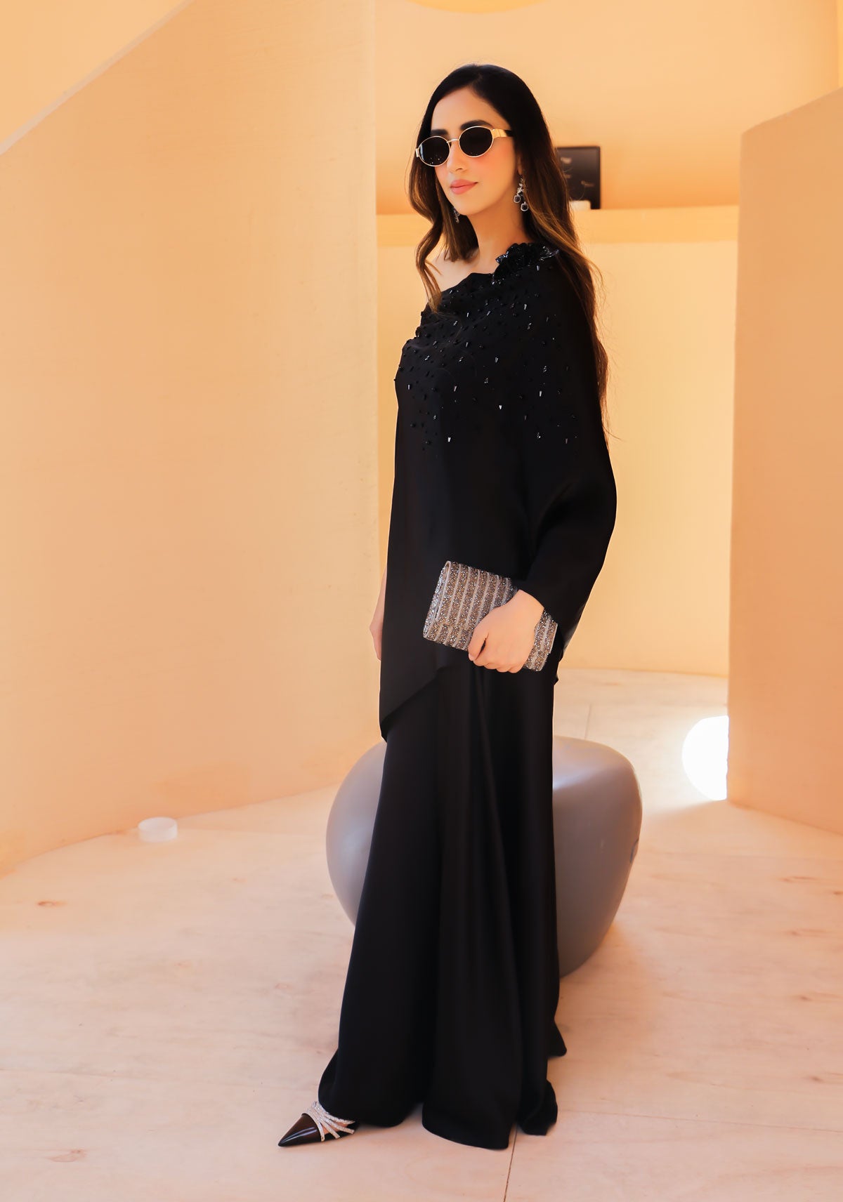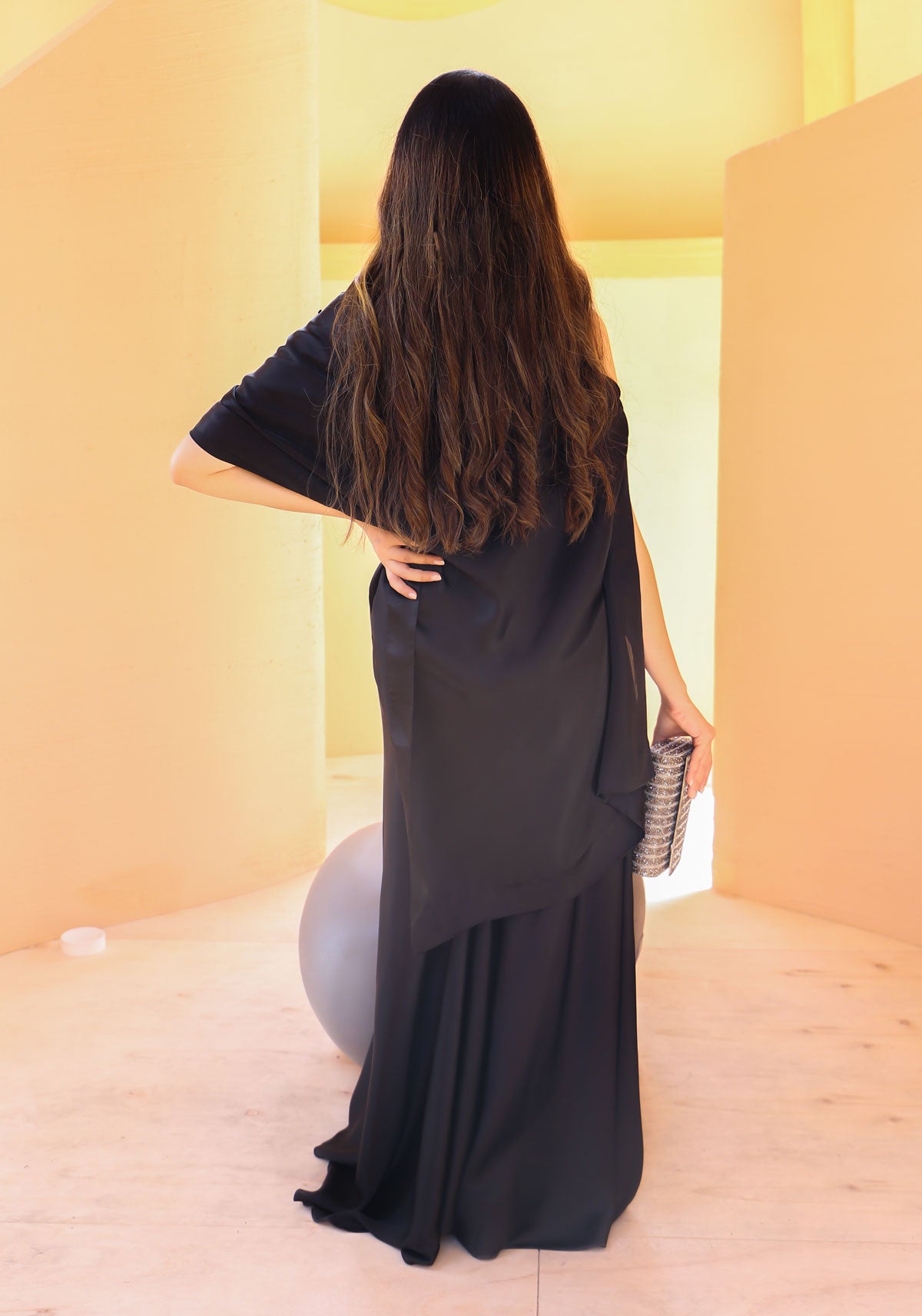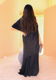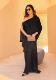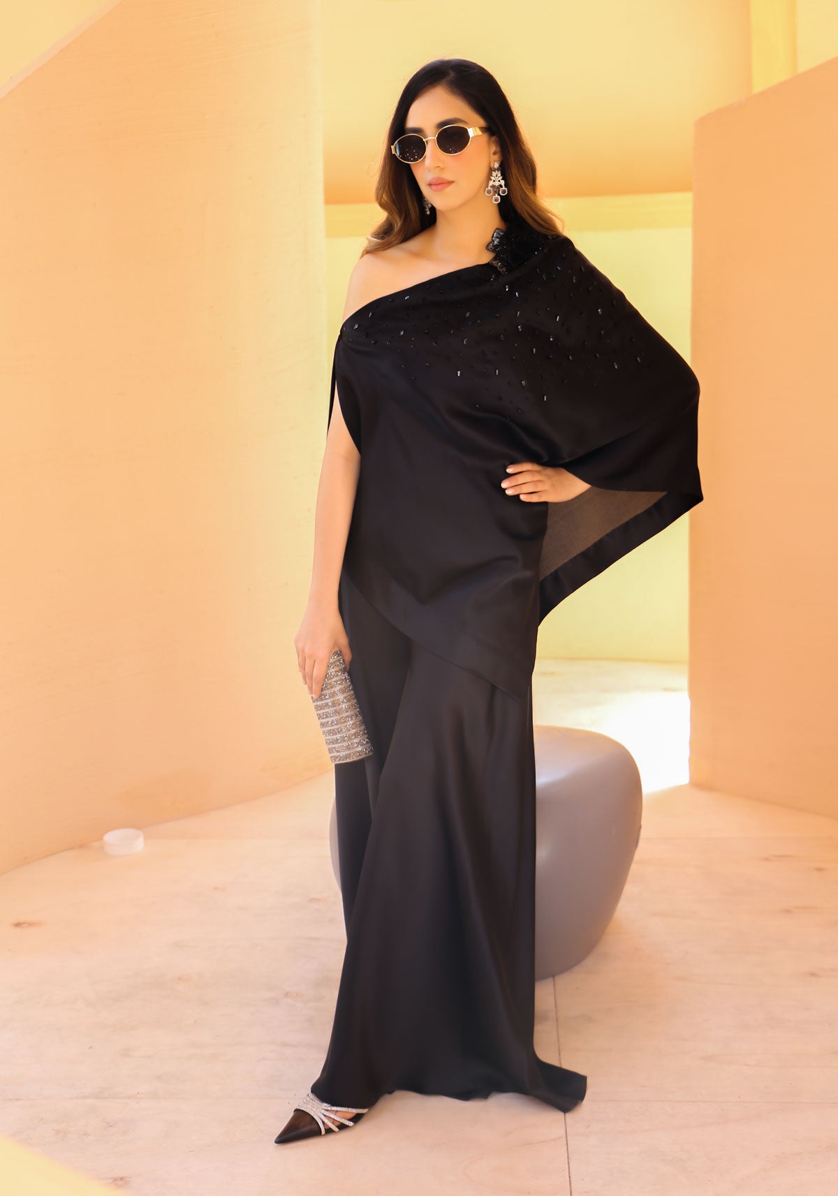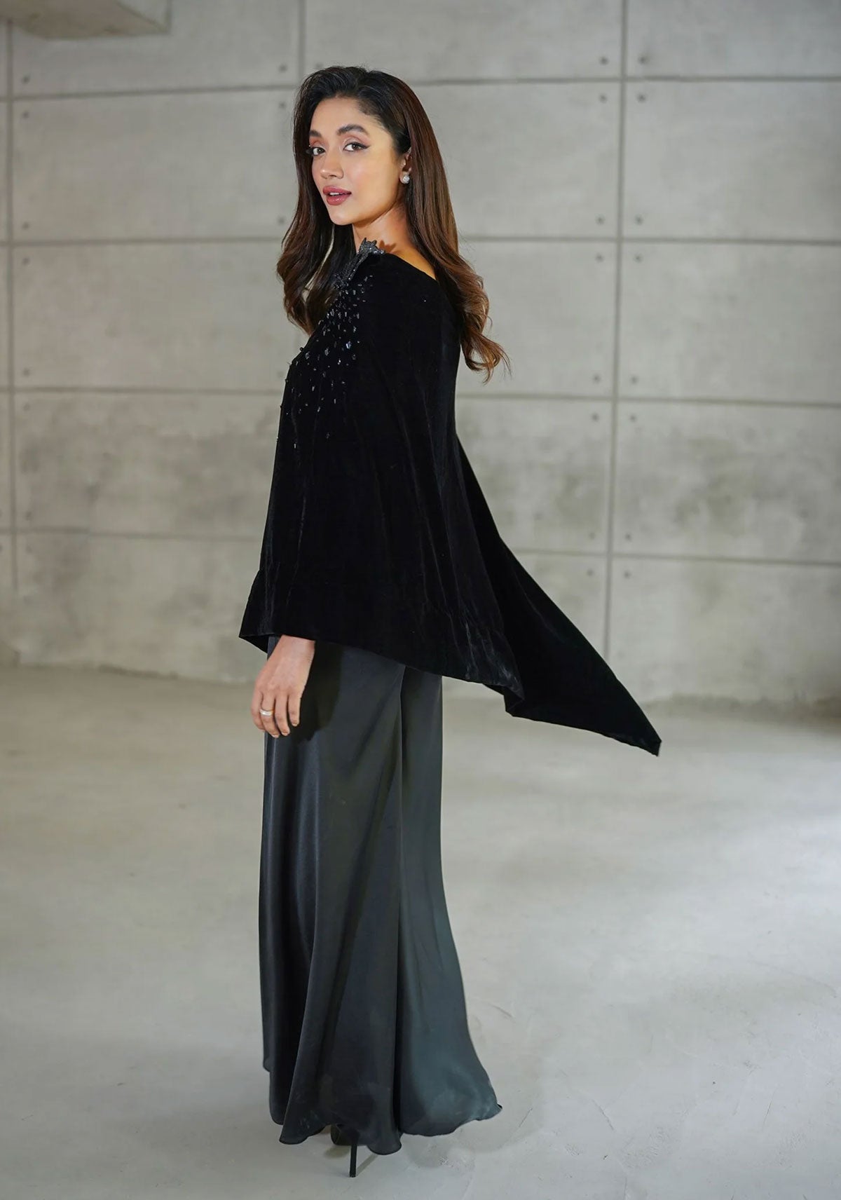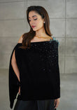 Our iconic wrap cape in classic ebony silk accentuated with hand-worked floral and sequins detailing is a statement piece.