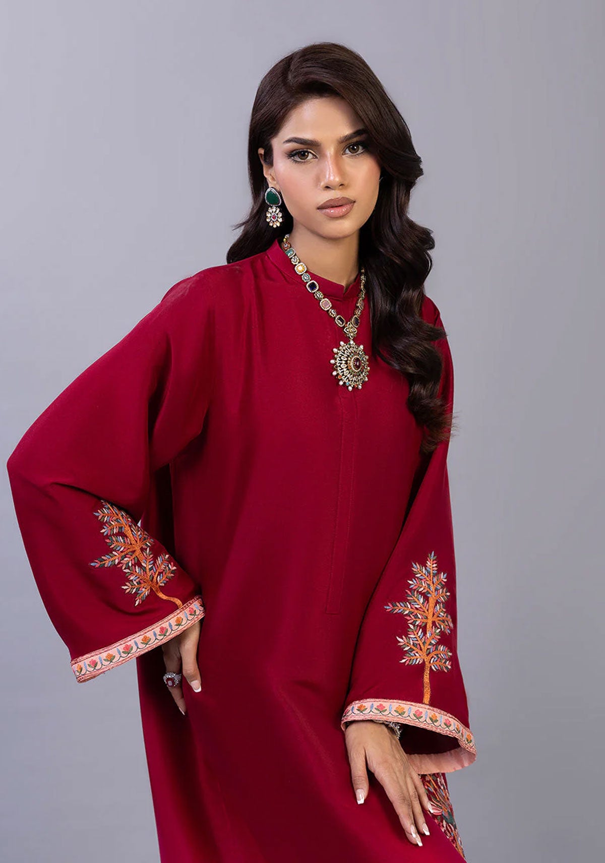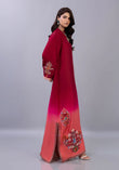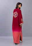 Command attention this festive season in this breathtaking ombré ensemble, a vibrant celebration of color and traditional craftsmanship. The kaftan features a stunning ombre transition from a deep, regal crimson at the top to a bright, sun-kissed coral at the hem, creating a mesmerising visual flow. The front is exquisitely detailed with delicate Suzani-style floral bouquets and bird motifs, while the back showcases a grand, circular floral medallion that serves as a true focal point of artisanal luxury.