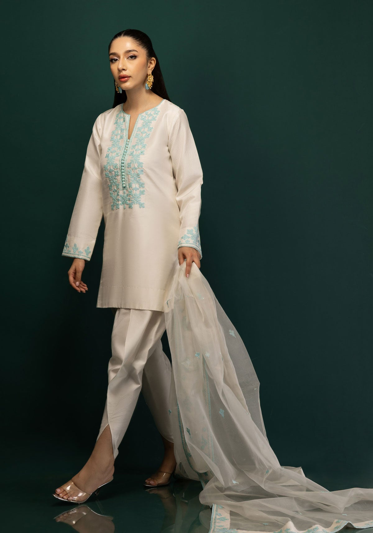 'Mariyam D Rizwan presents an effortless vision of graceful femininity with a capsule collection that captures the brand’s trendy aesthetic and modern elegance. Ava has intricate embroidery on the neckline of the shirt paired with a beautiful four sided embroidered organza dupatta. Model height is 5’6 and is wearing size a size small. Shirt length is 34 & Tulip Shalwar is 37 inches.