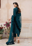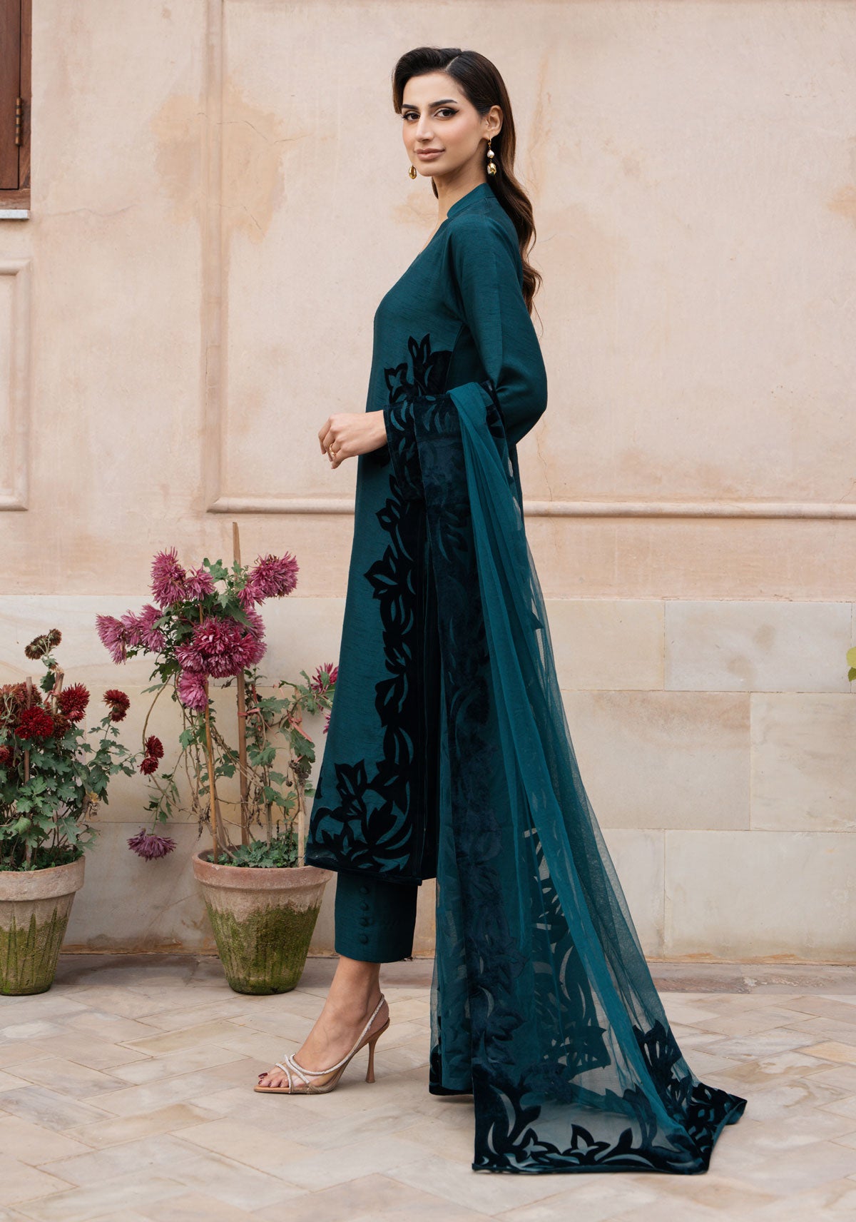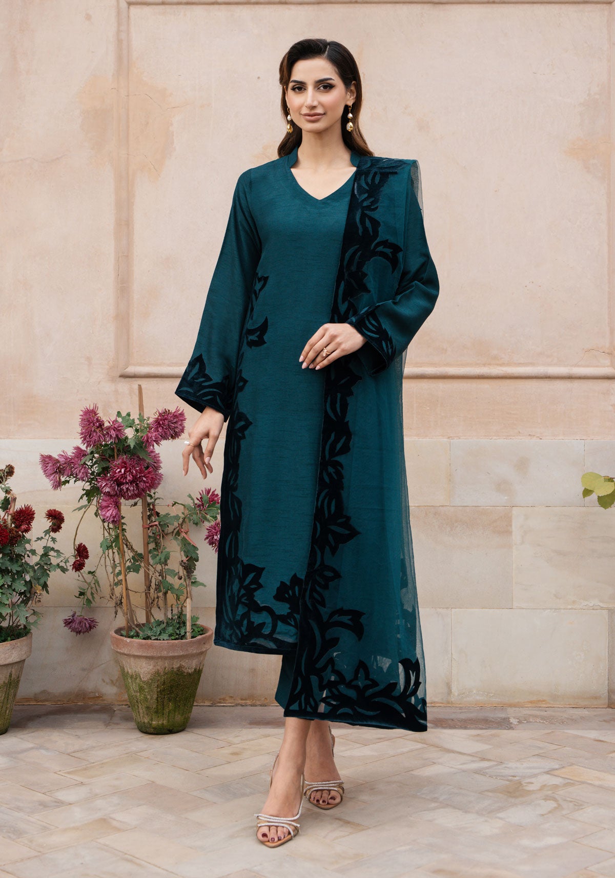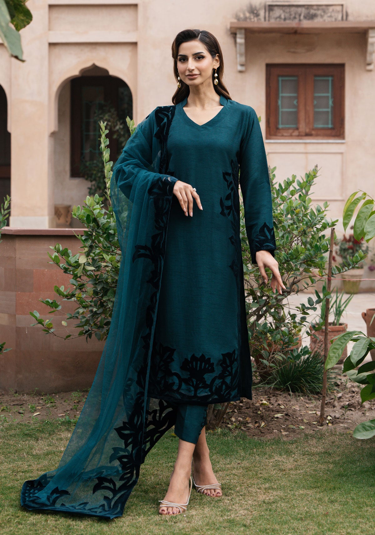 The sumptuous blend of teal green silk and velvet is the ideal complement to luxurious fabrications. It's quiet strength makes it a foolproof option for a complete head to toe ensemble. 'Verna' is adorned with romantic hand-crafted velvet applique in a floral filigree. To complete the look, a striking net applique dupppatta with bold edging along four sides adds the optimum glamour this season.