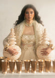 The net blouse and flowing peshwas skirt are fully hand-embellished with Swarovski crystals, zari, dabka, cutdana, sequins, beadwork, and fine French knots. Every detail is placed with precision, inspired by blooming gardens to create depth, brilliance, and fluidity across the entire design.
