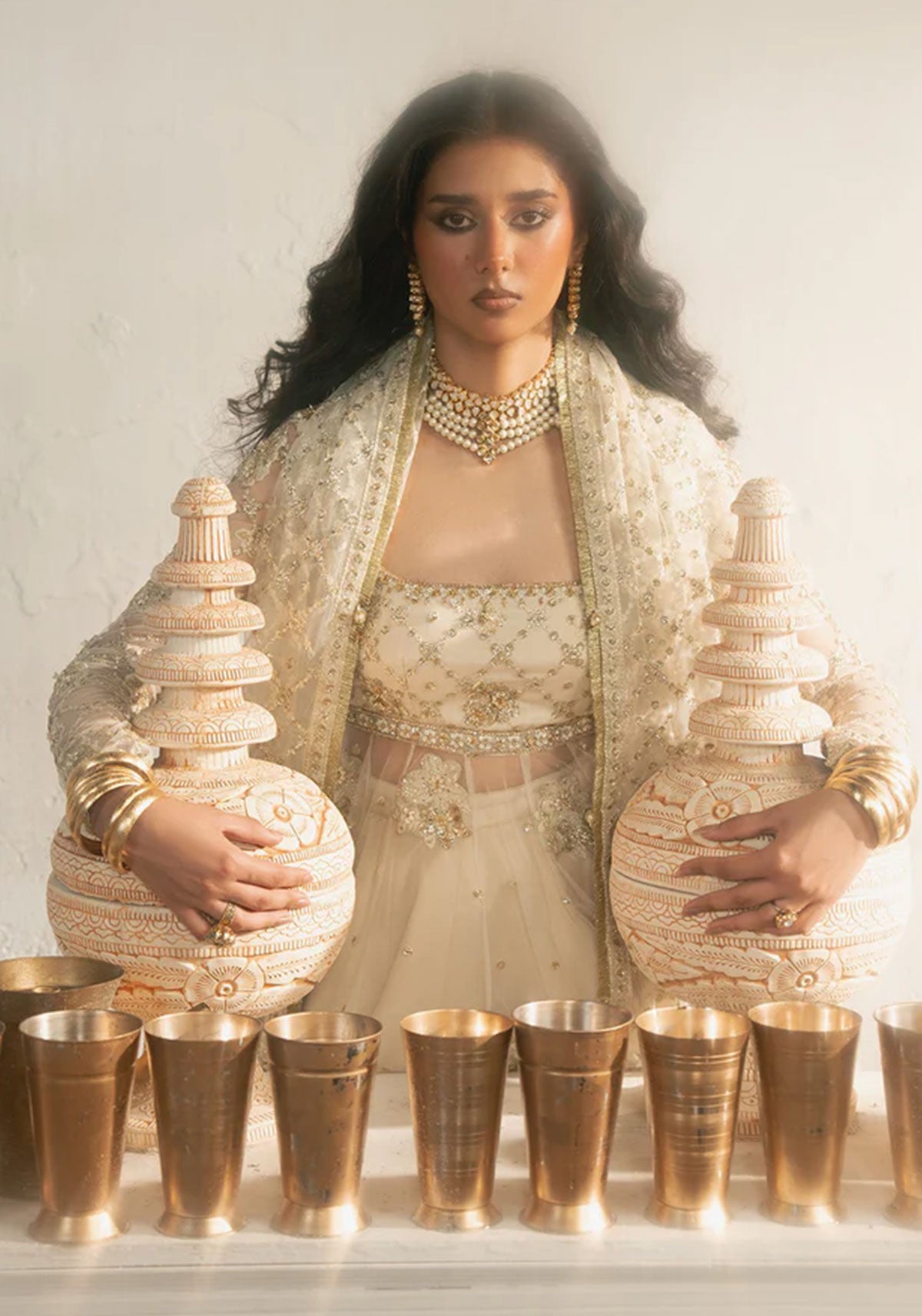 The look is elevated with a contrasting net dupatta, adorned in tribal-inspired motifs and finished with an elongated embellished border. This striking veil adds movement and drama, infusing the gown with character and contemporary allure.