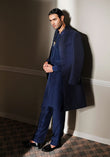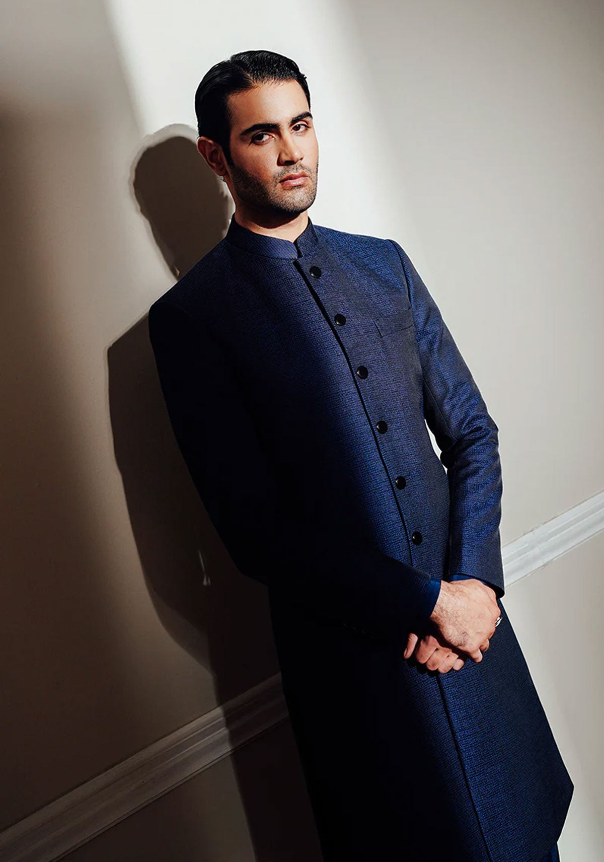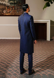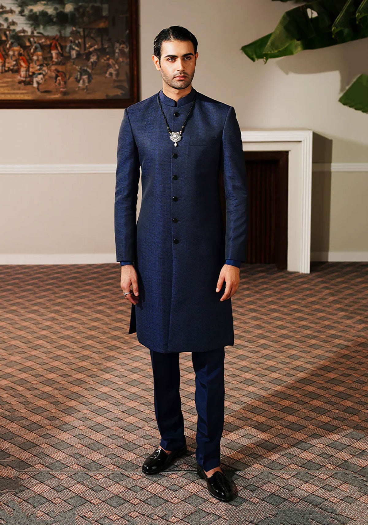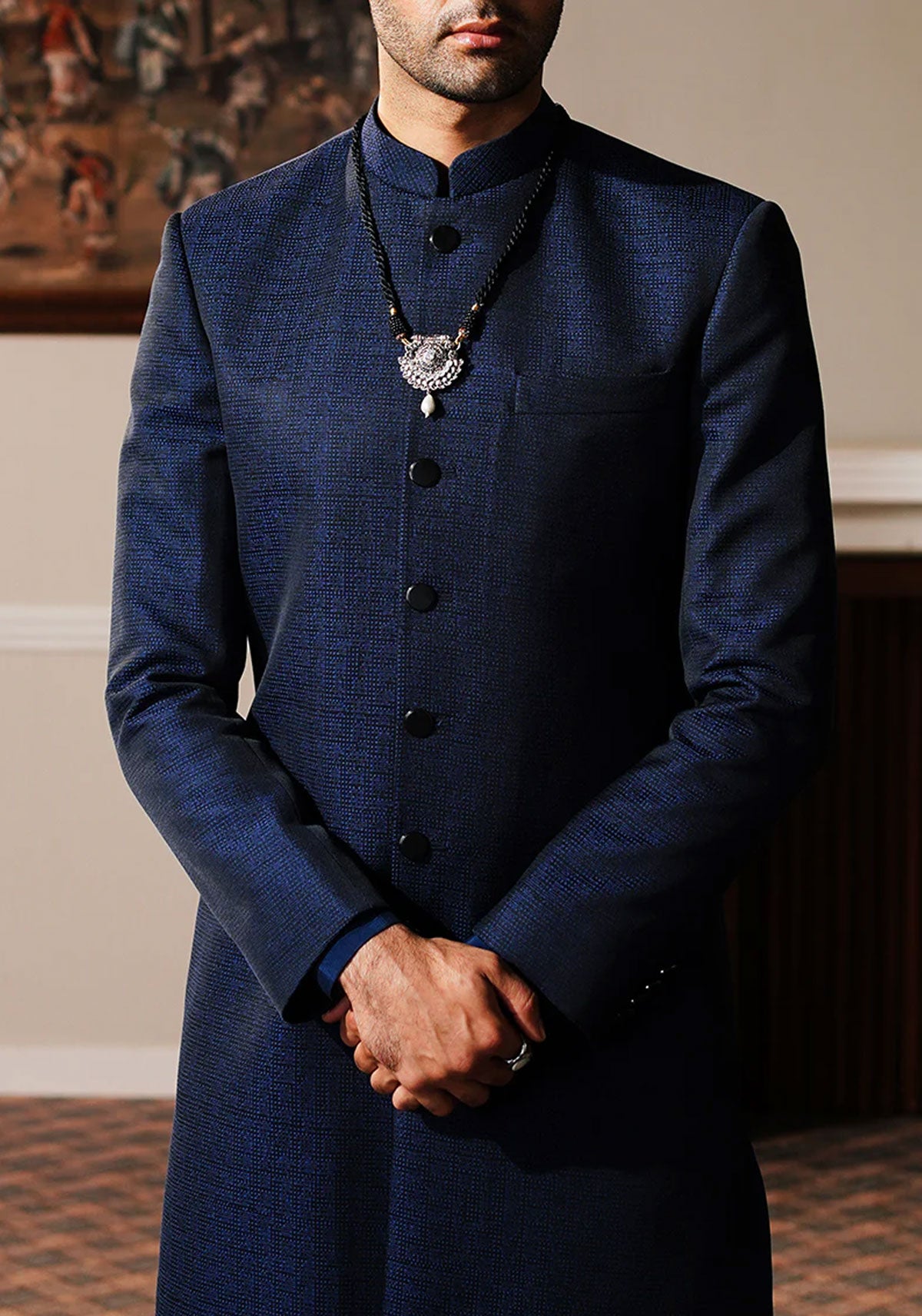 'Blue jacquard sherwani with speckled dust embroidered pattern all over, adorned with matte-black buttons.