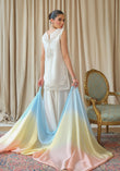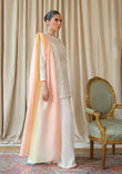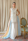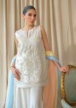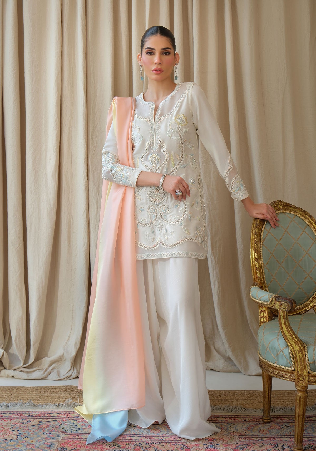 'Crafted from pure raw silk with a soft, natural shimmer, Ayla is adorned with intricate embroidery—delicate resham, pearls, and subtle sequins that catch the light. It’s paired with flowing, elvish silk skirt pants for a modern silhouette, and a dreamy three-tone medium silk dupatta in soft hues of peach, sky blue, and lemon. Ethereal and refined, Ayla is festive elegance in motion.