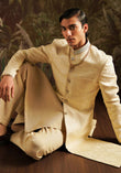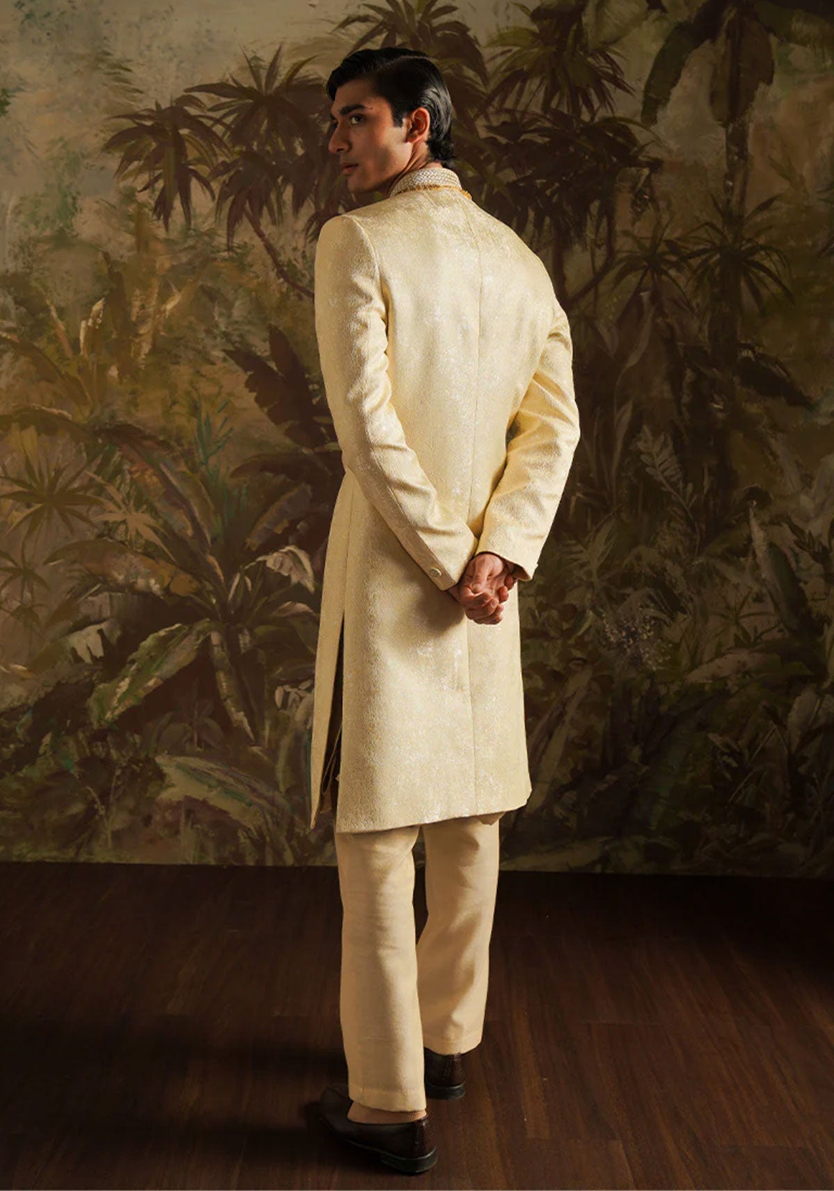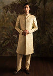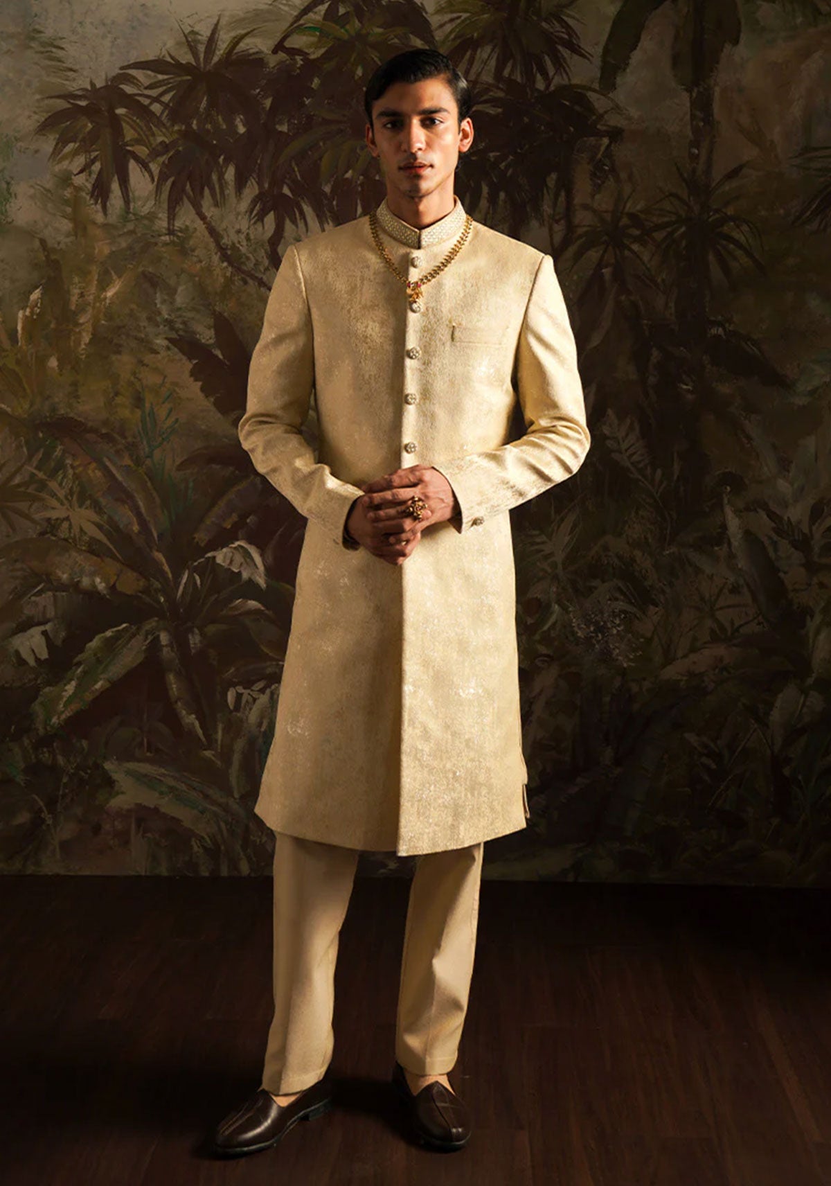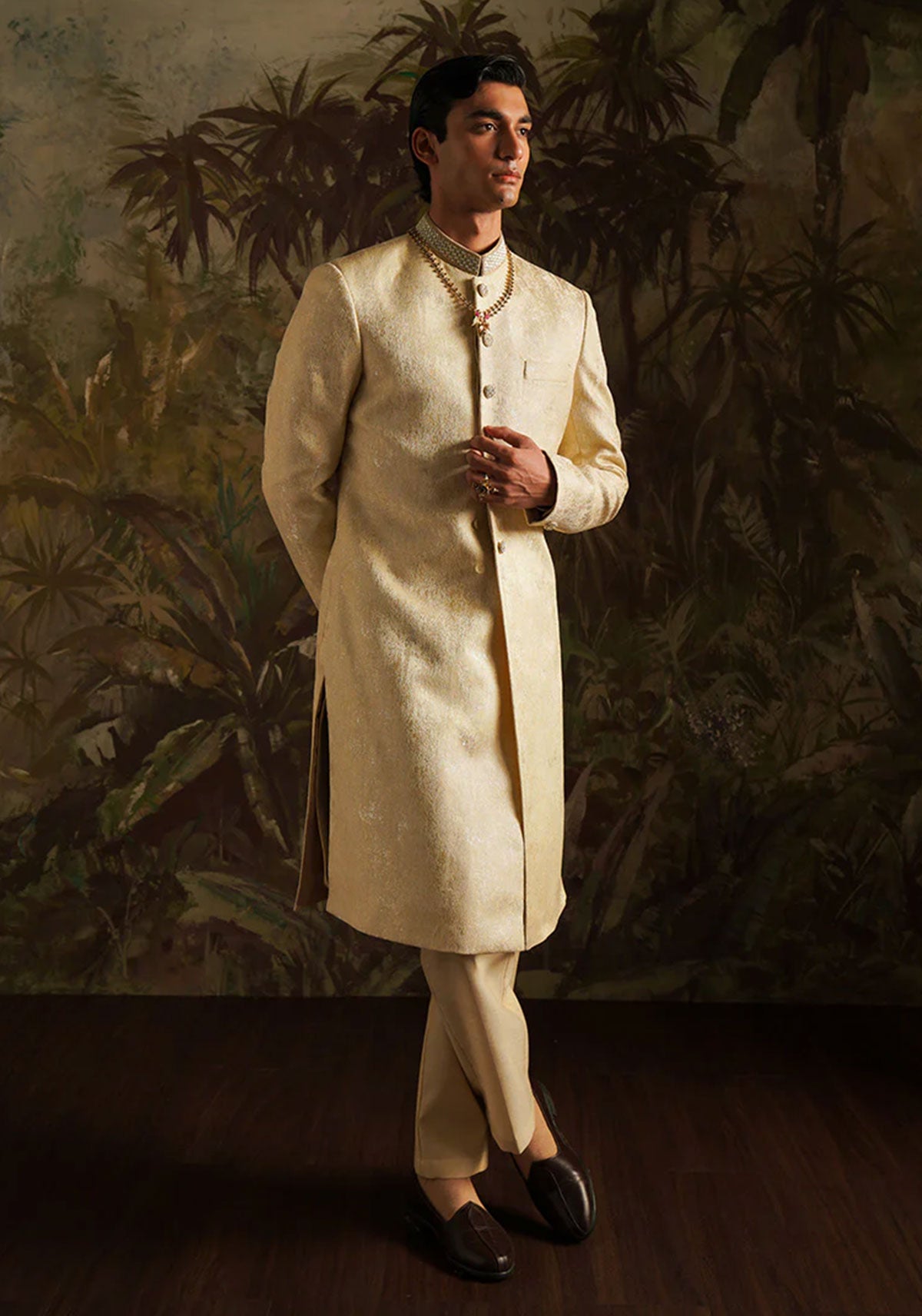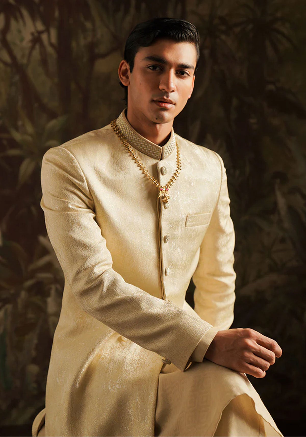 'Beige gold hand weaved jacquard sherwani, with embellished work on collar with Ada work buttons