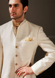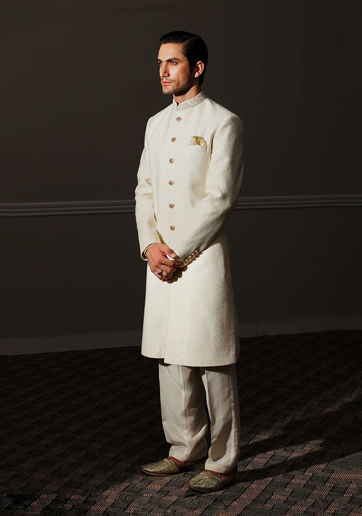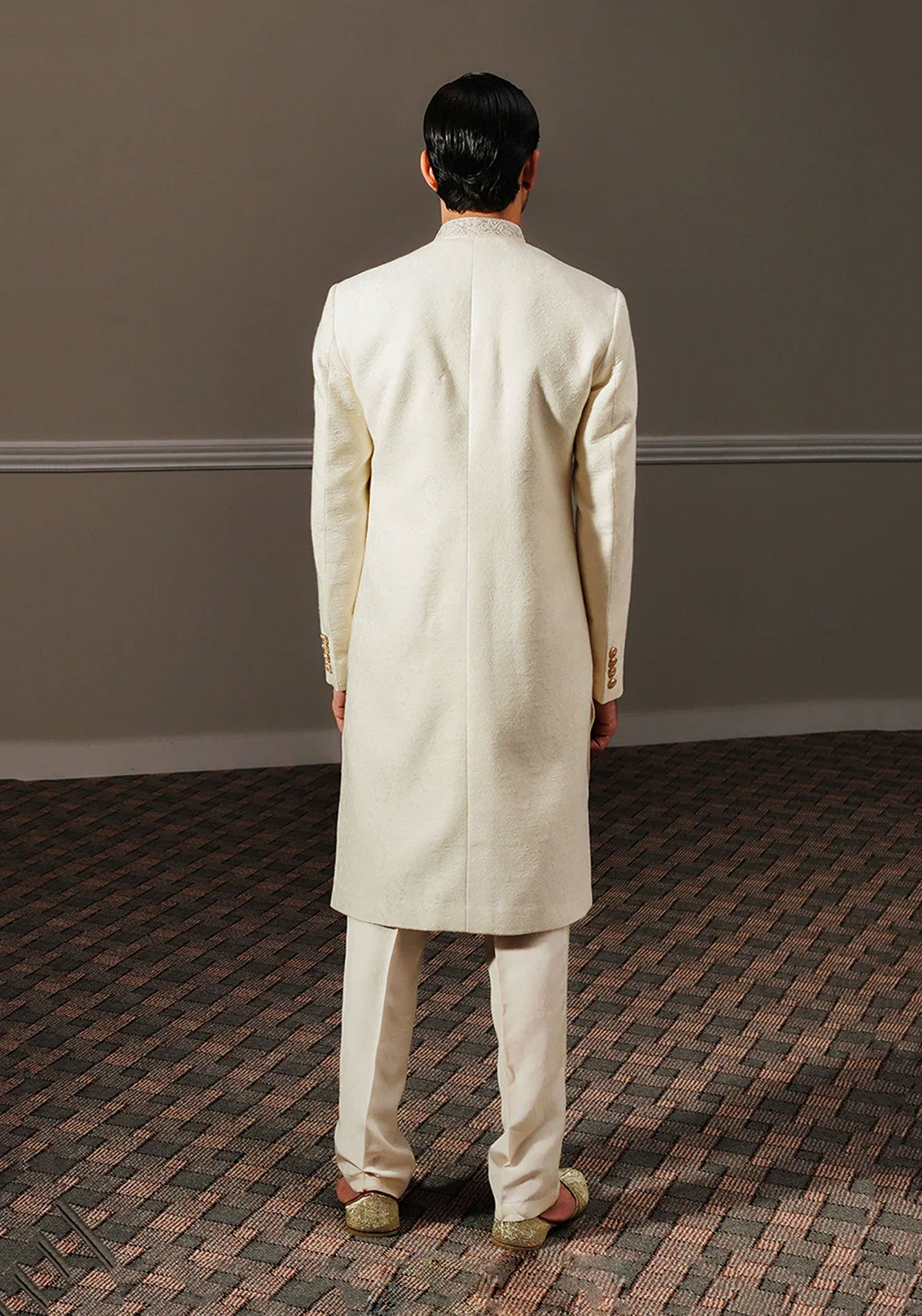 'Pearl white sherwani with self-jacquard fabric, adorned with hand embellished band collar.