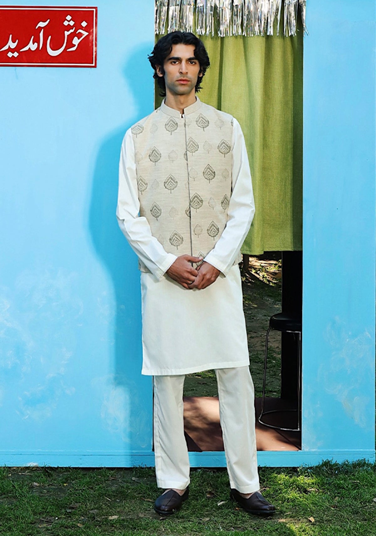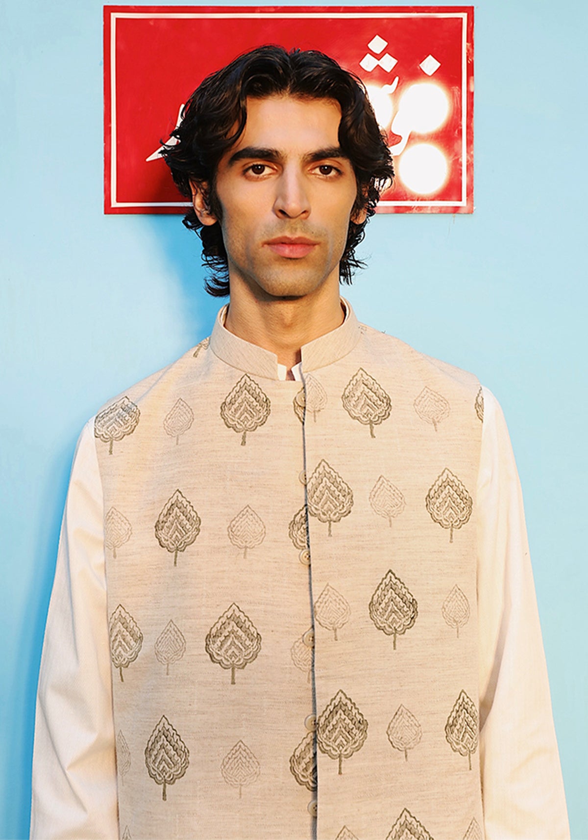 Beige slub cotton waistcoat, with floral block print patterns, with mandarin collar and hidden buttons closures. Herringbone waistcoat, with embroidery on pocket and front button closures.