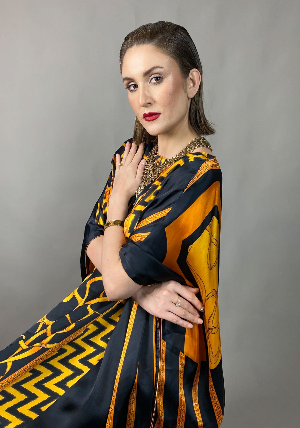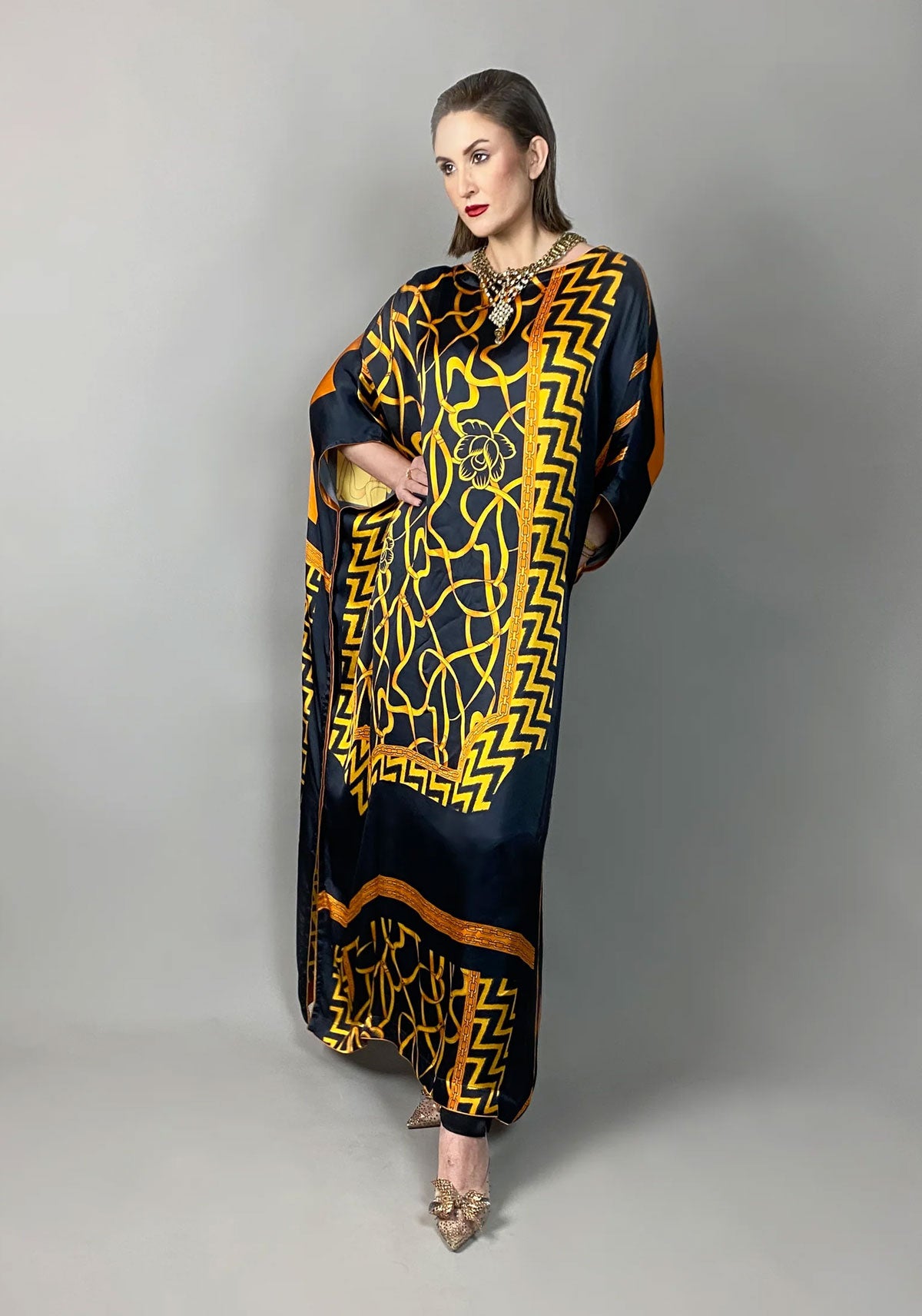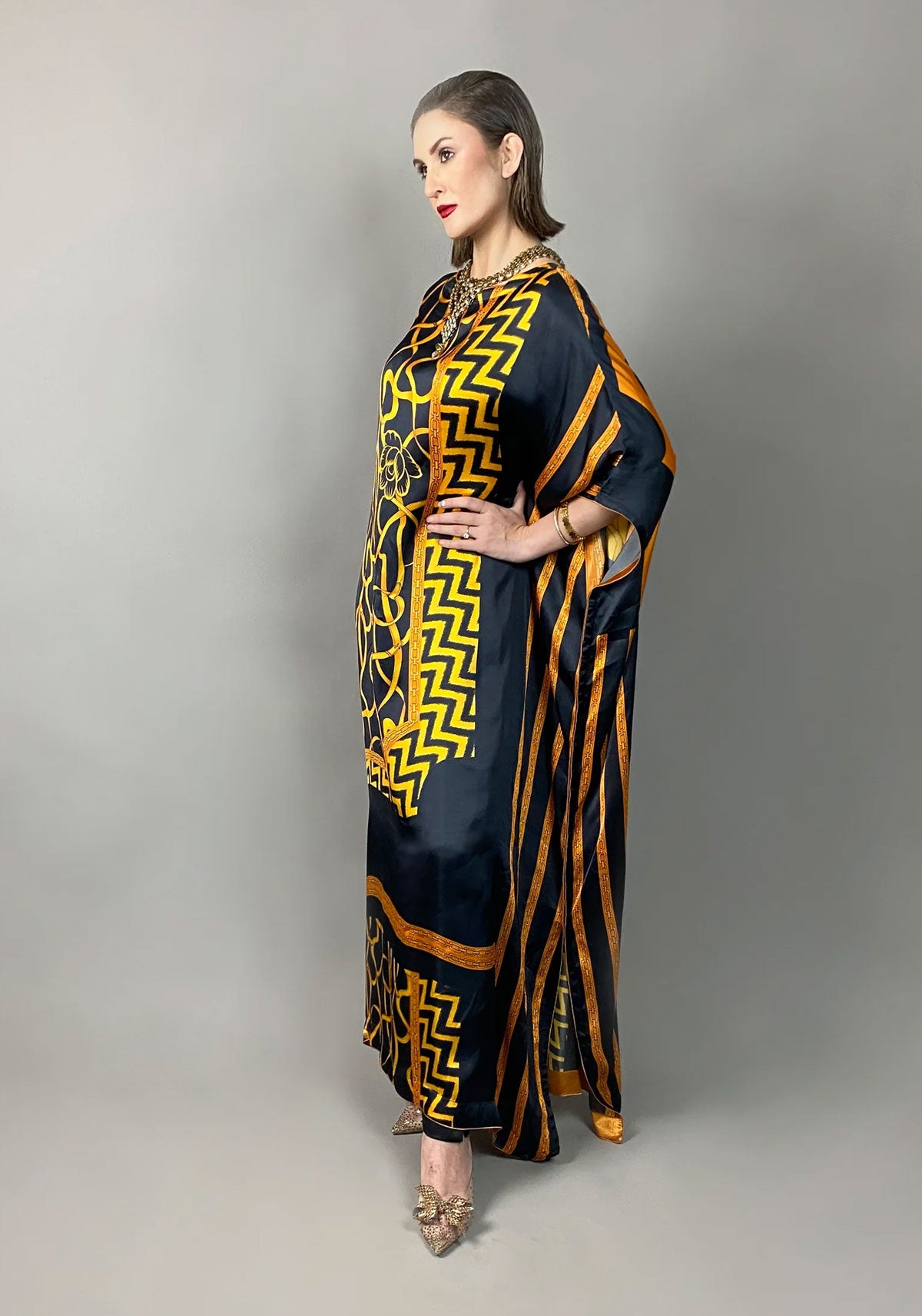 Bold, artistic, and unapologetically modern — this kaftan is a statement of power and grace. crafted from deep black fabric, this striking piece features vivid golden and burnt orange geometric patterns intertwined with abstract floral motifs, creating a mesmerising contrast that captures both structure and spontaneity.