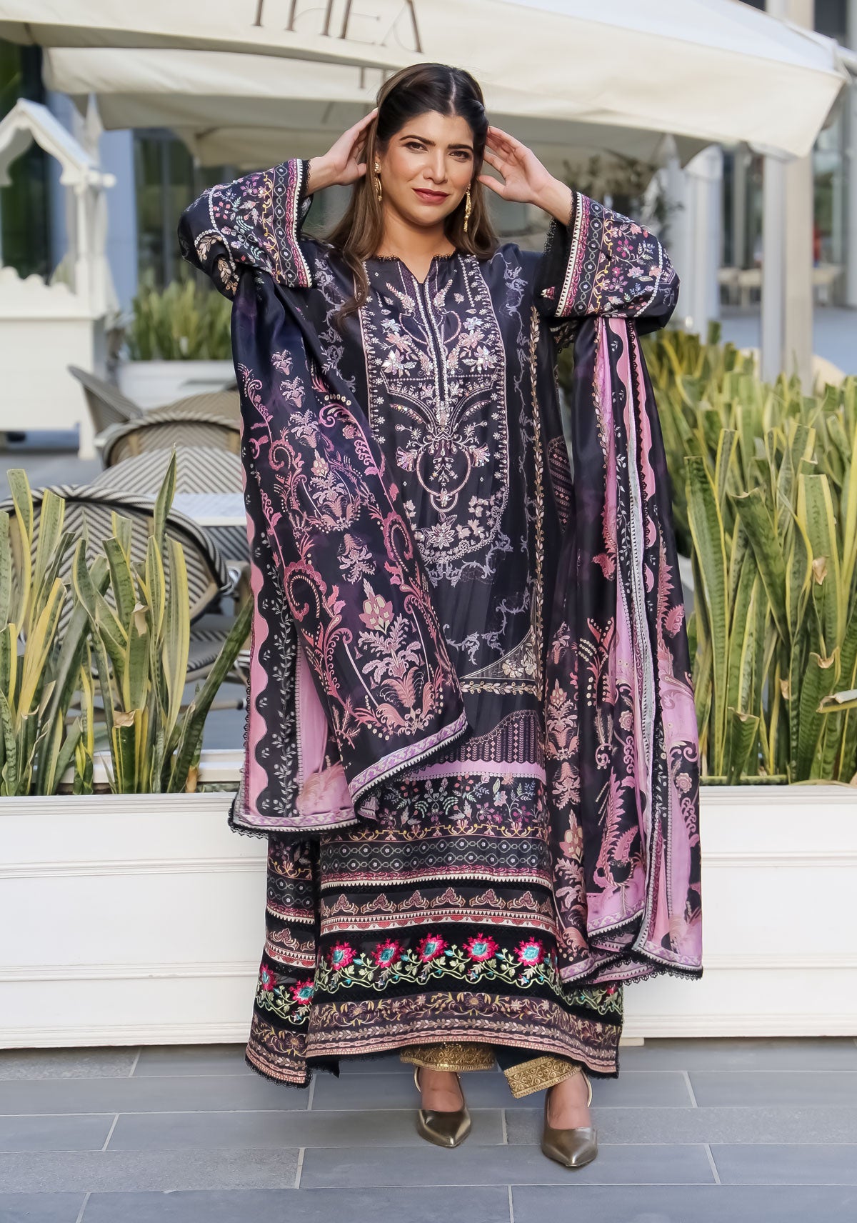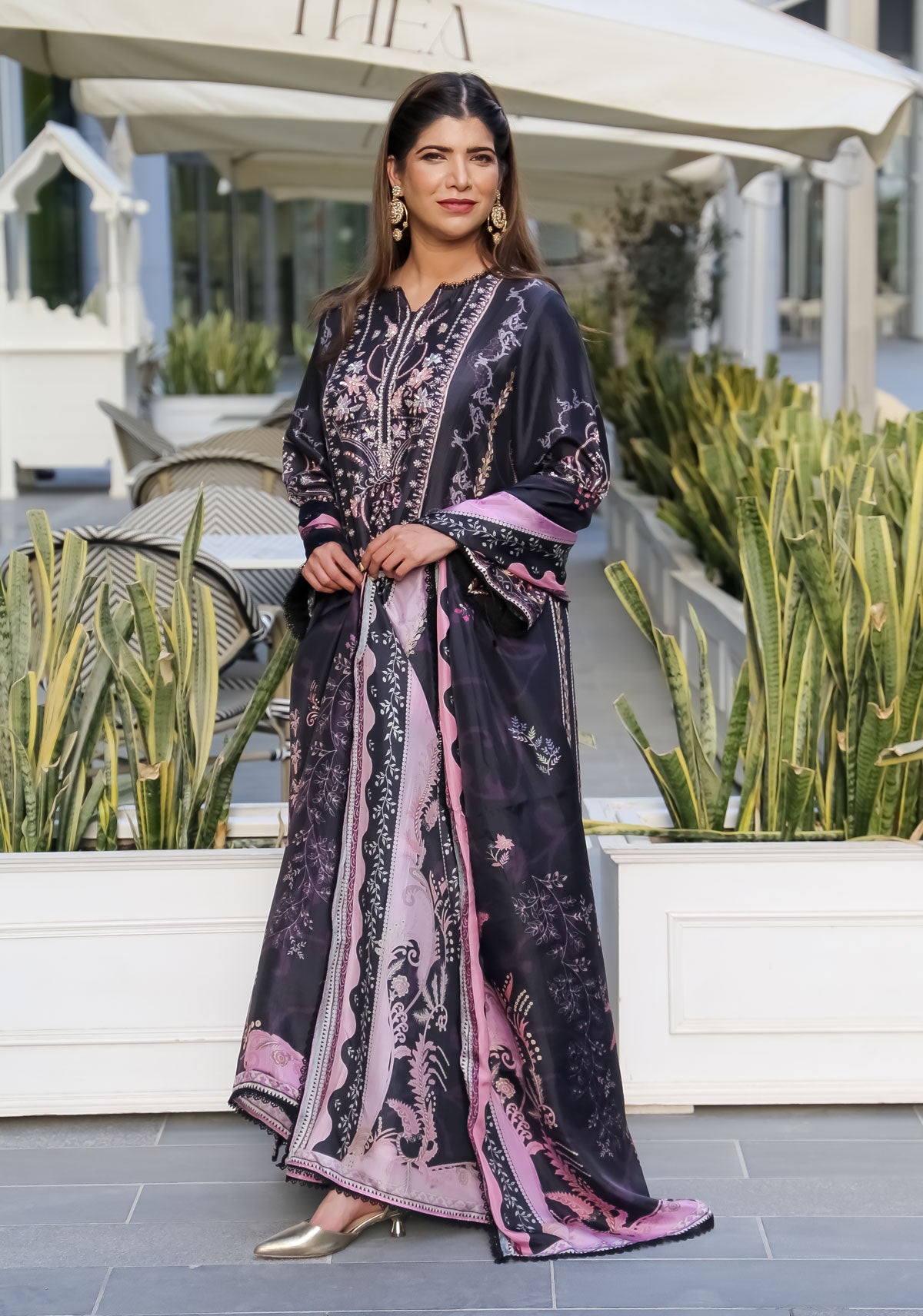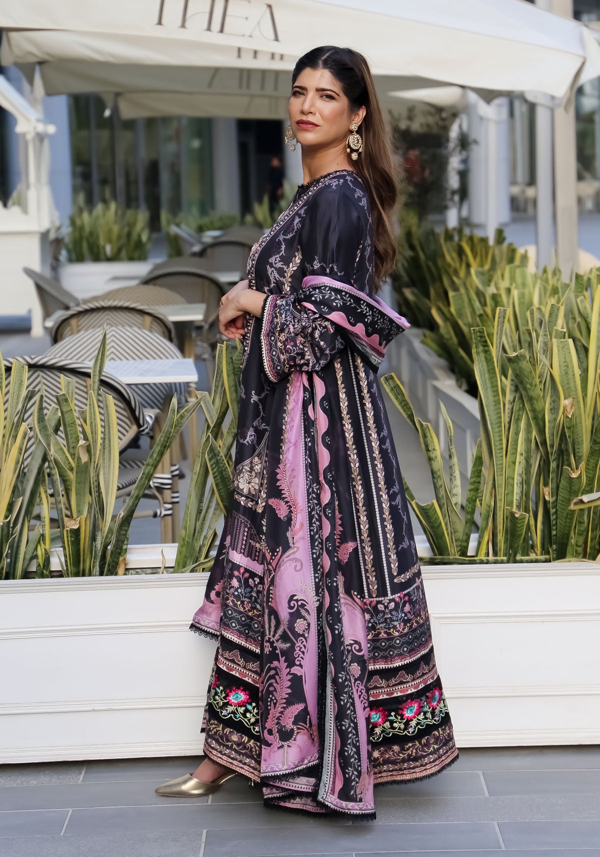 A celebration of classic allure and timeless sophistication, the Cyna Jalabiya in midnight black is a striking statement in understated luxury. Crafted from flowing Pure Raw silk fabric and brought to life with meticulous handwork, this elegant silhouette features intricately embroidered borders highlighted with silver gota work and delicate hand embellishments, creating a rich, artisanal texture that shimmers with every step. Paired with a printed silk dupatta adorned with soft, artistic motifs on the pallu, Cyna is the perfect fusion of tradition and modernity—ideal for evening soirées or intimate gatherings where refined grace and effortless style are key.