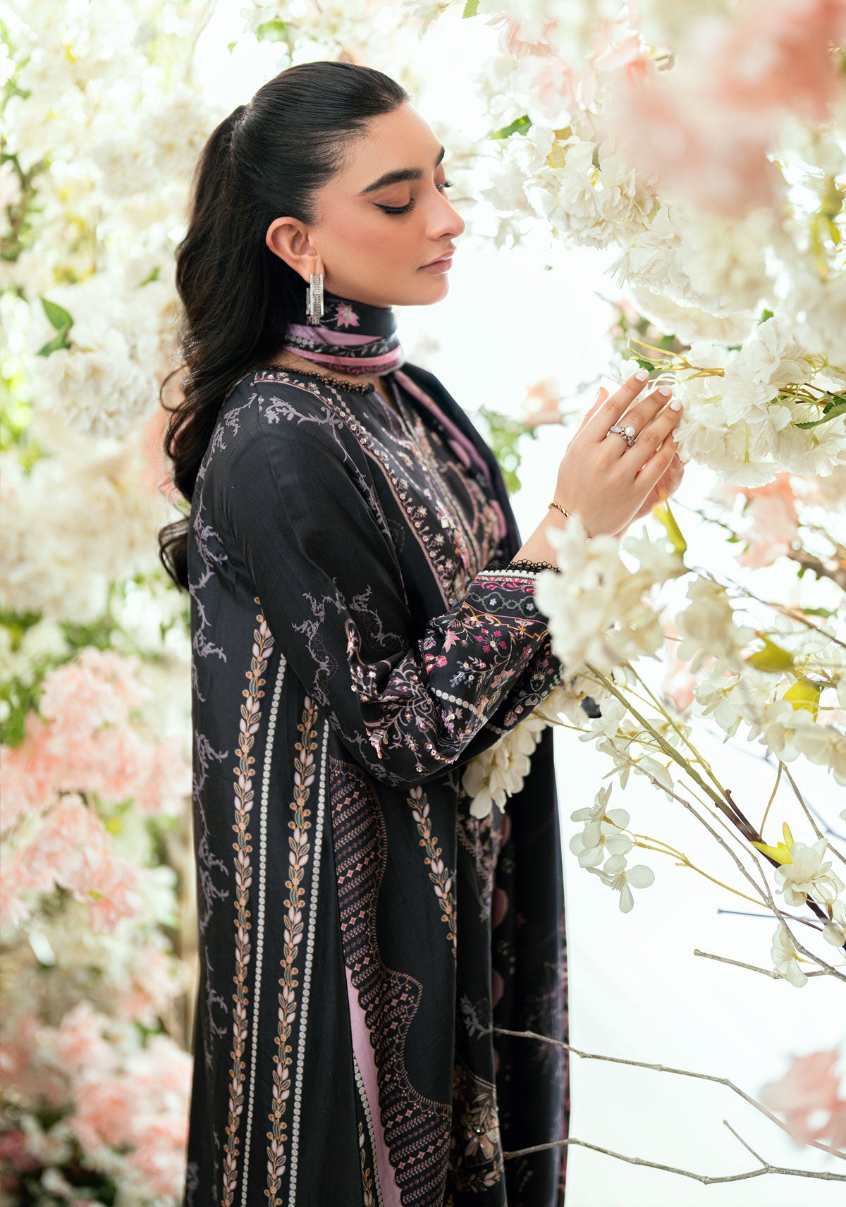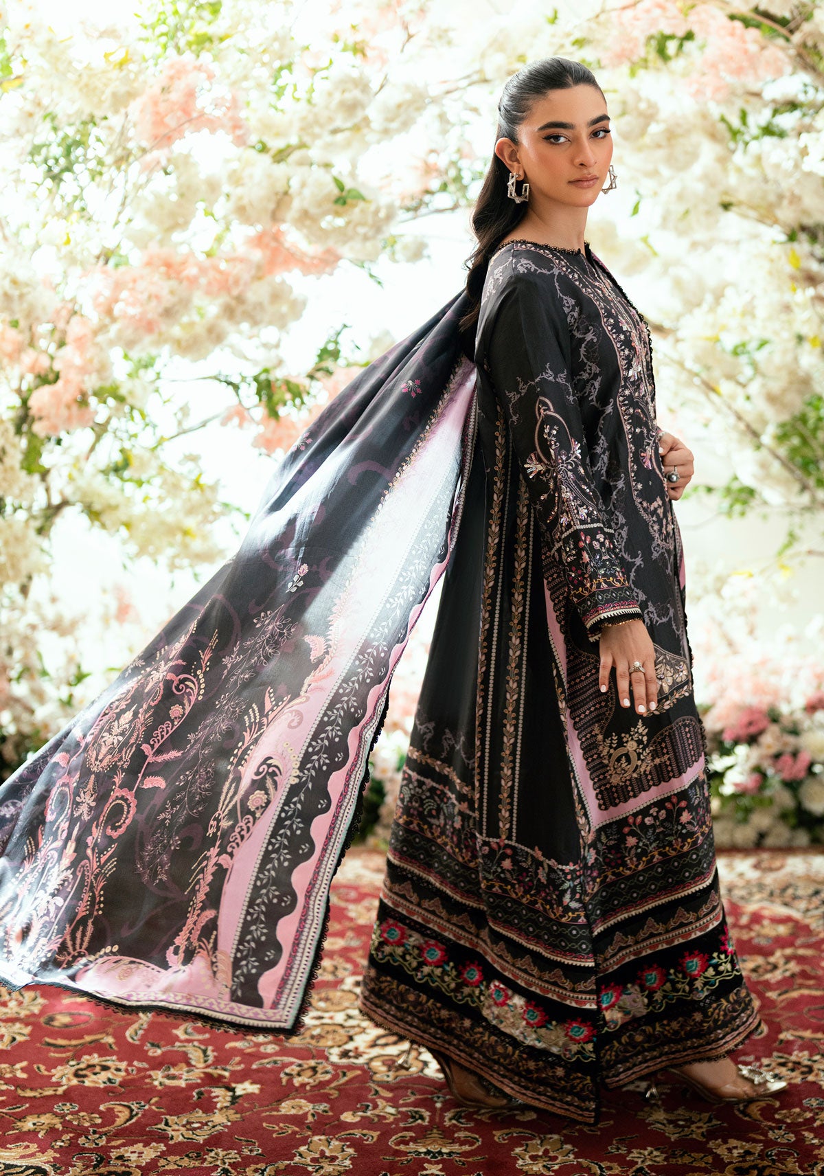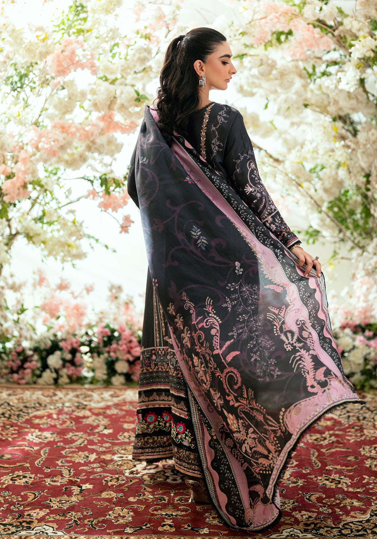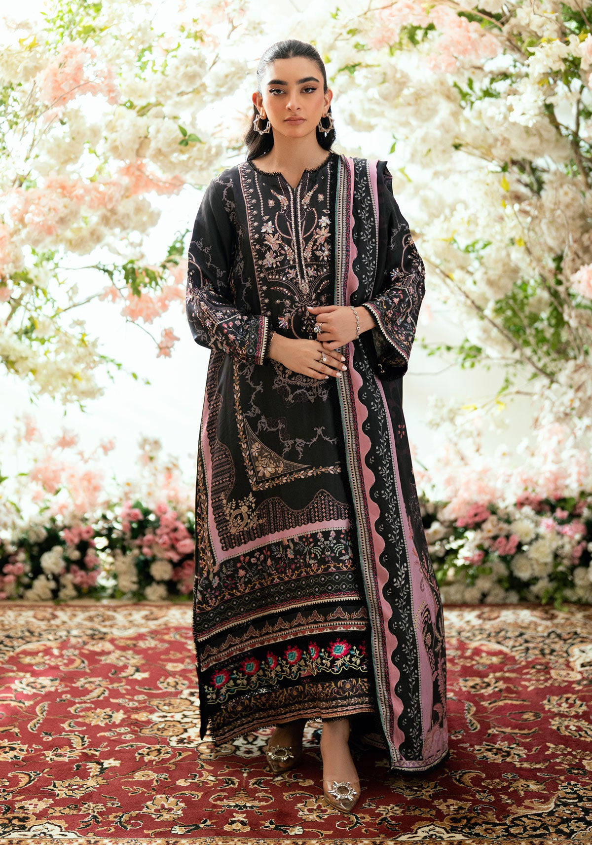 A celebration of classic allure and timeless sophistication, the Cyna Jalabiya in midnight black is a striking statement in understated luxury. Crafted from flowing Pure Raw silk fabric and brought to life with meticulous handwork, this elegant silhouette features intricately embroidered borders highlighted with silver gota work and delicate hand embellishments, creating a rich, artisanal texture that shimmers with every step. Paired with a printed silk dupatta adorned with soft, artistic motifs on the pallu, Cyna is the perfect fusion of tradition and modernity—ideal for evening soirées or intimate gatherings where refined grace and effortless style are key.