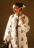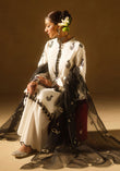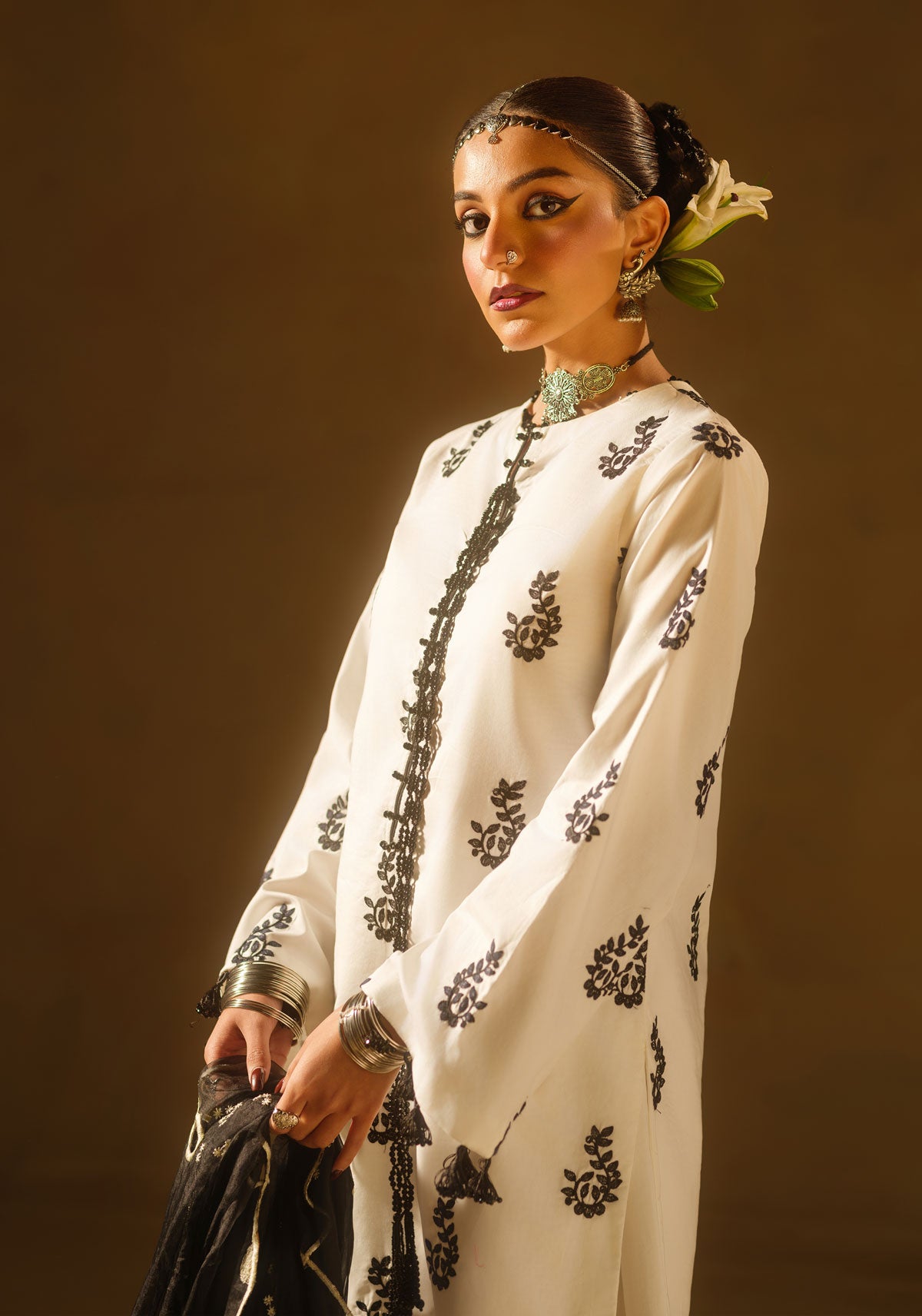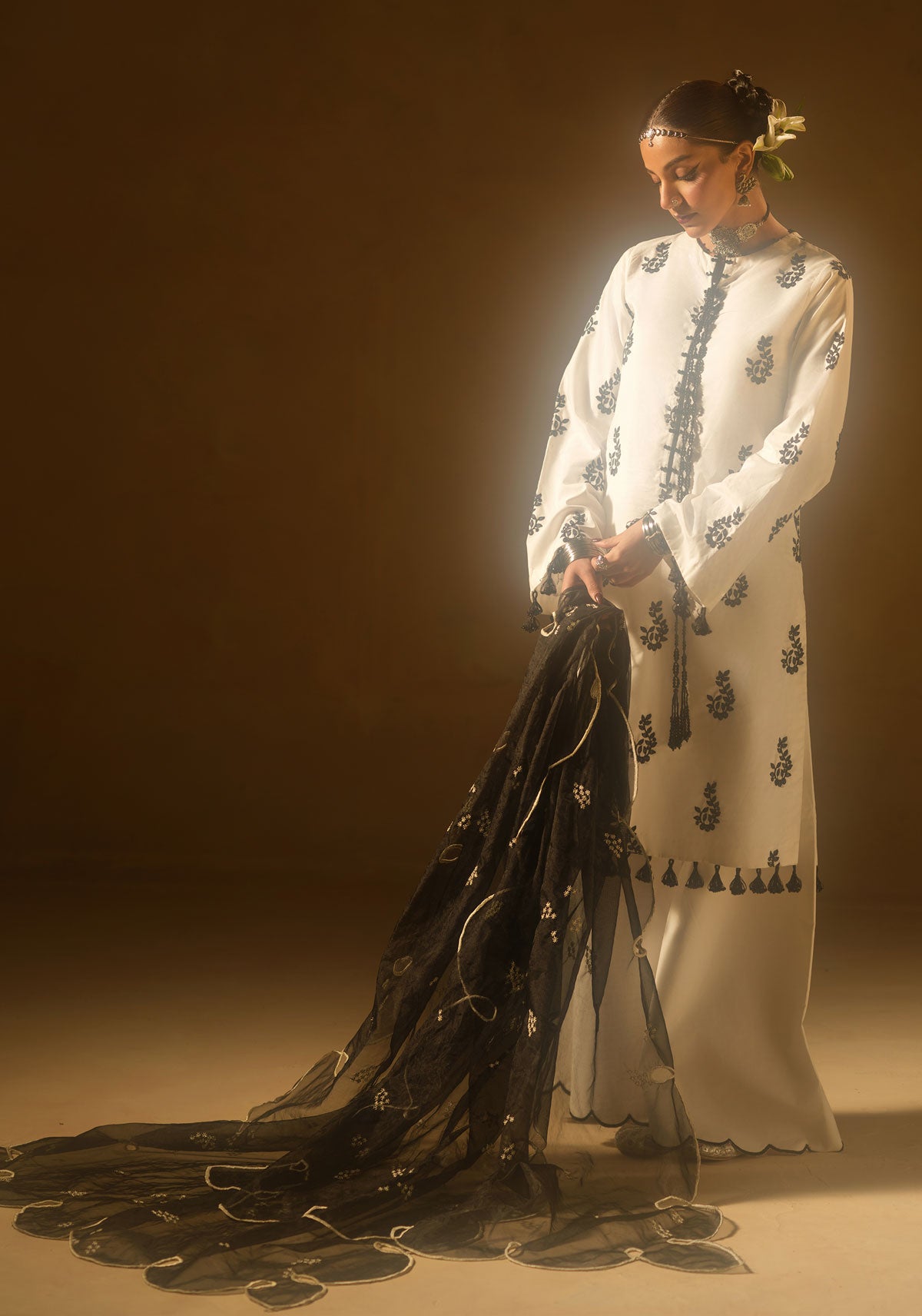 A pristine shirt adorned with delicate black sequin embroidery, complemented by an ethereal organza dupatta and intricately embroidered cotton trousers.
