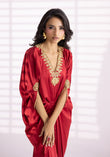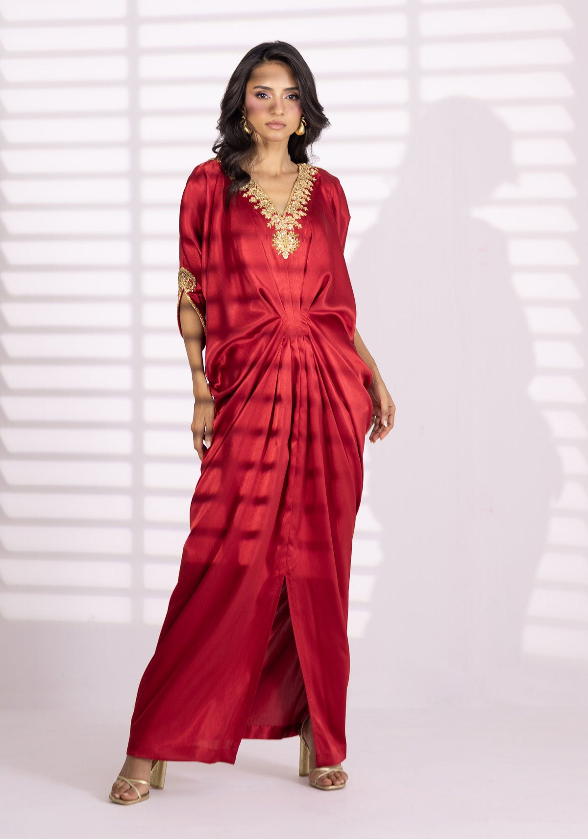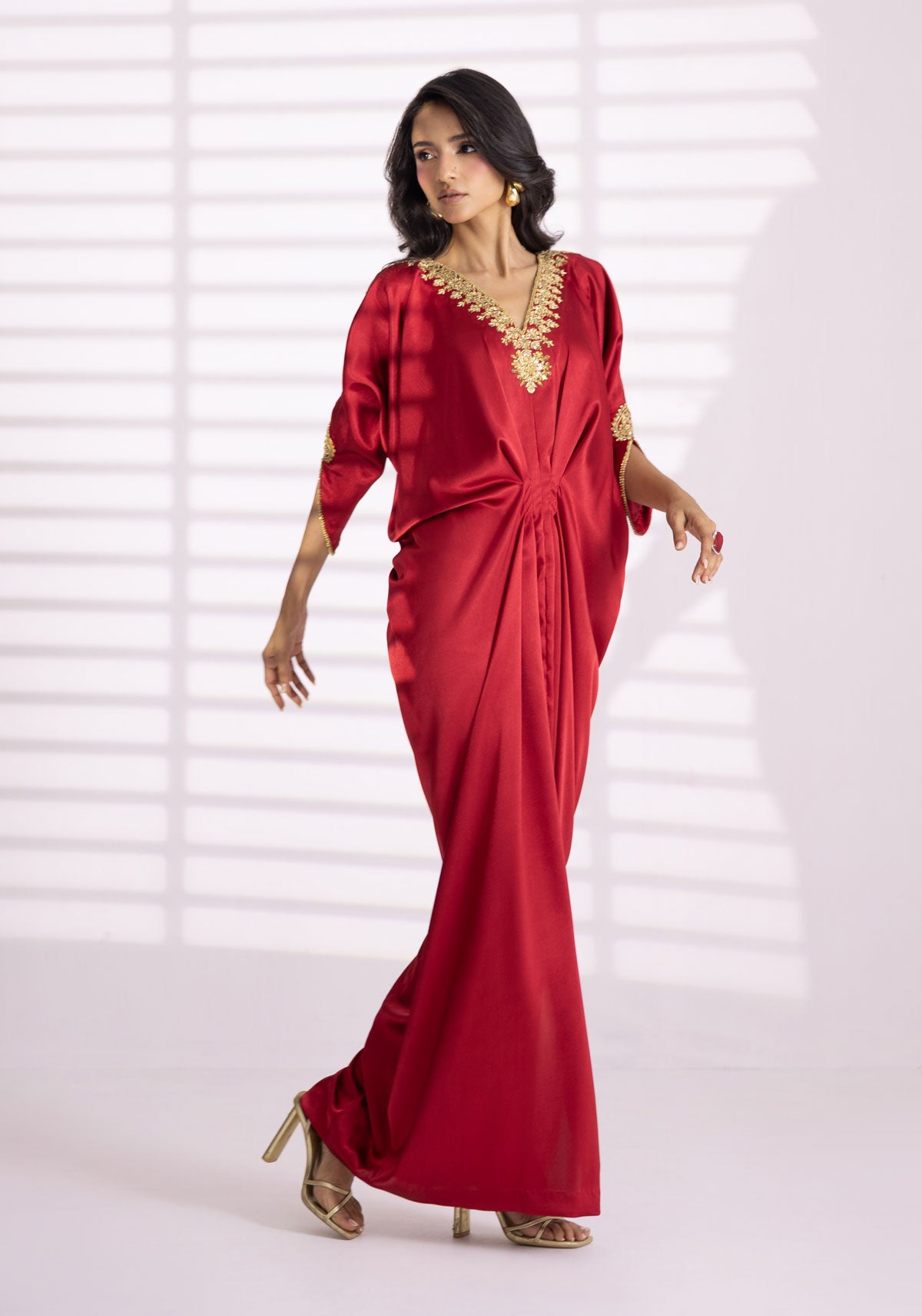 'Introducing Blair, this stunning kaftan is draped to perfection with intricate handwork all over the neckline and sleeves, with a front slit to give it that extra glam. Model length is 58 Inches.