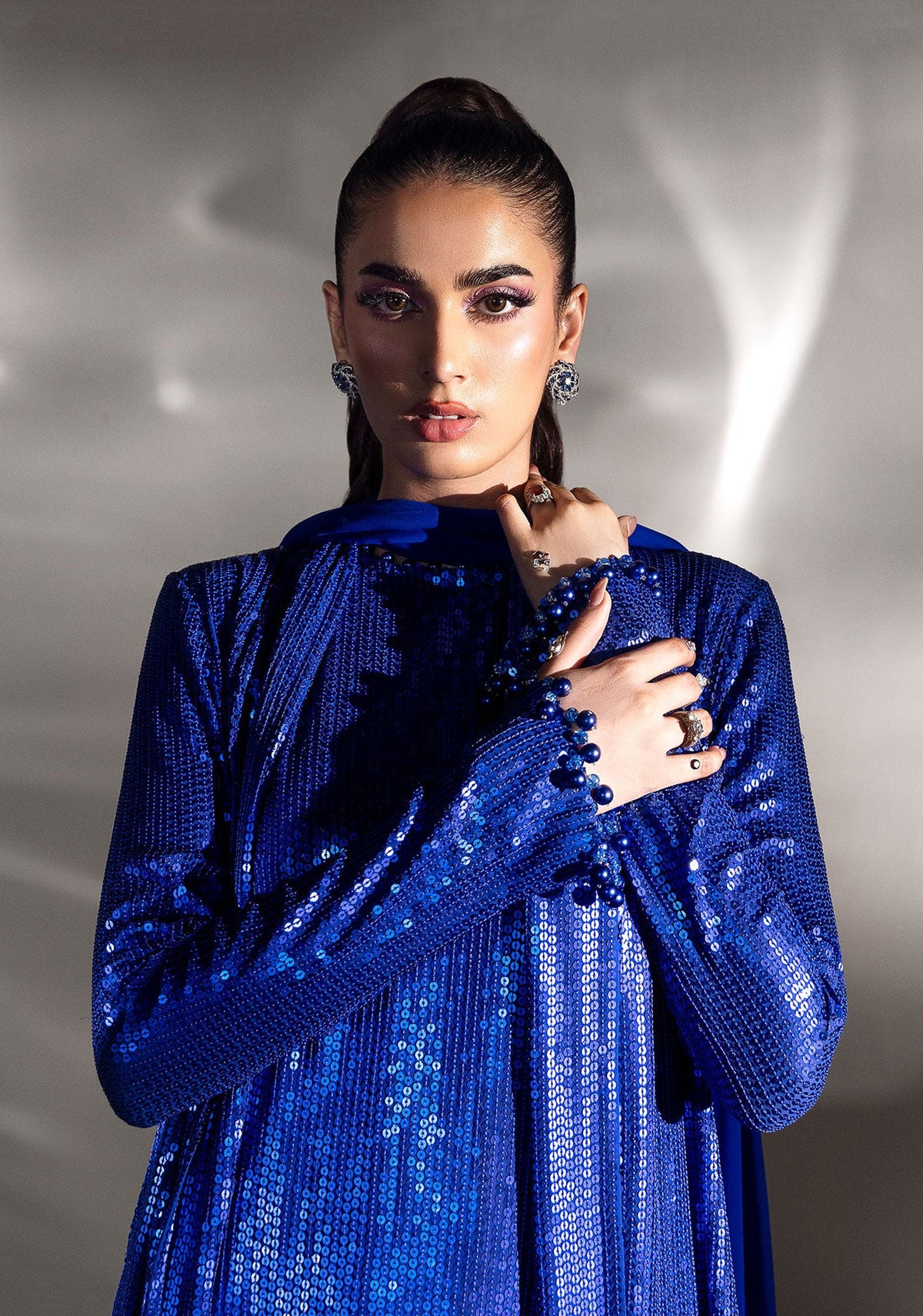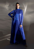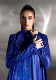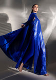Indulge in the magic of Bleu Éclat, where a celestial dreamscape is woven in the shimmering depths of regal blue. Gleaming sequins cascade across sumptuous chiffon, their spellbinding sparkle beautifully complemented by delicate pearls that elevate the ensemble into a mesmerizing masterpiece. A meticulously crafted cape drapes effortlessly over the flowing shirt, enhancing the grace and grandeur of this radiant creation. This glistening vision of elegance is designed to leave a lasting impression, embodying timeless allure and refined sophistication.