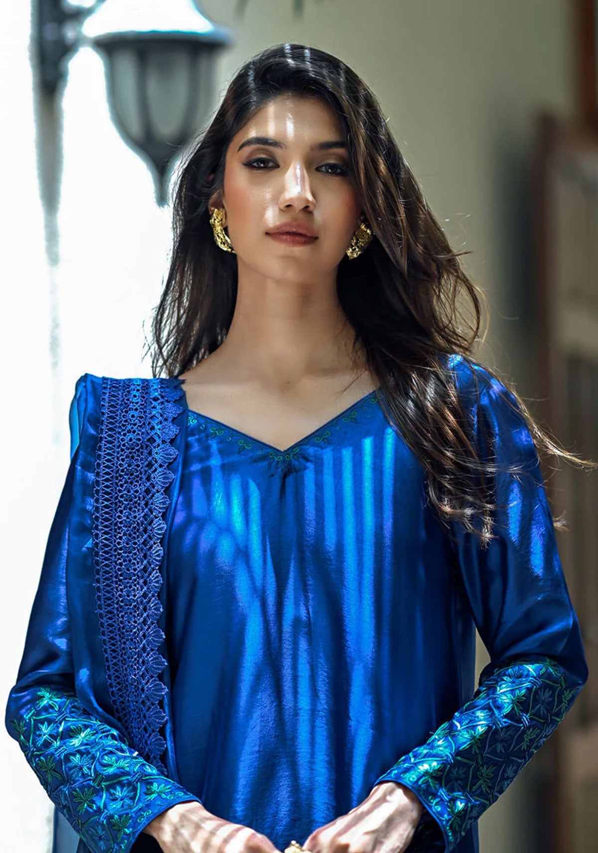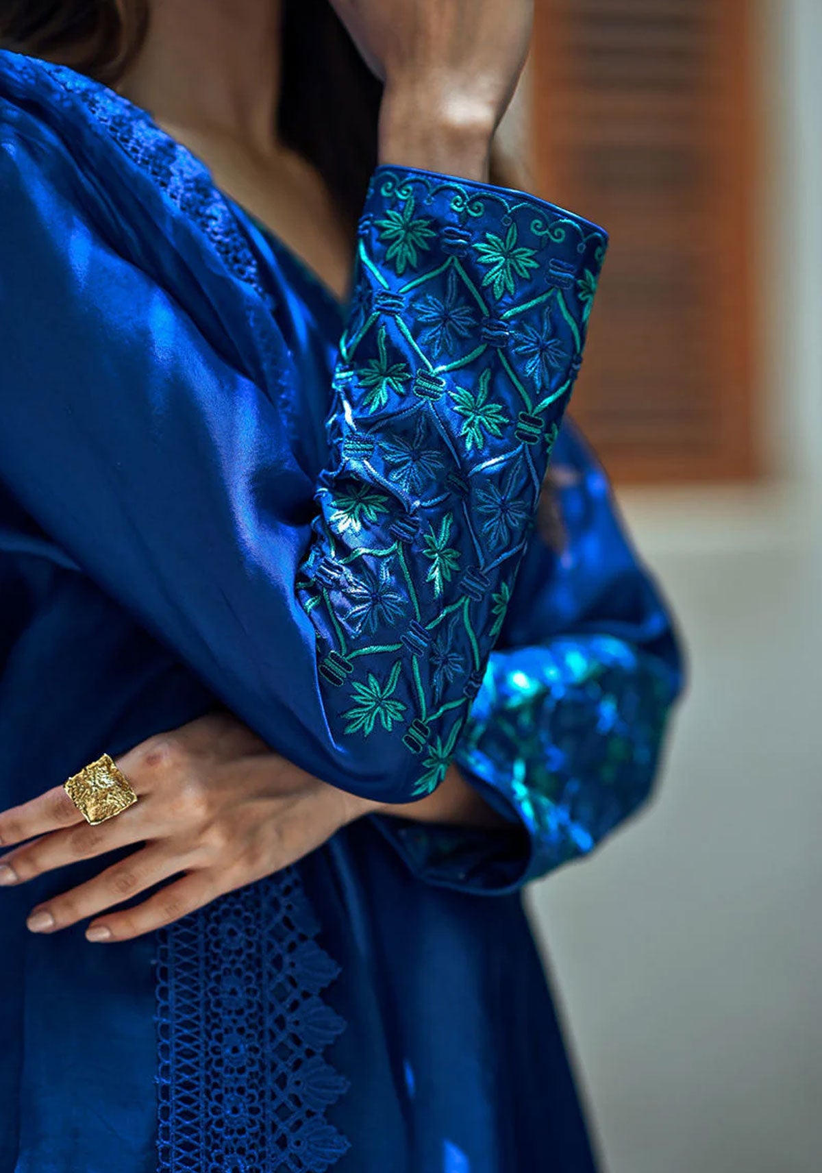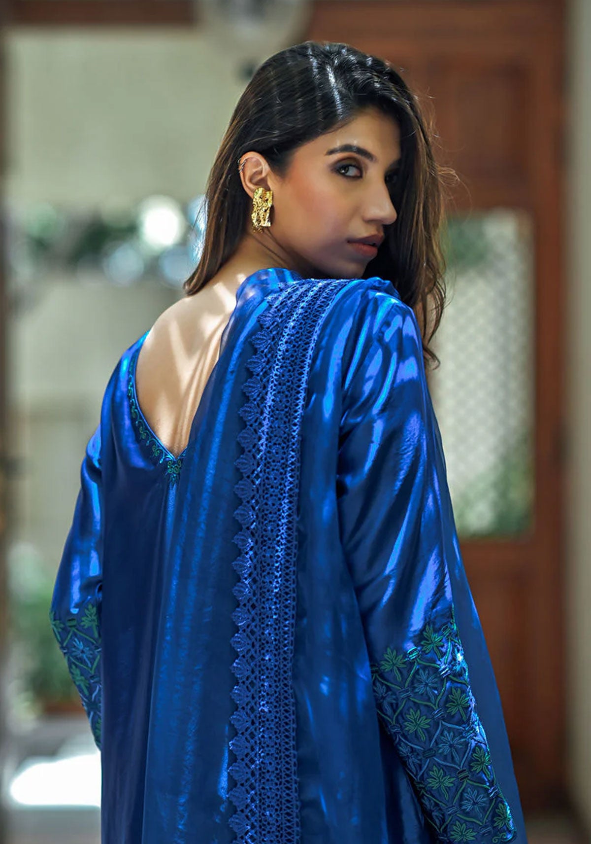 This electric blue silk outfit features delicate resham embroidery adorning the sleeves, adding elegance and flair. Paired with a delicate organza dupatta. The ensemble is completed with an exaggerated silk shalwar, adding a modern twist to traditional attire