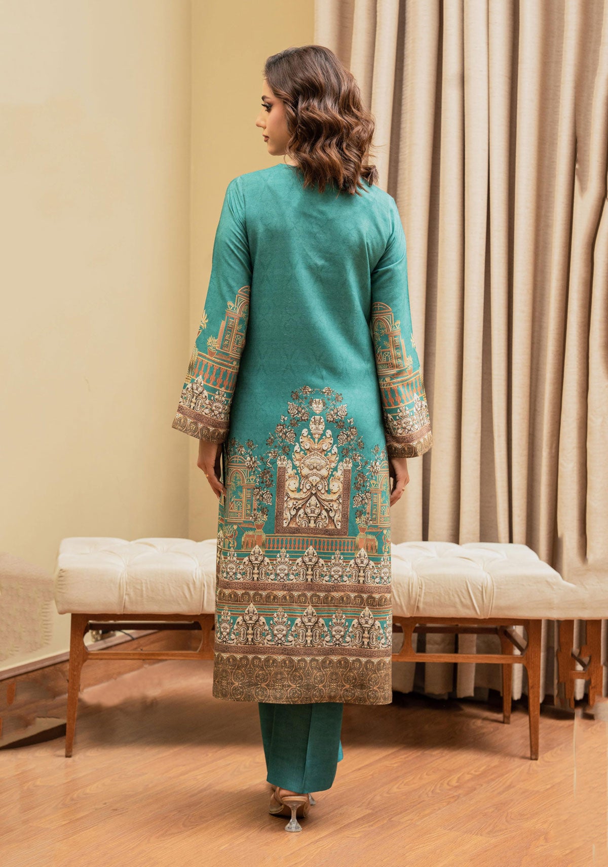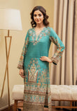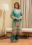 Draped in the serene elegance of tale blue Khadi silk, this ensemble features a printed textured base adorned with intricate patterns. The neckline is enhanced with thin border and delicate florals print, cascades into architectural motifs that gracefully flow down the front and sleeves. Paired with solid matching trousers, the simplicity of the bottoms balances the ornate detailing above, creating a harmonious blend of tradition. Breathable fabric, for all-day wear, perfect for Eid, casual outings, daytime events.