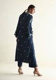 Crafted from our own high quality in-house produced cotton fabric in a navy shade, this piece features intricate embroidery on the front, back, and sleeves. It is adorned with handcrafted buttons and detailed fringe accents on the sleeves and daaman.