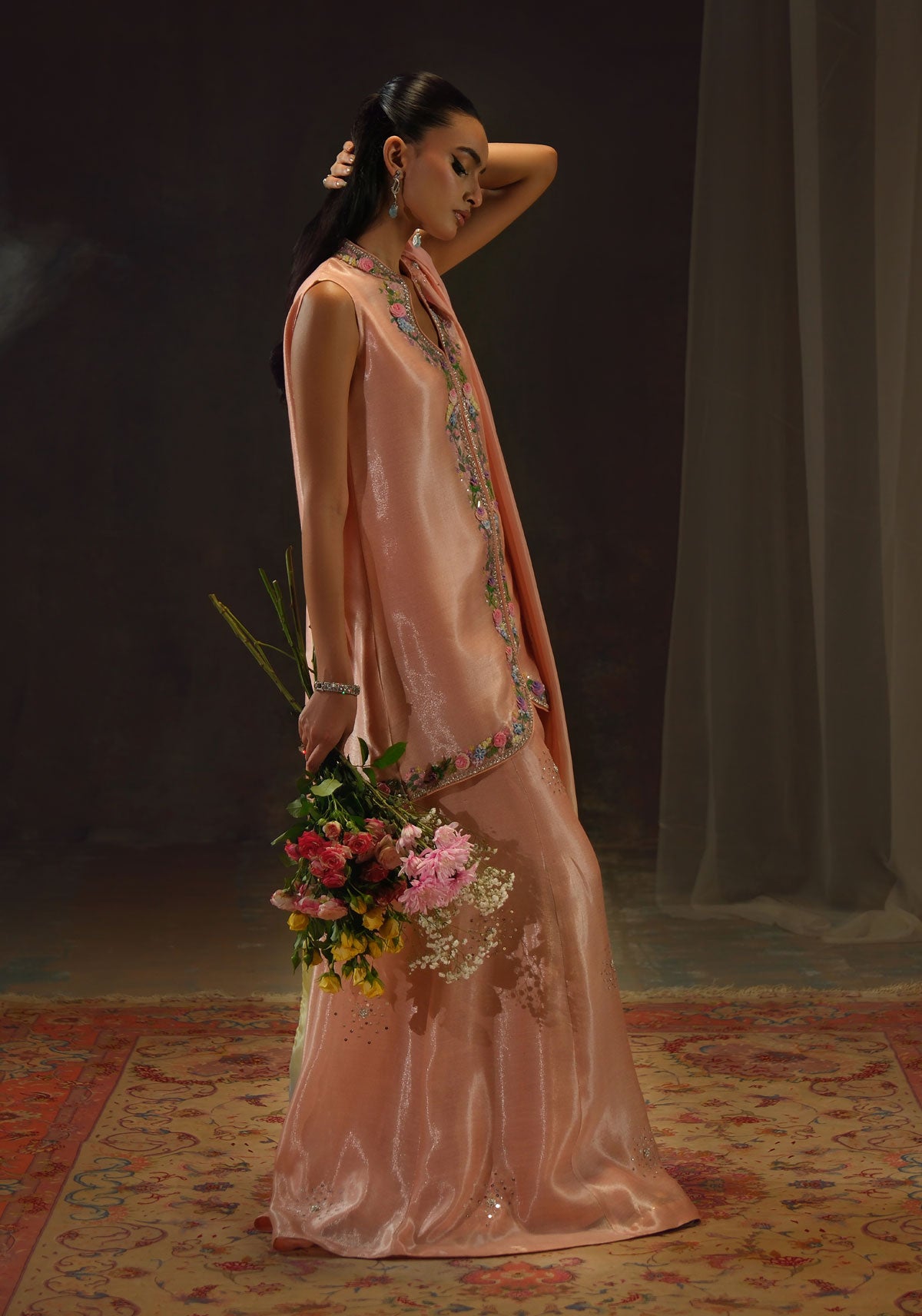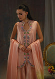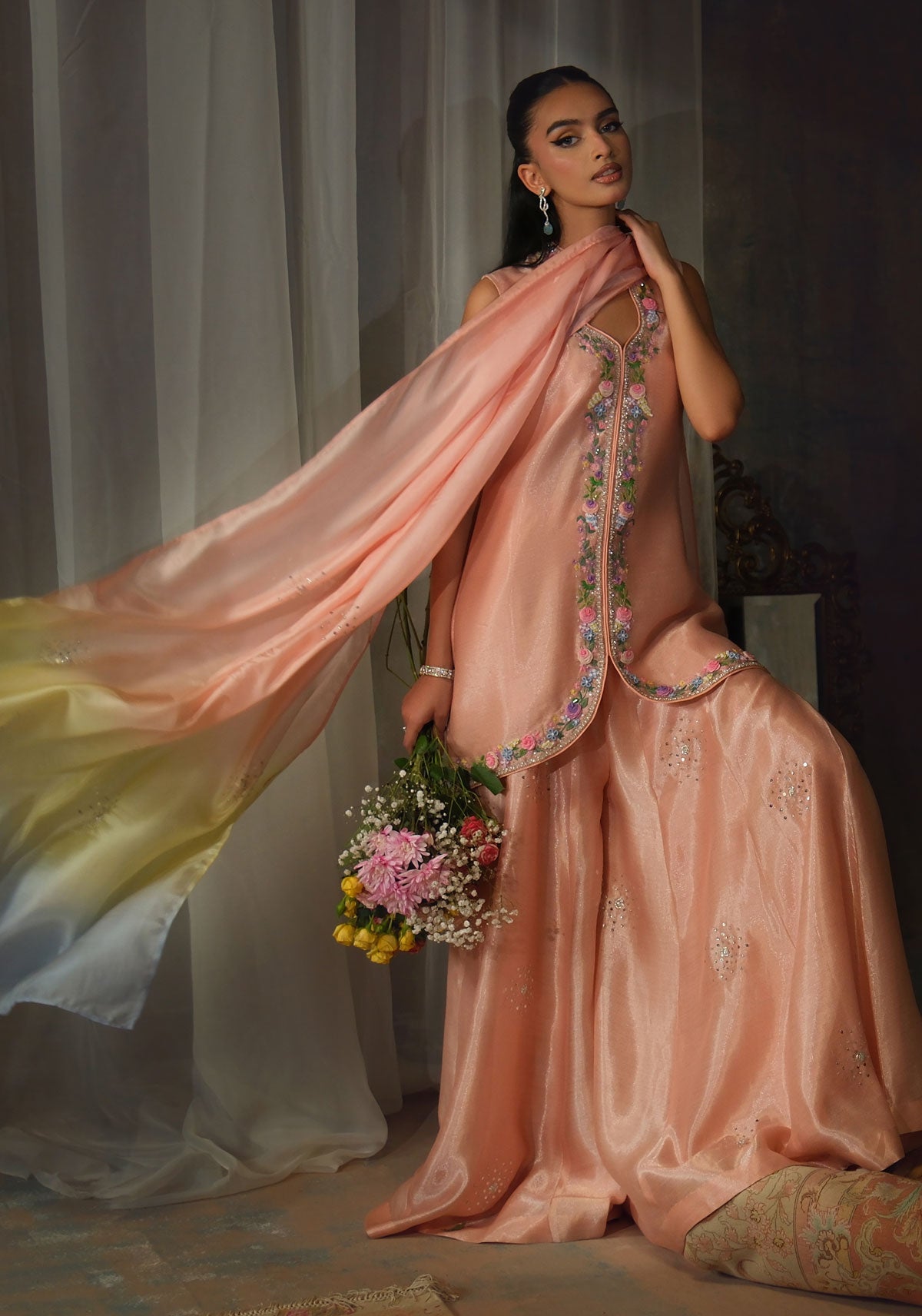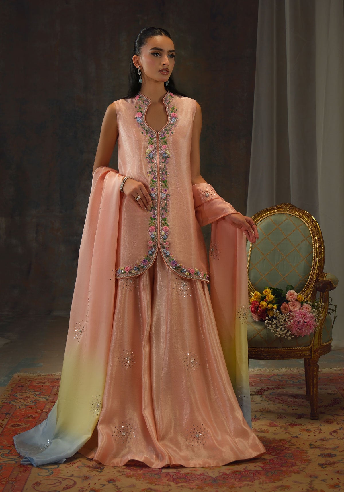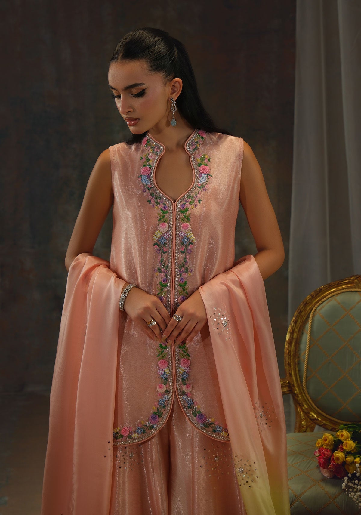 Tailored from shimmering zari net in a delicate peach hue, its surface catching the light with a subtle, ethereal glow. The jacket-style shirt features a scalloped front, richly hand-embroidered with French knot roses, trailing vines, and sequins that glisten with every movement. Paired with an embroidered flowing lehnga in matching zari net, the look is completed by a medium silk dupatta—ombre-washed with delicate sequence work. Feminine yet contemporary, this piece transitions effortlessly from daytime celebrations to evening elegance.