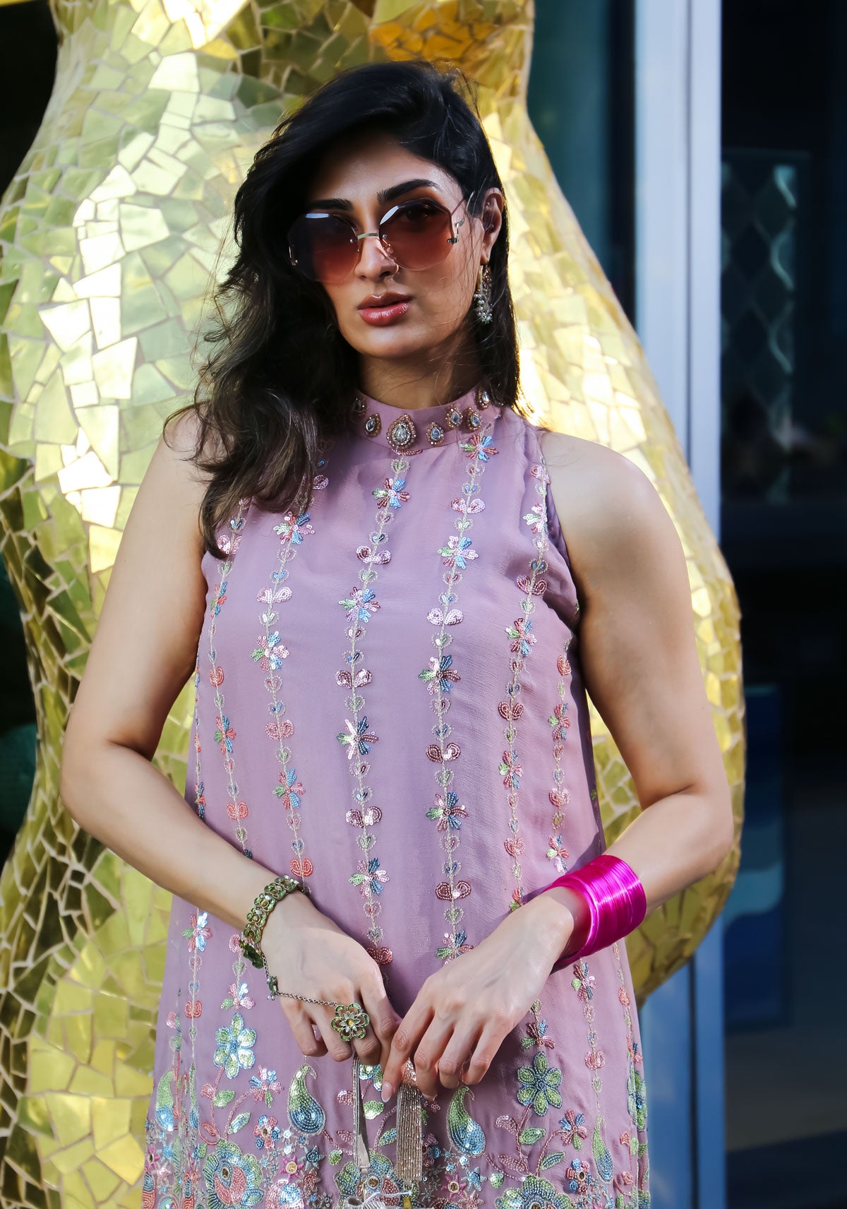 A stunning garment that exudes grace and refinement. Its pink blush hues evokes a sense of serenity, while the delicate floral pattern adds a touch of femininity and charm. This halter cut embellished shirt is a versatile piece that can effortlessly elevate any ensemble. The set includes chiffon halter cut shirt and embellished chiffon palazzo pants