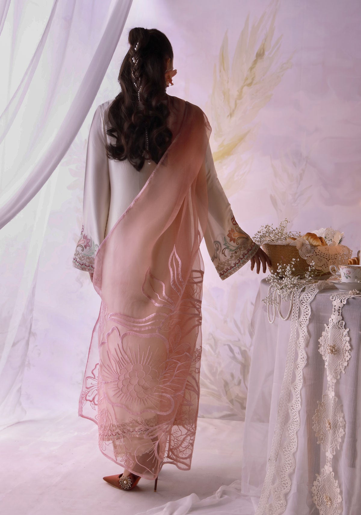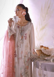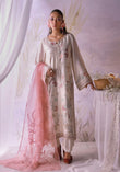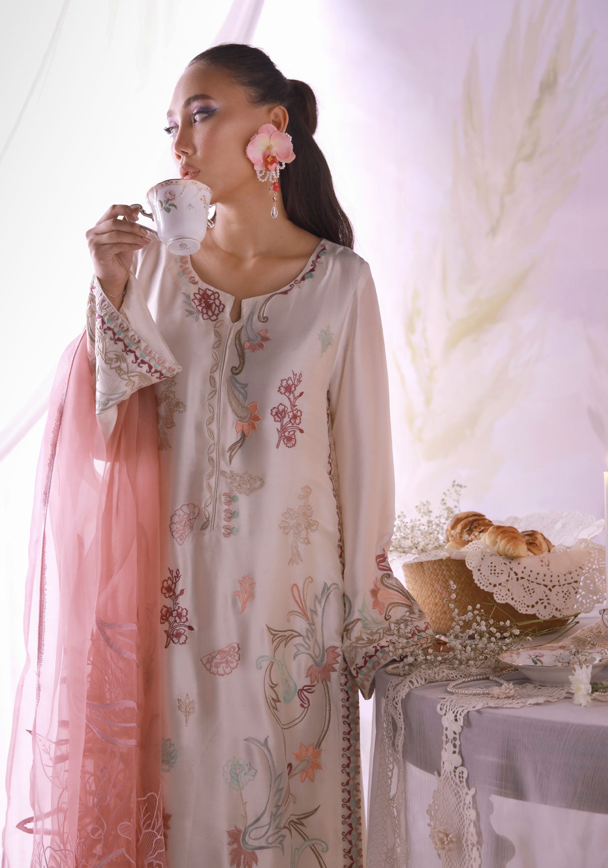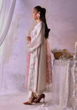 A timeless ivory classic reimagined! Crafted in pure butter silk with multicolored resham embroidery and soft detailing across the shirt. Paired with a lace-trimmed trouser and a pure organza dupatta embroidered in blush — a look that speaks effortless charm and quiet luxury.