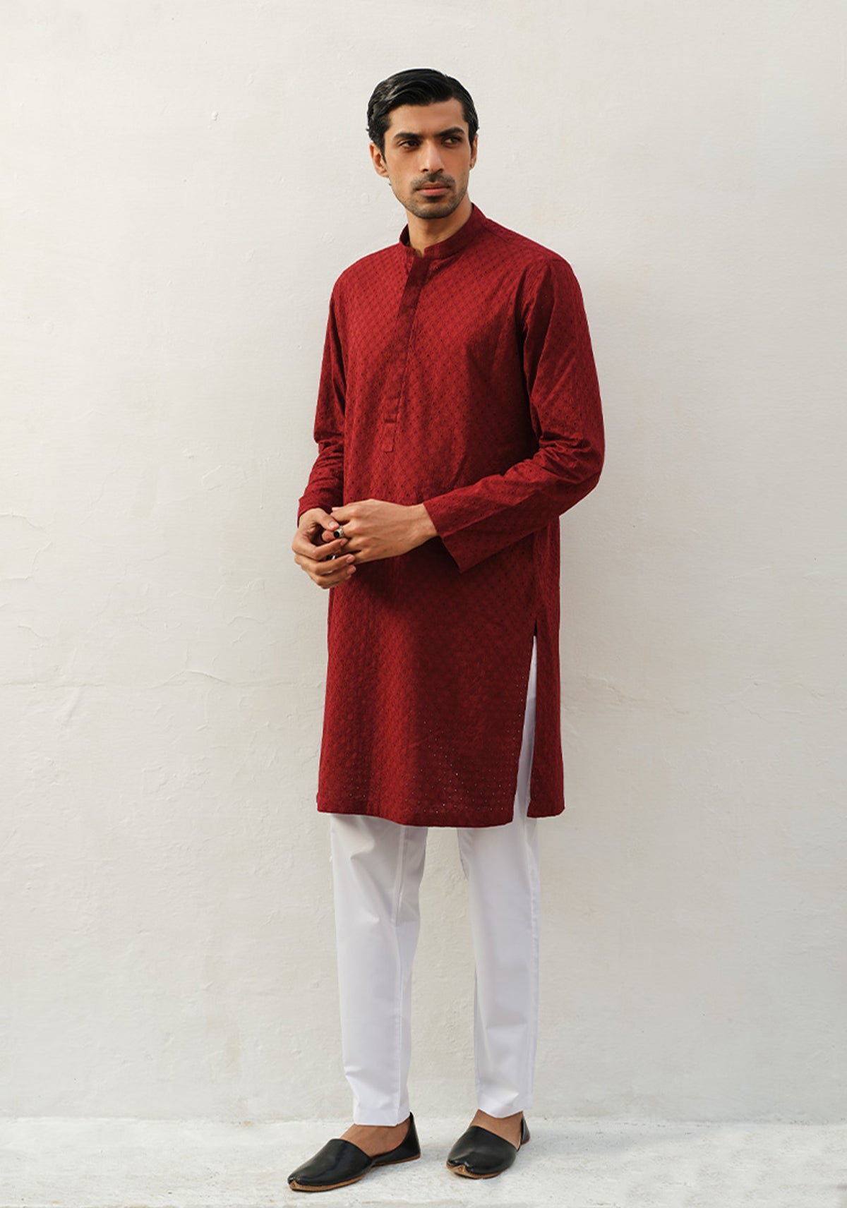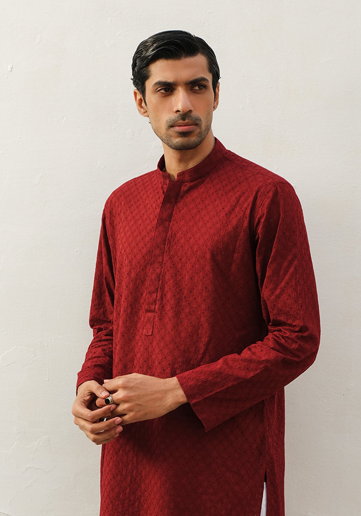 Brick red chickan-kari kurta and pajama set, with embroidered floral patterns, detailed with pleated band collar and hidden button closures.