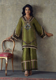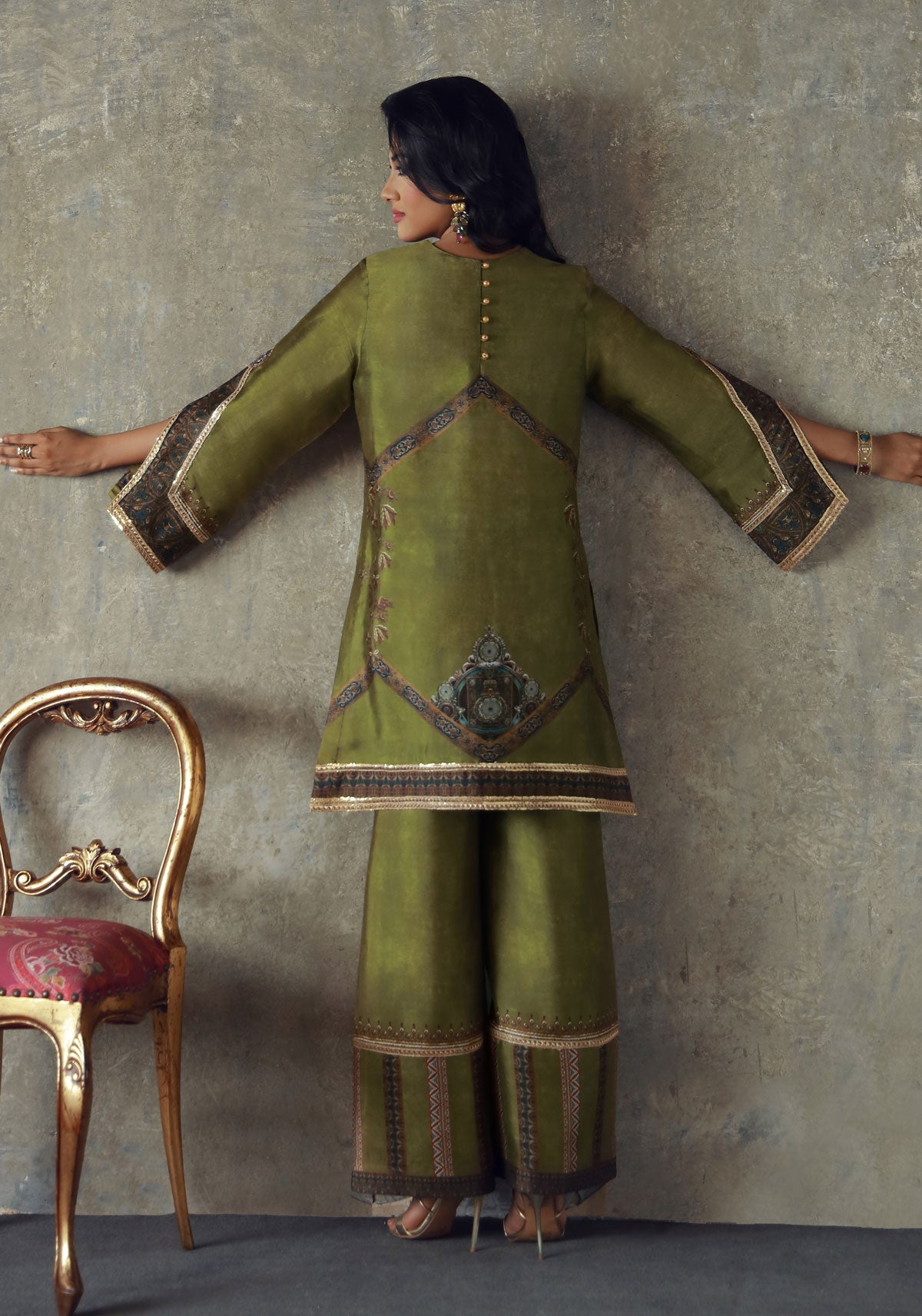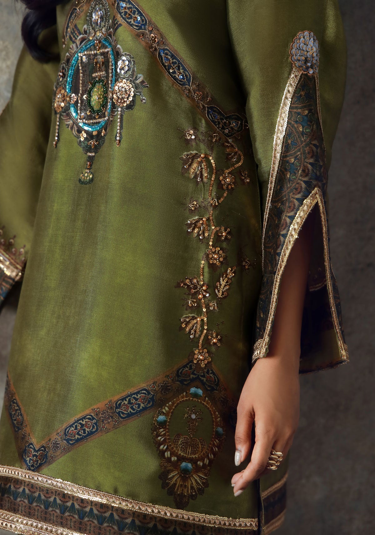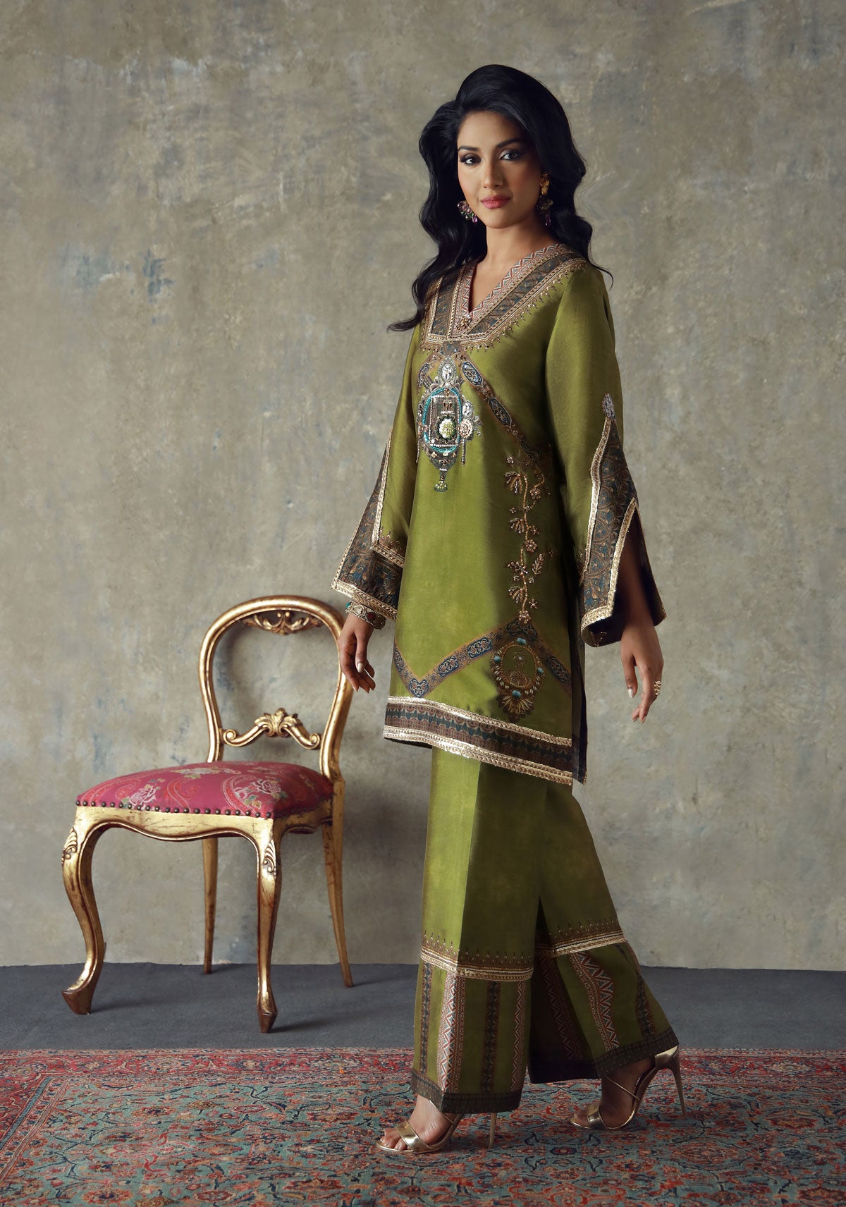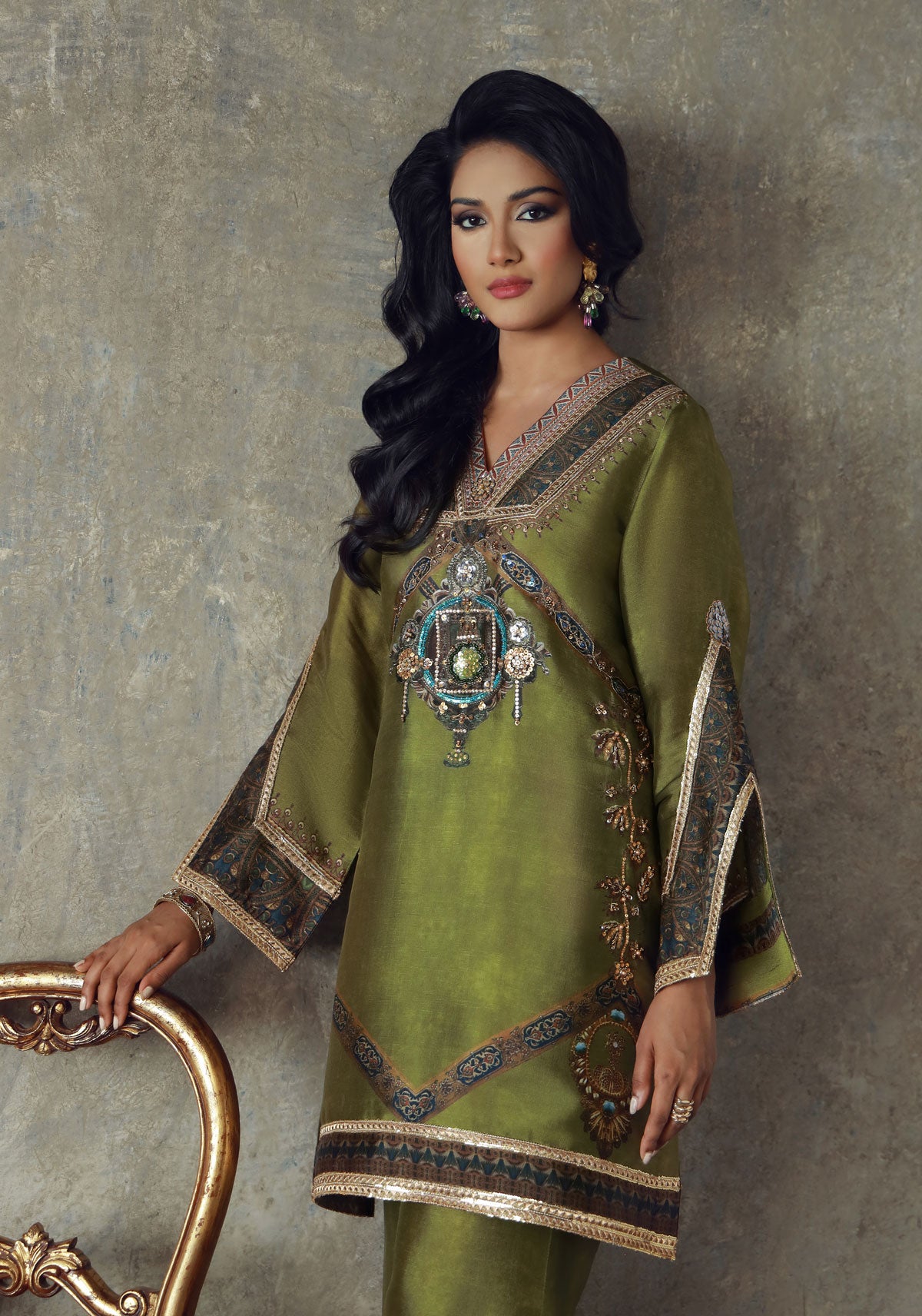 This Ensemble features Originally Shamaeel's print. The short tunic features intricate embellishments in gold and bronze tones, including detailed traditional embroidery and beadwork around the neckline, chest, cuffs, and hem. The design centers around a regal motif on the bodice, adding a touch of opulence. Paired seamlessly with wide-legged trouser featuring complementary accents. The Silhouette is classic yet sophisticated, embodying Shamaeel's signature fusion of cultural heritage and timeless elegance. Perfect for intimate soirées, cultural celebrations, or refined evening affairs.