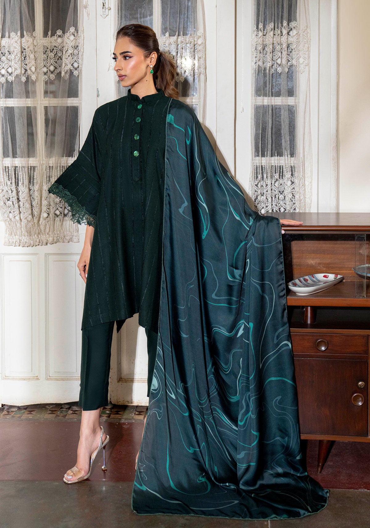 off white woolen with embroidered shirt and shawl (three piece set)