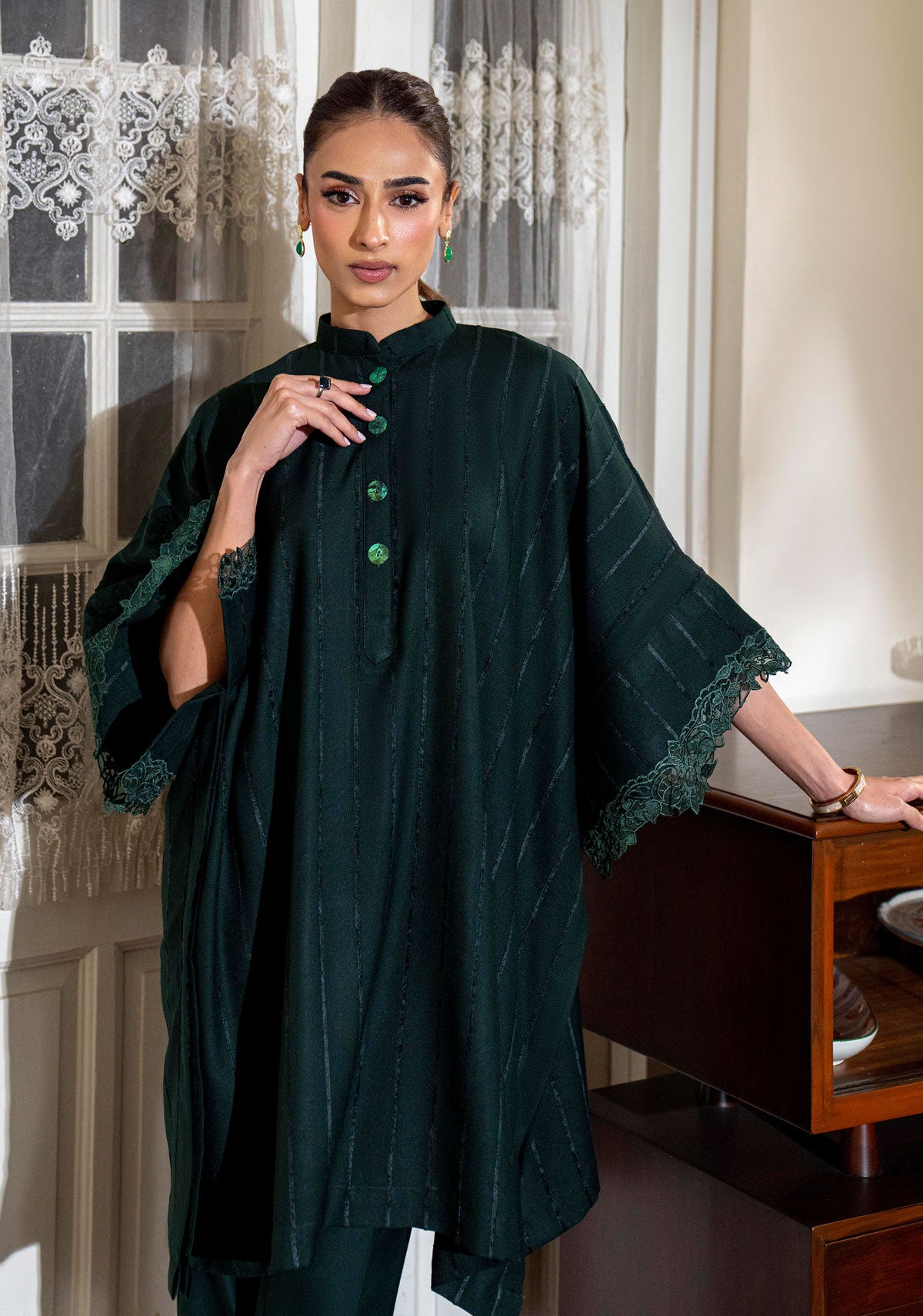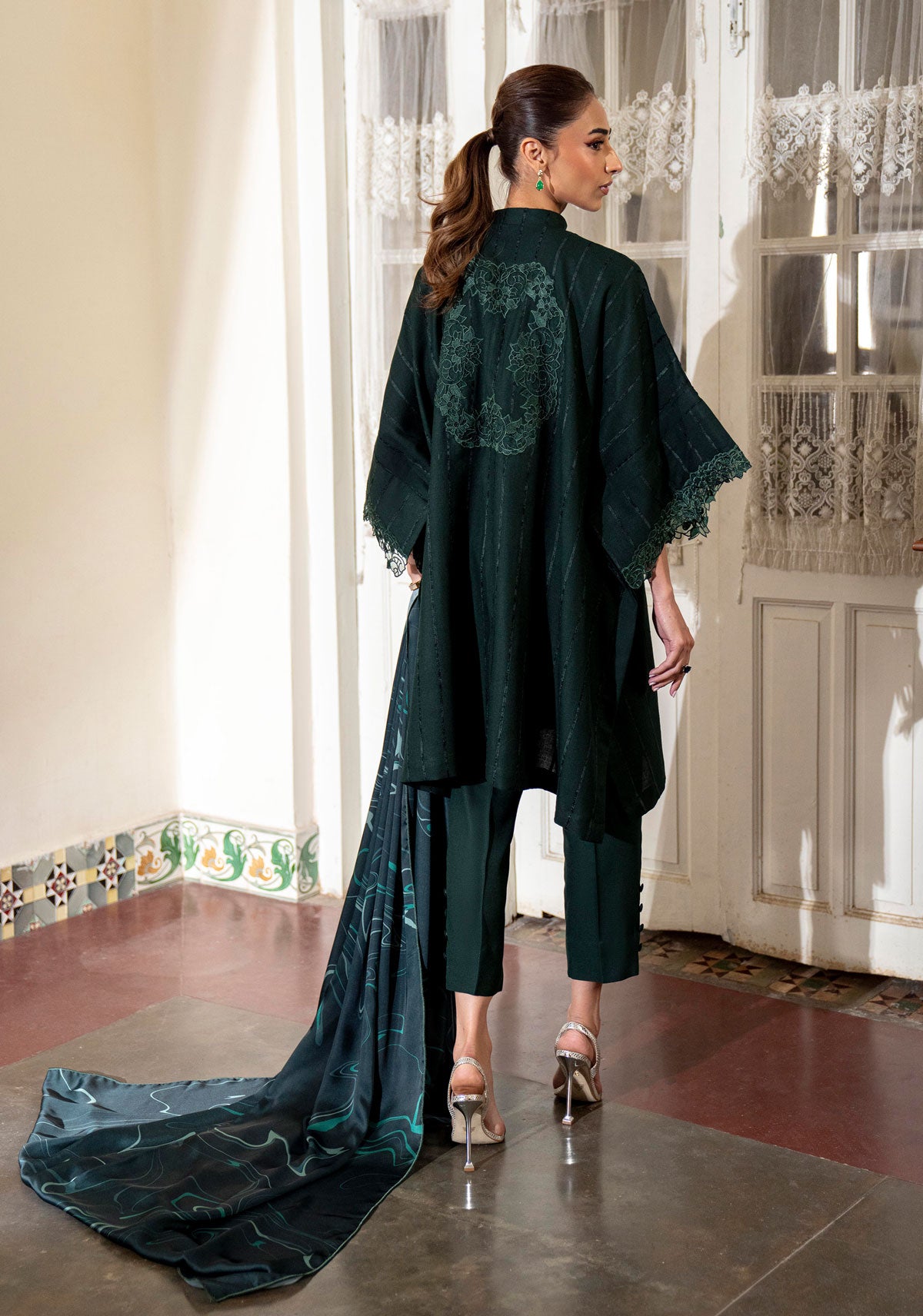 Classic decadence! this multani inspired colour combo in blue hued thread work lends a classically feminine mood to the ensemble. A midi length breezy silhouette crafted in woollen shawl and detailed with a unique embroidery along the chaak and sleeves. Wear it with flared trousers and our shawl with cascading embroidery for a timeless edit.