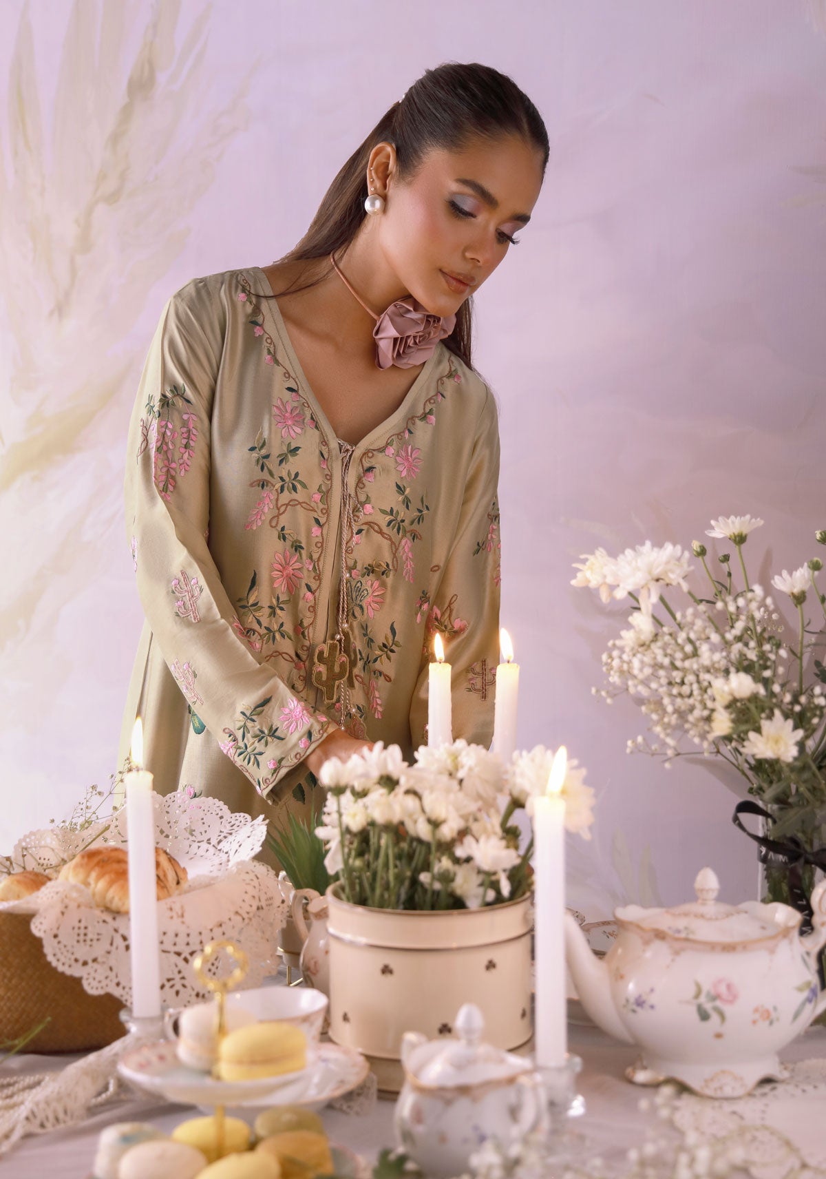 A whisper of summer in pure butter silk. Adorned with delicate floral embroidery in soft hues and finished with custom tassels that dance with every step. This kaftan is a celebration of quiet luxury and effortless grace — a piece made to be cherished season after season.