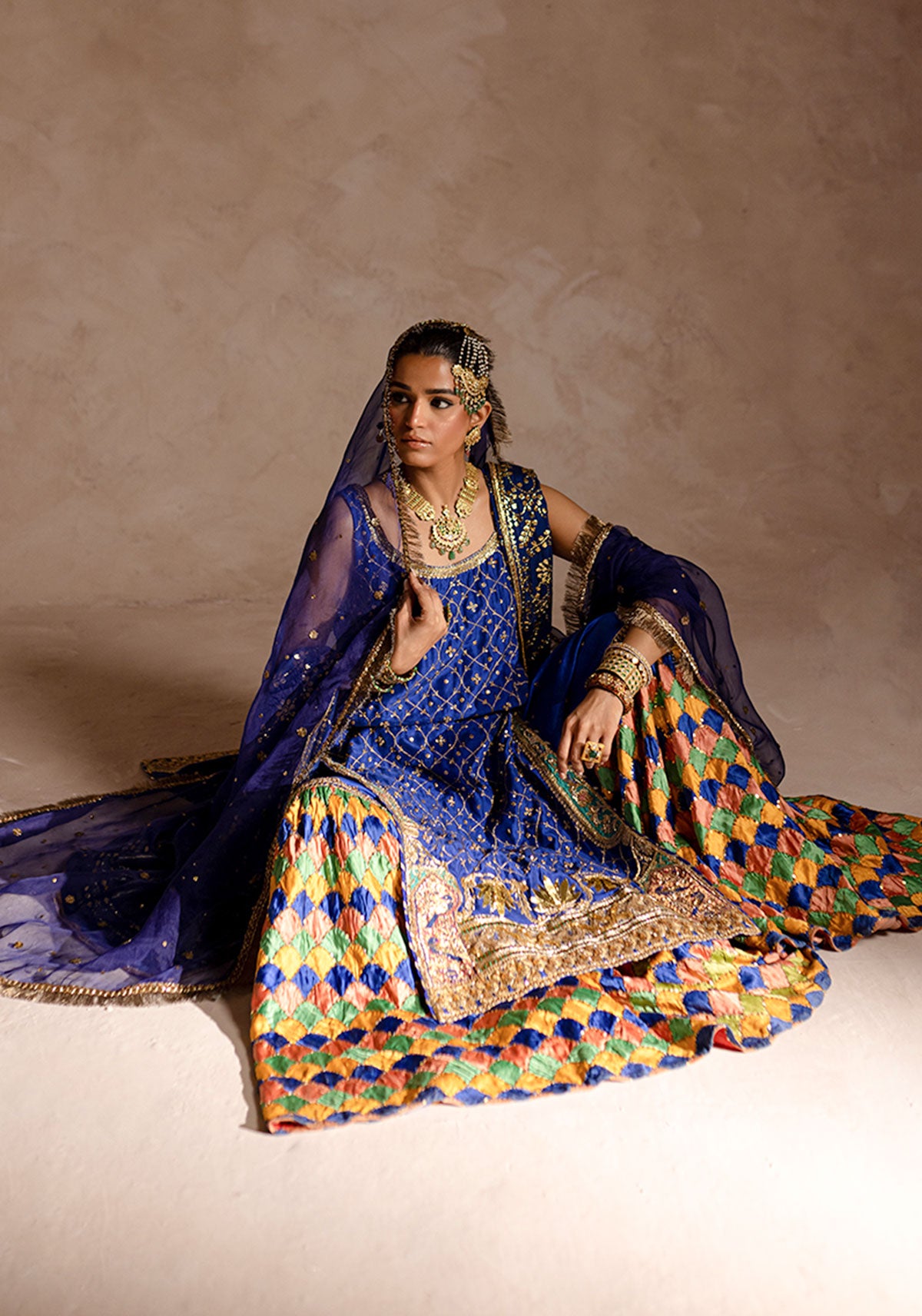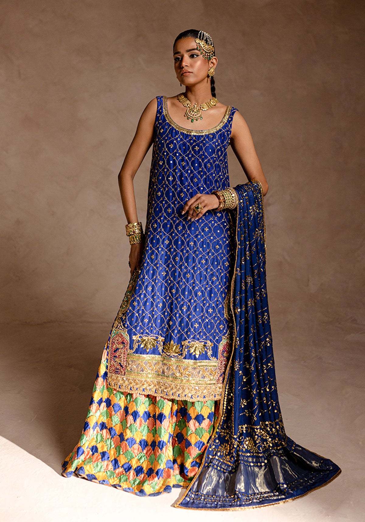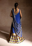 'This captivating ensemble is a stunning blue shirt, intricately hand-worked with dabka, tilla, sequins, mukaish, gotta and resham, creating a rich jaal that enhances its elegance. Perfect for making a grand impression at any special occasion.