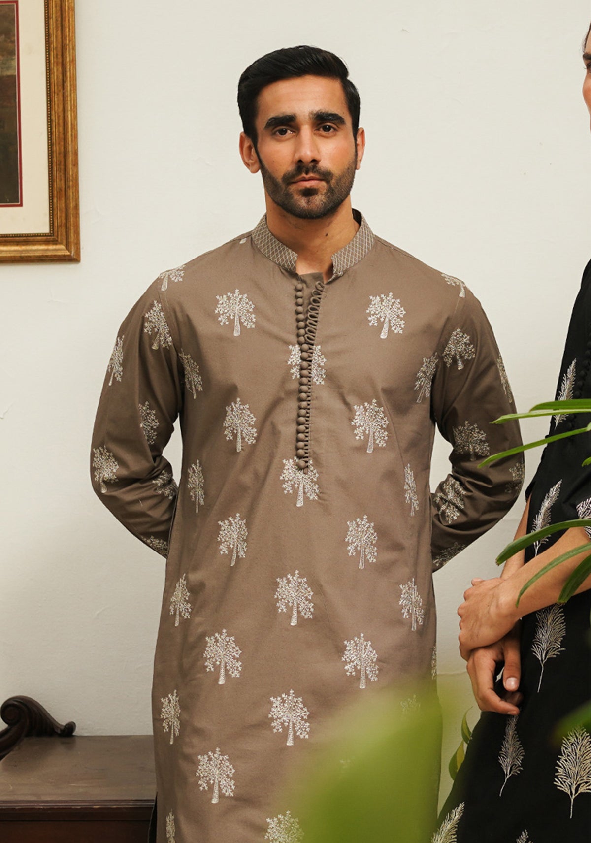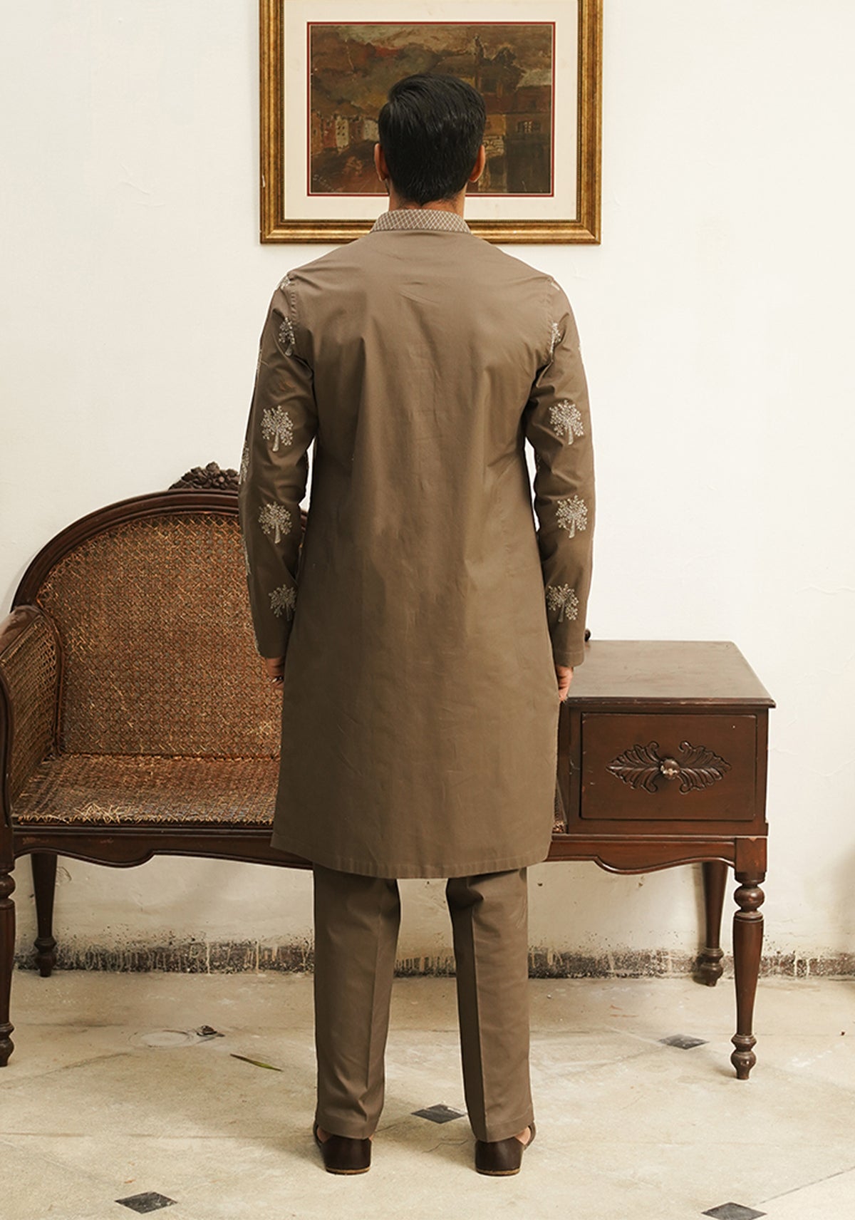 | Caramel brown cotton kurta and pajama set, with embroidered motif patterns with twisting technique and loop button closures. 100% Egyptian Cotton |
