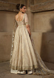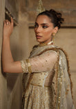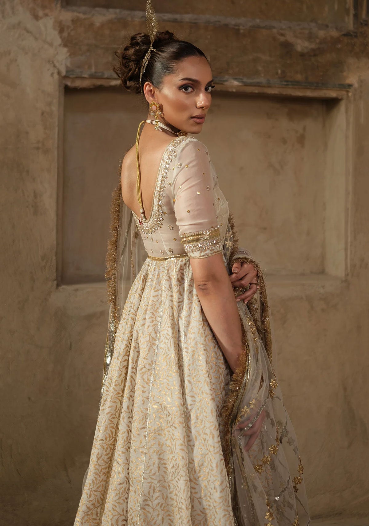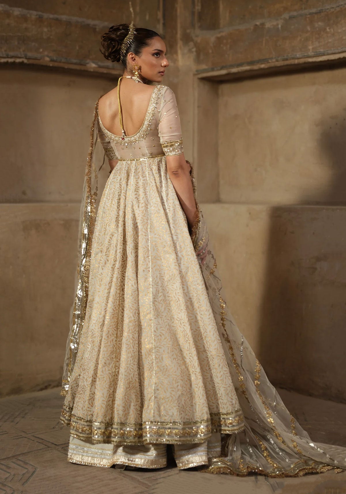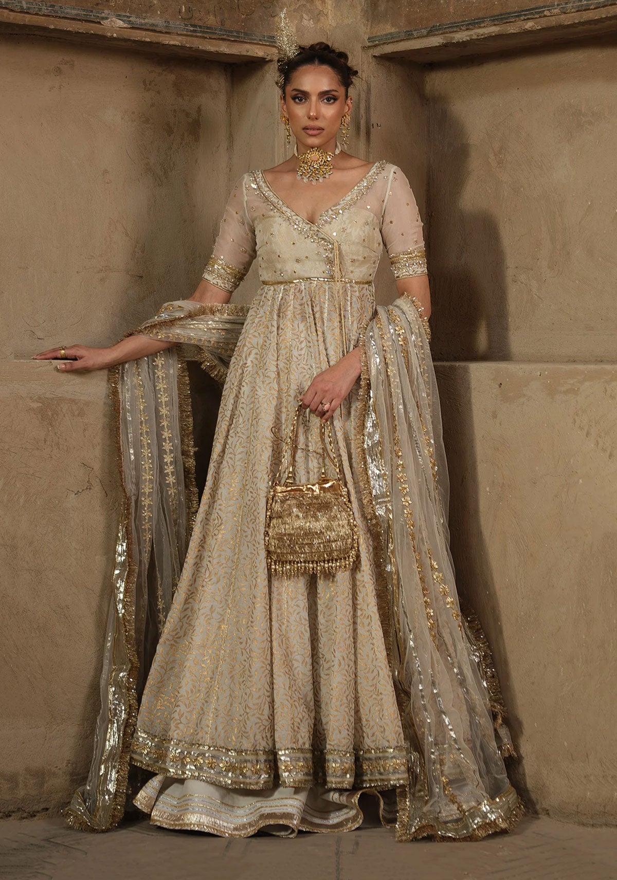 Cotton khadi net with block print and organza blouse and pk silk sharara.The outfit features a Cotton Khadi Net Pehswas with a luxurious Organza Blouse and a rich PK Silk Sharara. The pehswas has a flowing, textured look, while the organza blouse adds structure with intricate Dapka Zardozi embroidery around the neckline and sleeves. NOTE: Duppata price is not included.