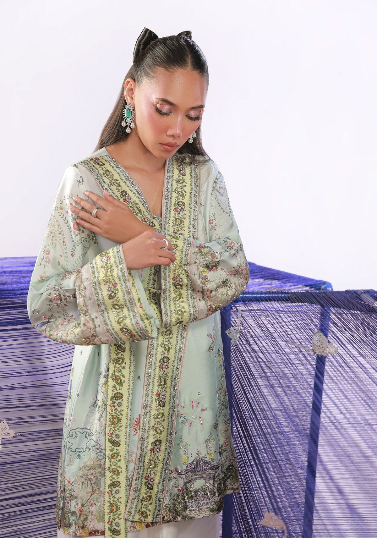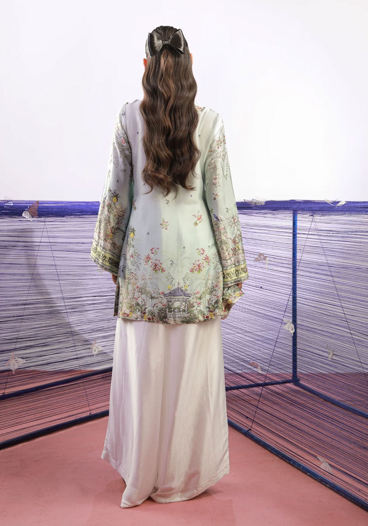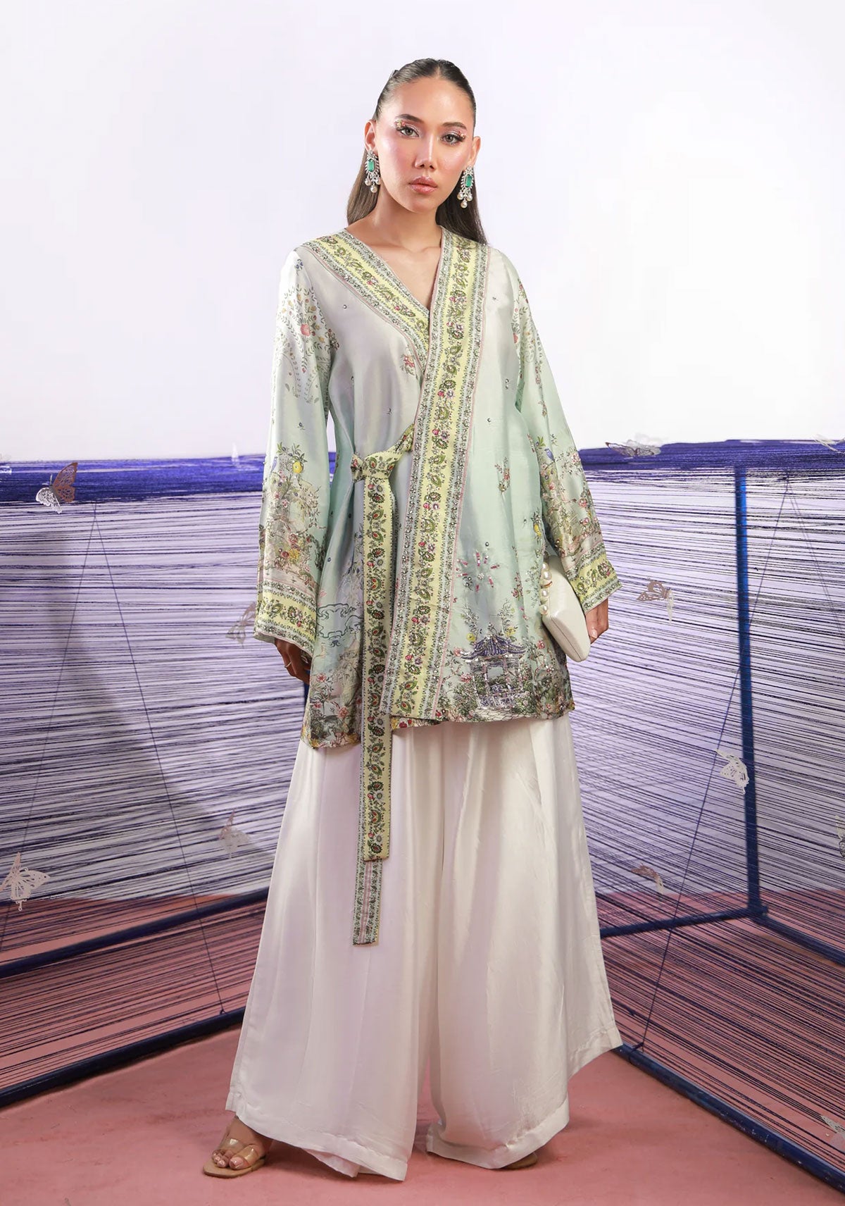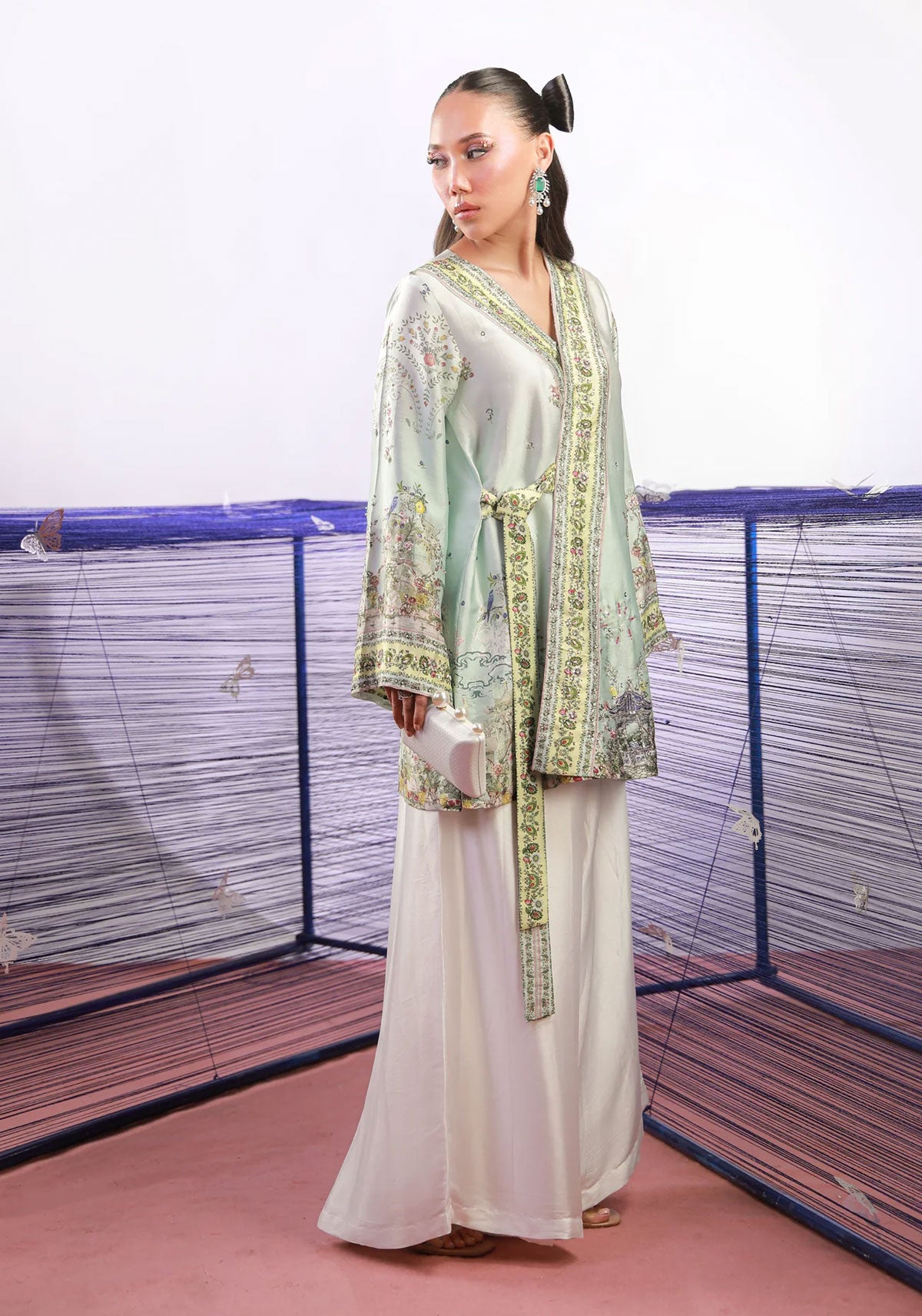 An elegant pure butter silk wrap, digitally printed with intricate motifs and highlighted with delicate hand-touch embellishments. The wrap-style shirt, cinched gracefully at the waist, creates a modern yet timeless silhouette. Paired with wide boxed silk pants for a flowing finish, this ensemble blends sophistication with effortless comfort—perfect for chic soirées and refined gatherings.