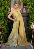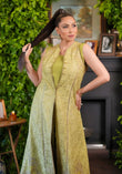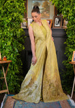 An elegant front-open gown featuring refined button accents, designed on a silk base with subtle self-sequins and intricate cutwork borders. Finished with sheer detailing and enriched with antique gold embellishments along the halter and trims, embodying the signature artistry of HSY couture.