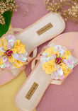 Step into spring with these whimsical chappals that celebrate color and texture! Featuring holographic round palettes in cheerful yellow and pink, each pair showcases a vibrant flower design with beaded and cut pipe details in green and hot pink at the center. The snake skin textured holographic peach rexene upper adds a playful shimmer, while the pearly white soft rexene insole keeps your feet cozy. Lightweight and cushioned with a crepe sheet sole, these chappals blend festive flair with everyday comfort—perfect for adding a splash of joy to your seasonal wardrobe.