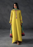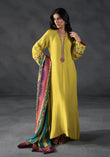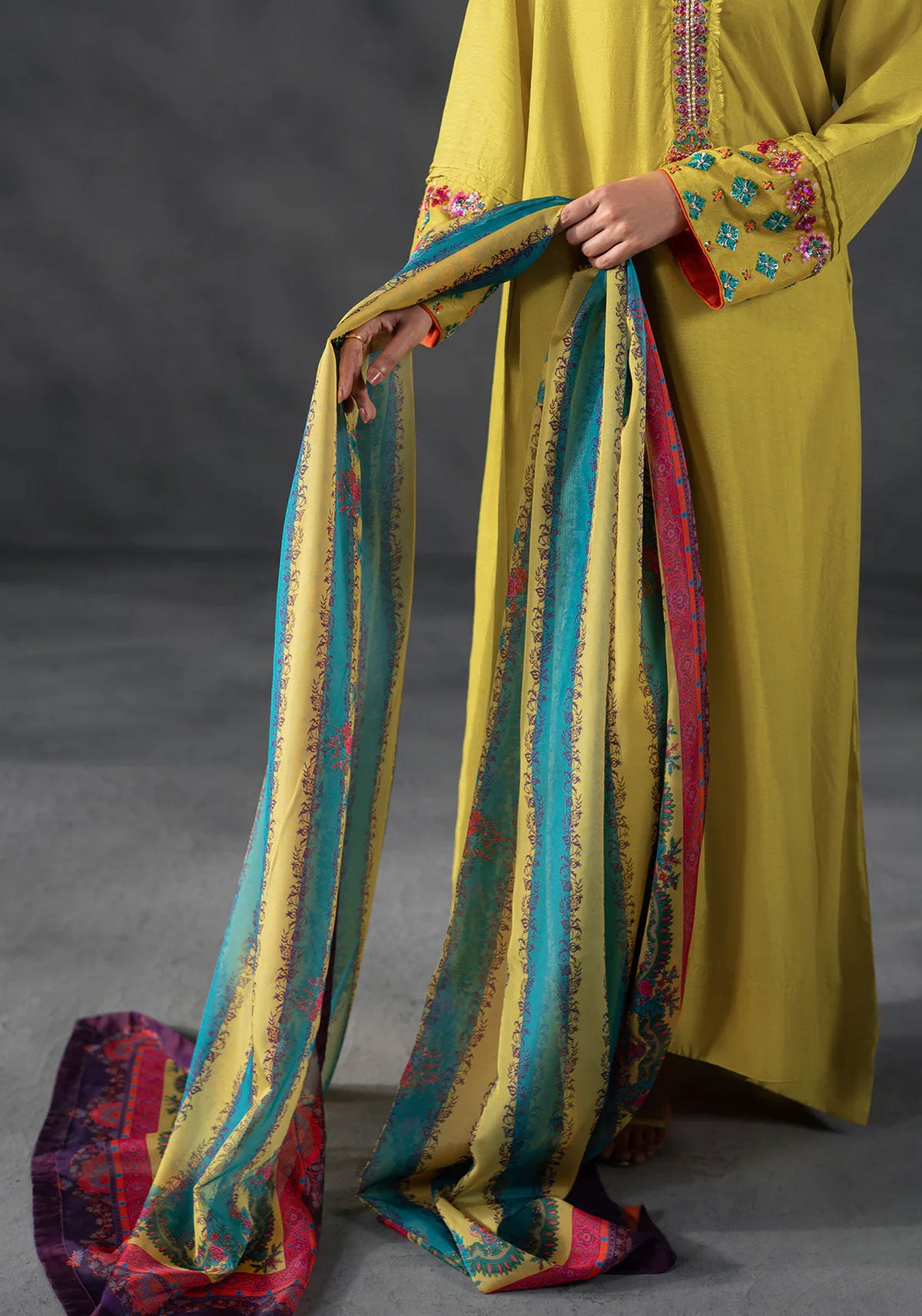 Radiate charm in this stunning yellow ensemble, adorned with multi-colored sequin detailing and crystals for a touch of sparkle. Designed in a graceful long A-line silhouette, it is paired with a contrasting AK print dupatta that adds a vibrant edge. A beautiful choice for wedding festivities all year round. Straight pants complete the look.