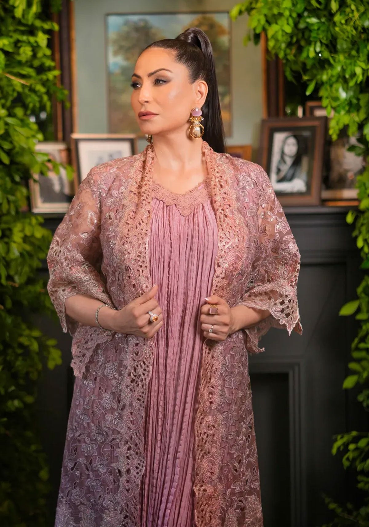 A delicately crafted organza cutwork jacket, defined by scalloped hems and intricate sleeve detailing, with embellishments gracing the front and arms. Paired with a crushed silk inner, elevated by a finely embellished lace neckline, a statement of timeless HSY sophistication.