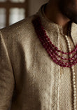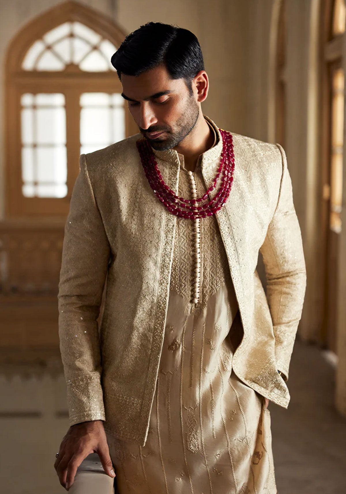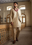'Beige, self-jamawar bandh gala suit, with embroidered geometric and floral patterns, detailed with sequins and tilla adda work on hem and band collar.