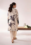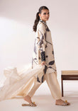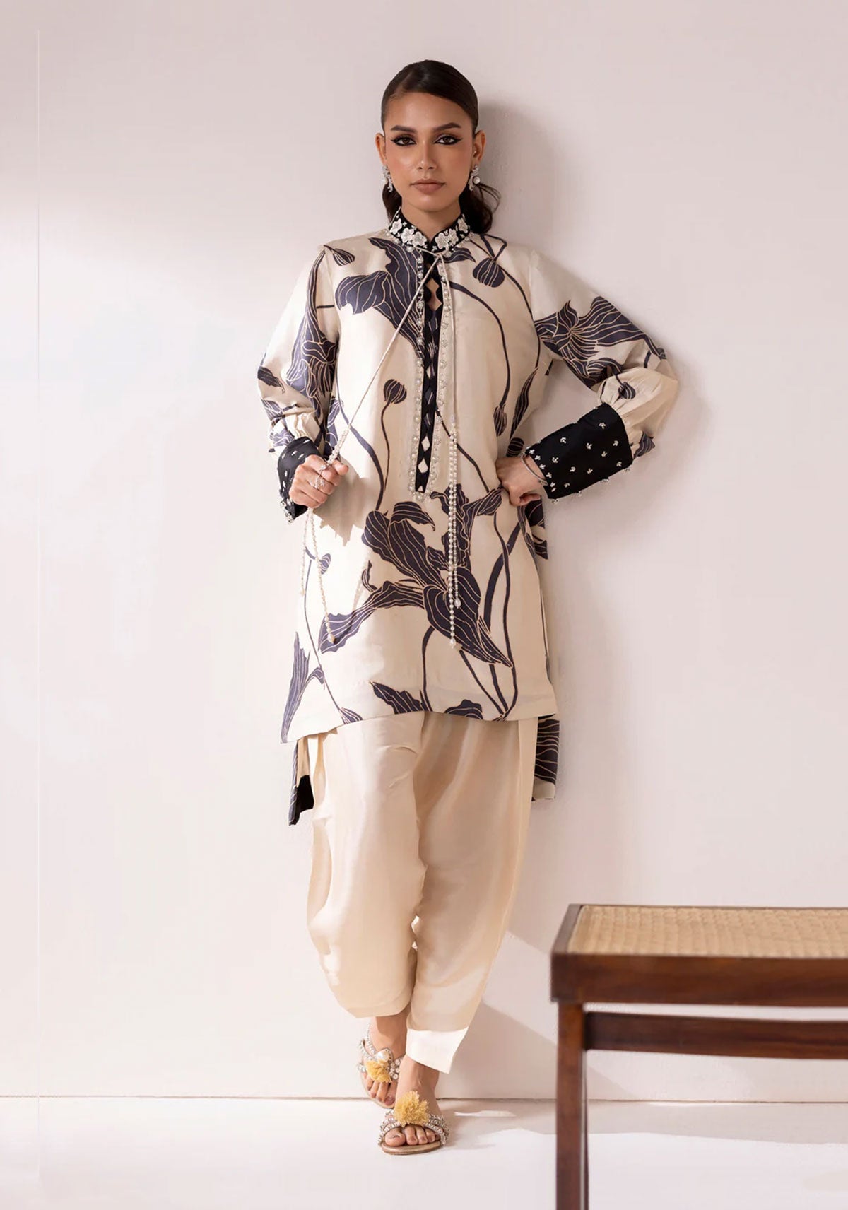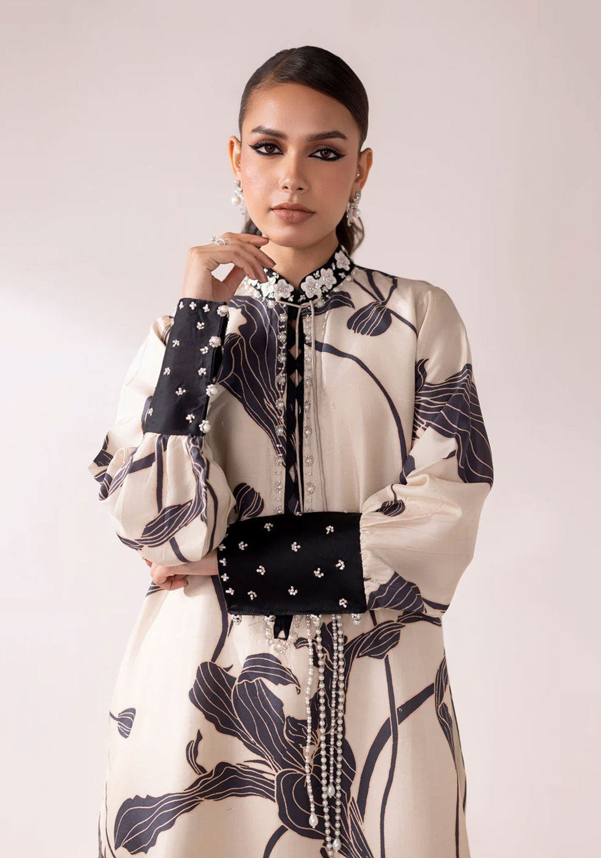 Jehan, in a delicate shade of beige, features deep-toned floral prints on luxurious 60-gram pure silk, creating a soft yet striking visual contrast. The neckline is richly adorned with floral motifs, heavily embellished with pearls, shimmering stones, and beaded threads that add a refined sparkle.