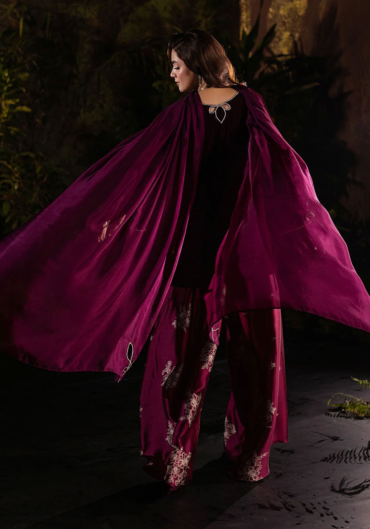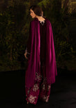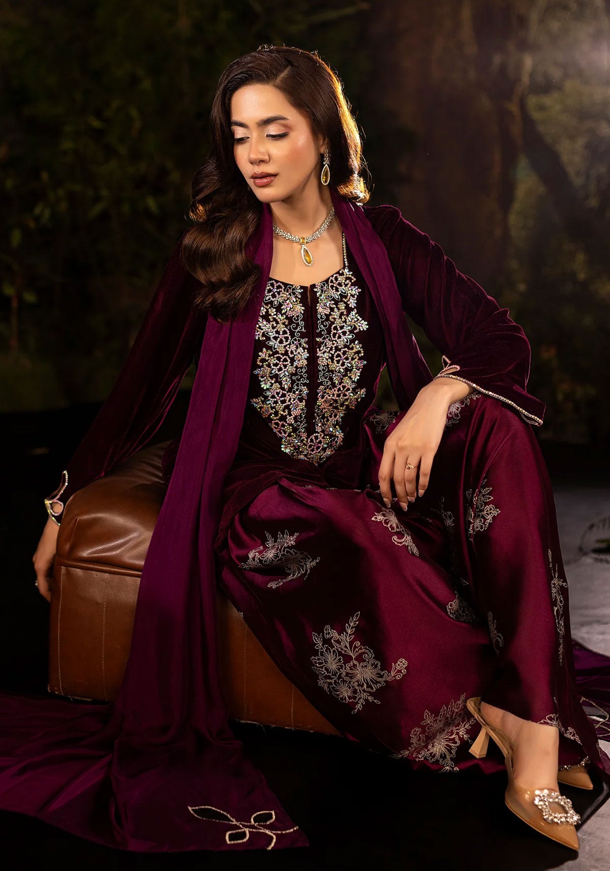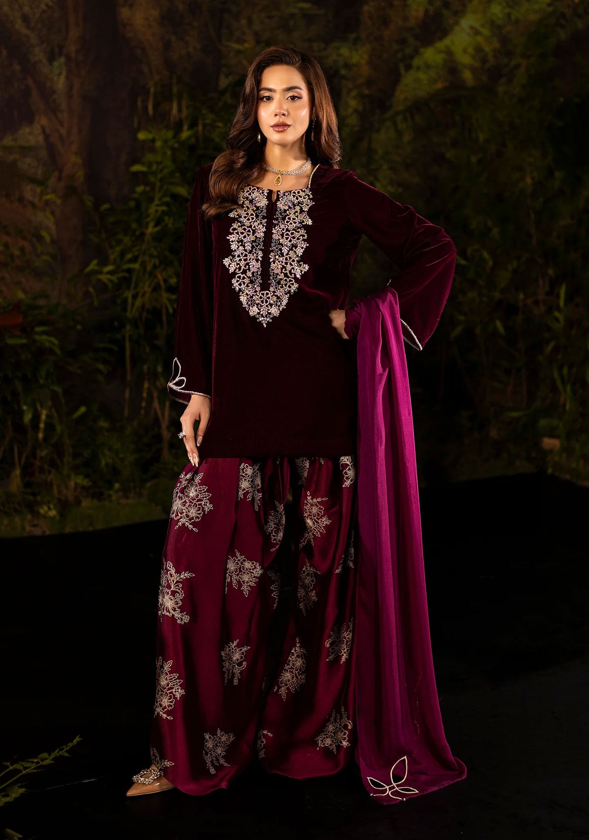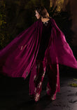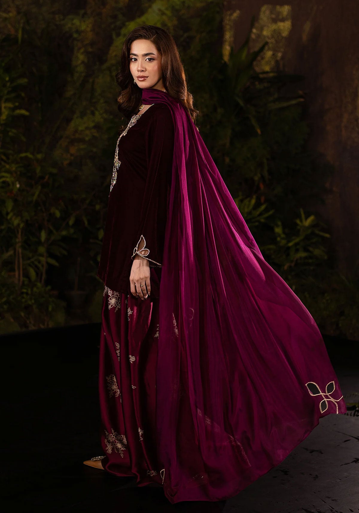 A statement in opulence, this plum velvet ensemble exudes regal charm. The rich velvet base is elevated with a lavish diamanté-embellished neckline, intricately crafted into floral vines that cascade down the bodice with luminous precision. The three-quarter sleeves are finished with delicate cut-out detailing edged in crystals, adding a contemporary twist to its classic silhouette. Effortlessly balancing tradition and modern glamour, this outfit is perfect for evening gatherings where elegance must shine with subtle sparkle.