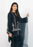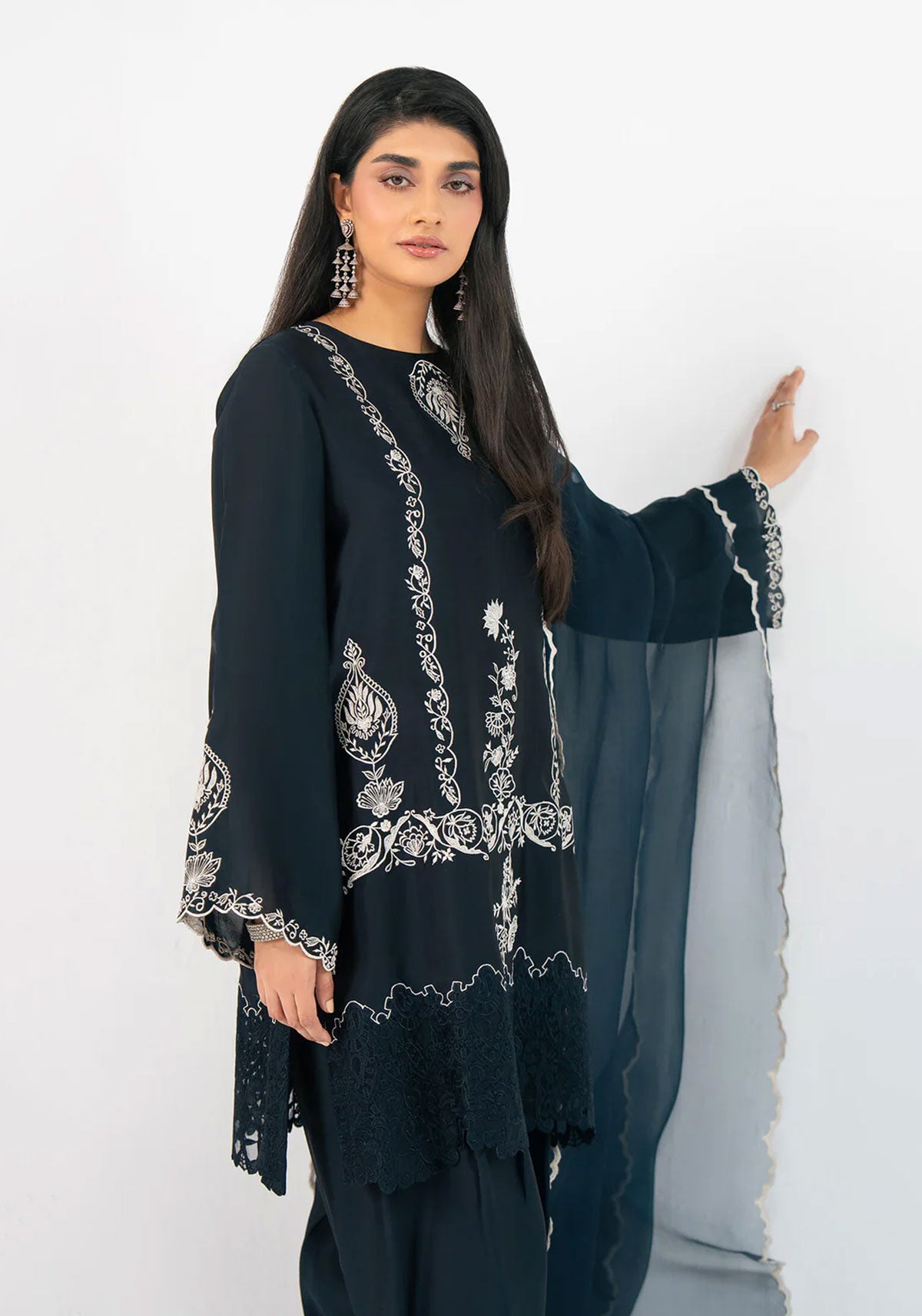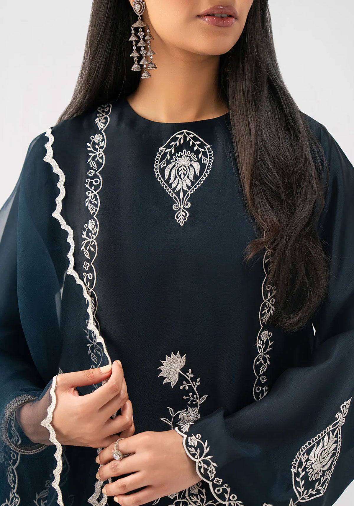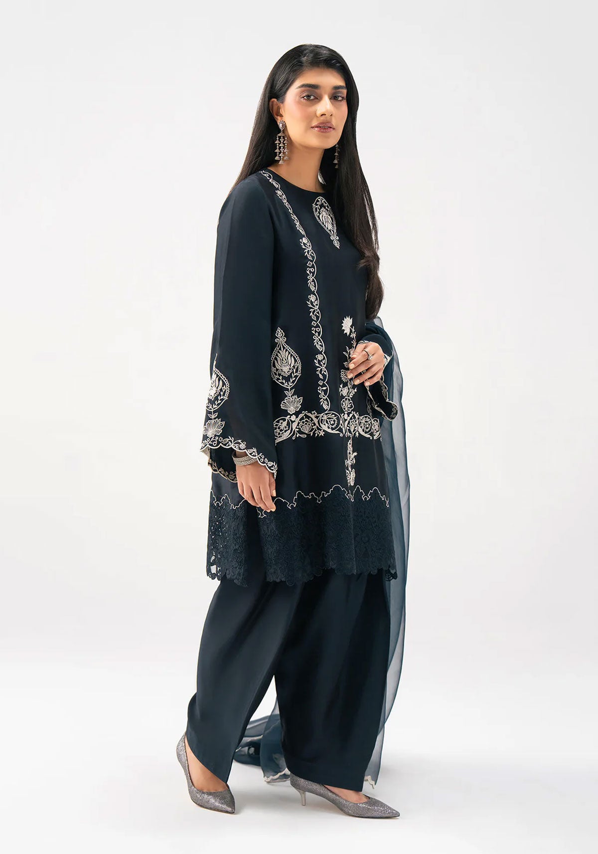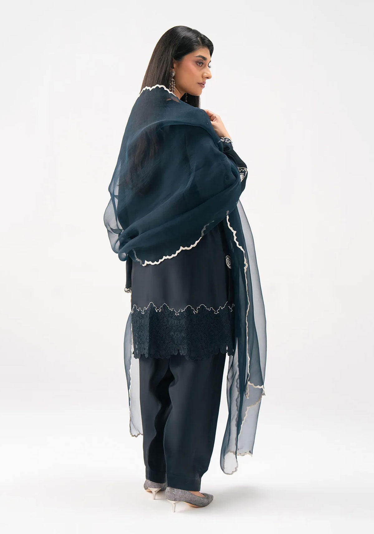 An exquisite navy blue ensemble in sheesha silk, featuring a heavily embroidered shirt paired with a classic shalwar. The pure organza dupatta is adorned with delicate embroidered scallops, making it the perfect complement to this richly detailed outfit. A timeless piece that blends traditional craftsmanship with contemporary charm.
